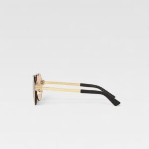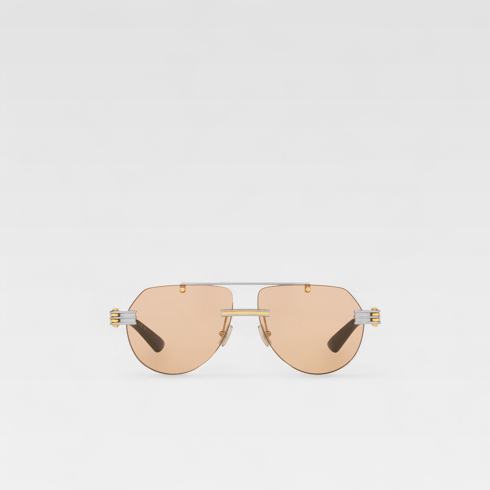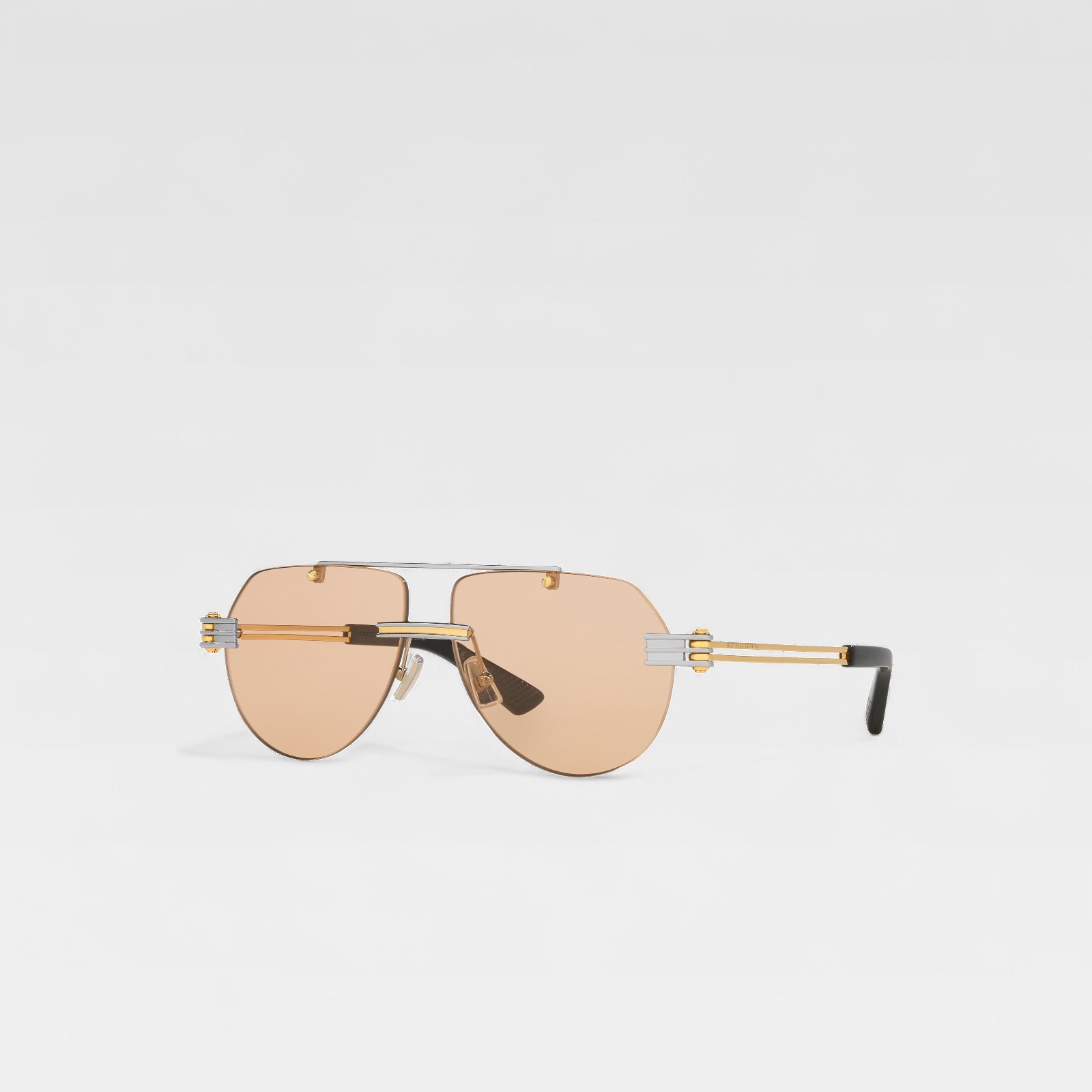 An aviator with a contemporary twist. This Bottega Veneta design features light brown lenses in aviator format, with no visible frame, giving it a minimalist, lightweight feel. The gold and silver-tone metal double bridge reinforces the structure, while the dark acetate temples ensure comfort. The side metal details with the distinctive design of the house add a sophisticated and recognizable stamp.