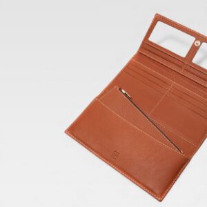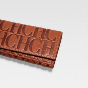 Functional design with graphic character. This Carolina Herrera wallet is crafted in tan leather with grained texture and features the “CH” monogram embossed all over the exterior surface. Its foldover format offers multiple compartments for efficient organization and refined aesthetics. Includes a removable interior zippered coin pouch for those who value both order and style.