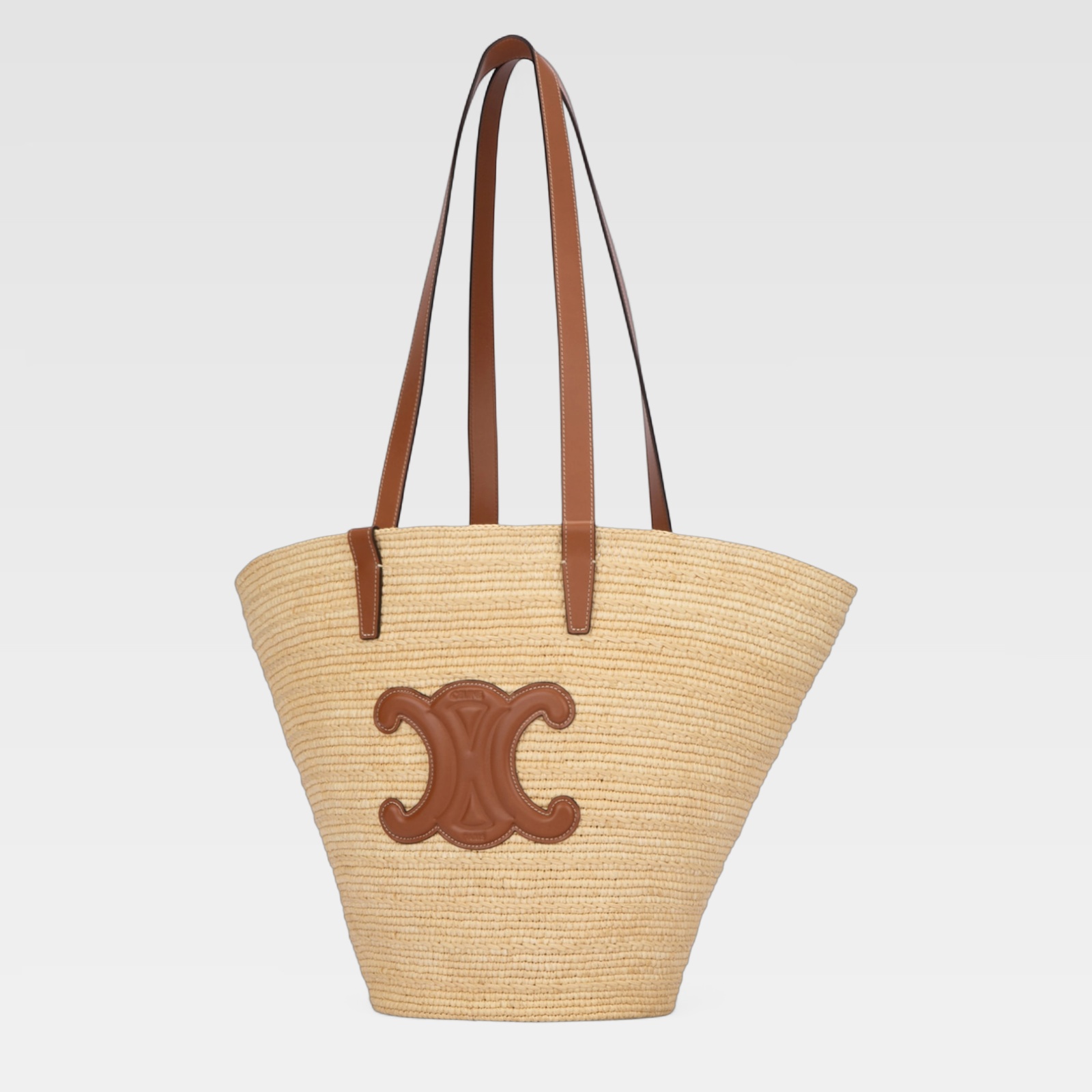 Bolso tipo tote realizado en rafia trenzada con asas largas de piel marrón y un distintivo logotipo decorativo de piel en la parte frontal. Su diseño amplio y estructurado lo hace ideal para llevar al hombro y transportar lo esencial con estilo casual y sofisticado.