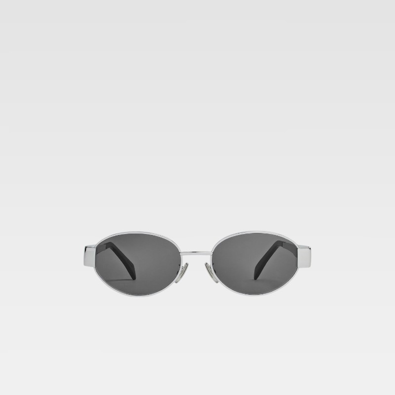 Sophisticated minimalism with a French stamp. The Triomphe 01 Celine sunglasses feature silver-tone metal frames and a clean design with sleek, straight lines. The dark gray smoked lenses offer full UV protection and a modern, timeless look. The distinctive detail: the Triomphe logo discreetly engraved on the temples, a symbol of the quiet elegance of the house of Celine.
