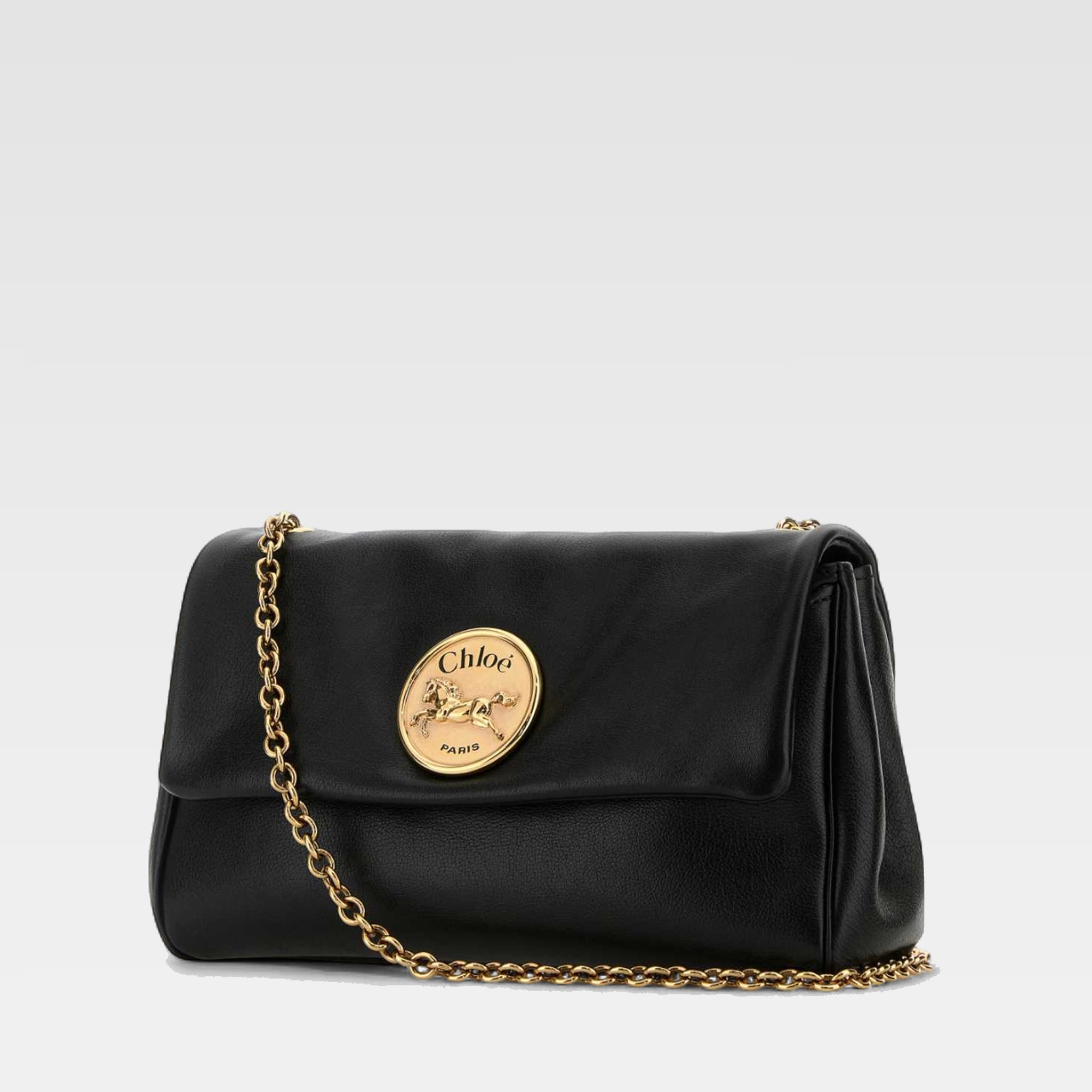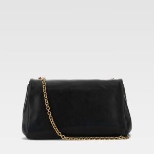 This bag stands out for its elegant silhouette with smooth lines, made in black material with a front flap. The gold-tone medallion in the center adds a distinctive detail, accompanied by a gold-tone metal chain that allows it to be worn over the shoulder with sophistication.