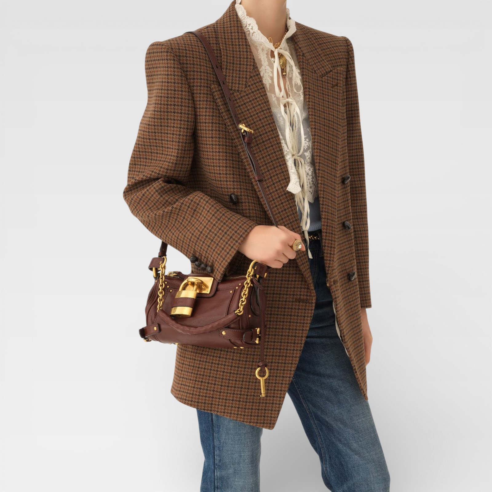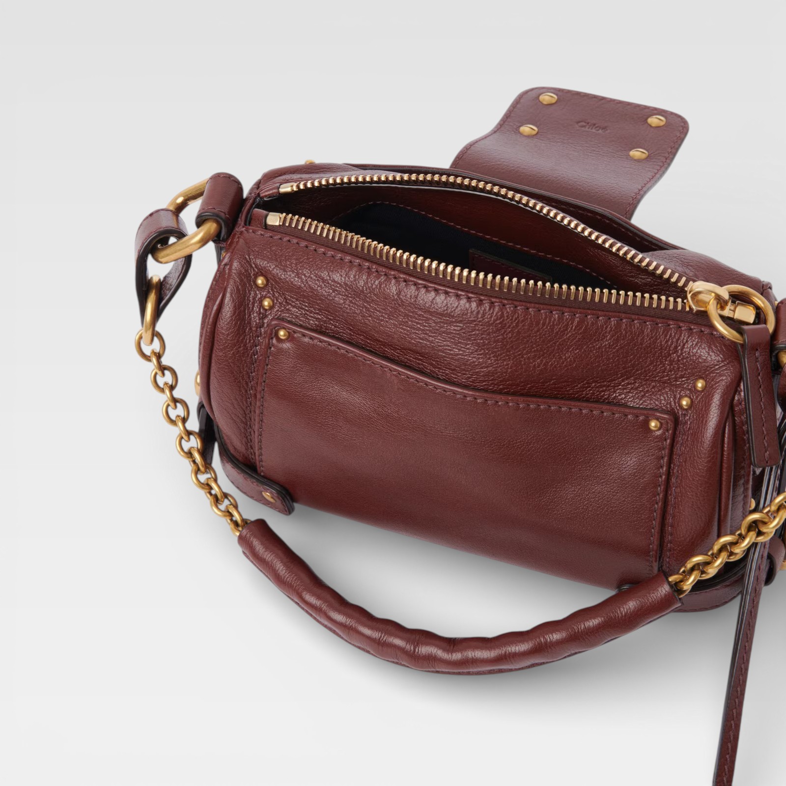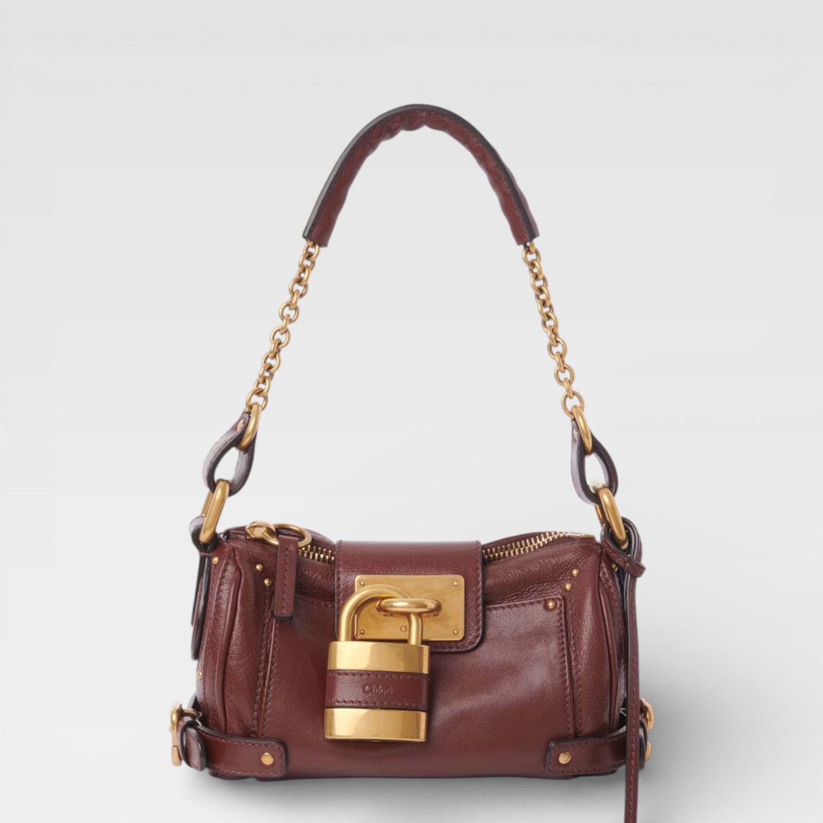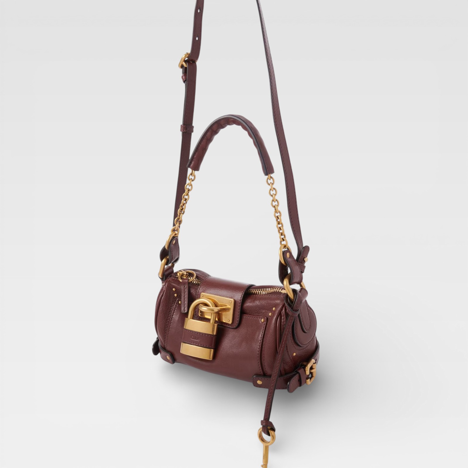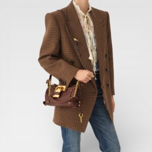A classic reinterpreted with distinctive details. This Mini Paddington from Chloé is crafted in softly textured reddish-brown leather, with antiqued gold hardware that enhances its character. The front metal padlock, emblematic of the Paddington line, adds presence, while the adjustable long strap and short link handle allow for multiple ways to wear it. The lined interior and external back pocket offer functionality without sacrificing style.