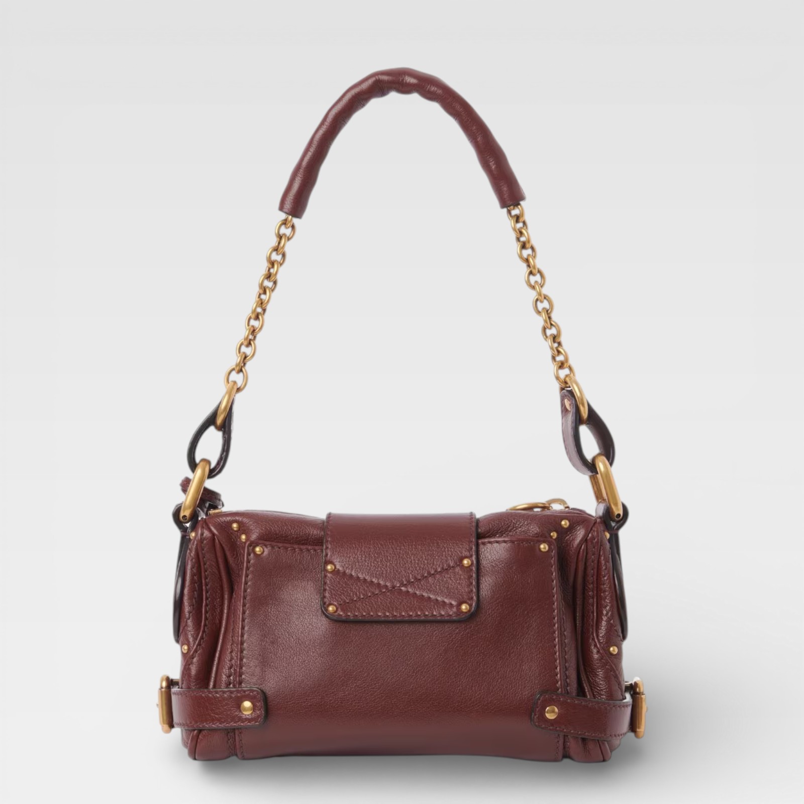 - Short handle with gold-plated chain and leather reinforcement
