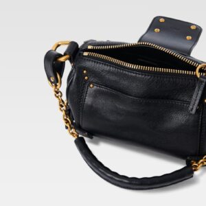 An iconic design reinterpreted on a mini scale. Chloé's Mini Paddington bag is crafted from softly textured black leather with gold-tone metallic details that reinforce its character. Its compact silhouette includes a short top handle with chain links and an adjustable strap for cross-body carry. The main protagonist of the design is the central golden padlock, a recognizable signature of this classic line of the maison.