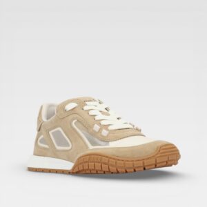 These sneakers feature a sleek combination of beige suede and translucent mesh panels, with a low-cut design and caramel-tone rubber sole. Understated details and a modern silhouette add a contemporary touch, while white laces complete the shoe's refined urban style.