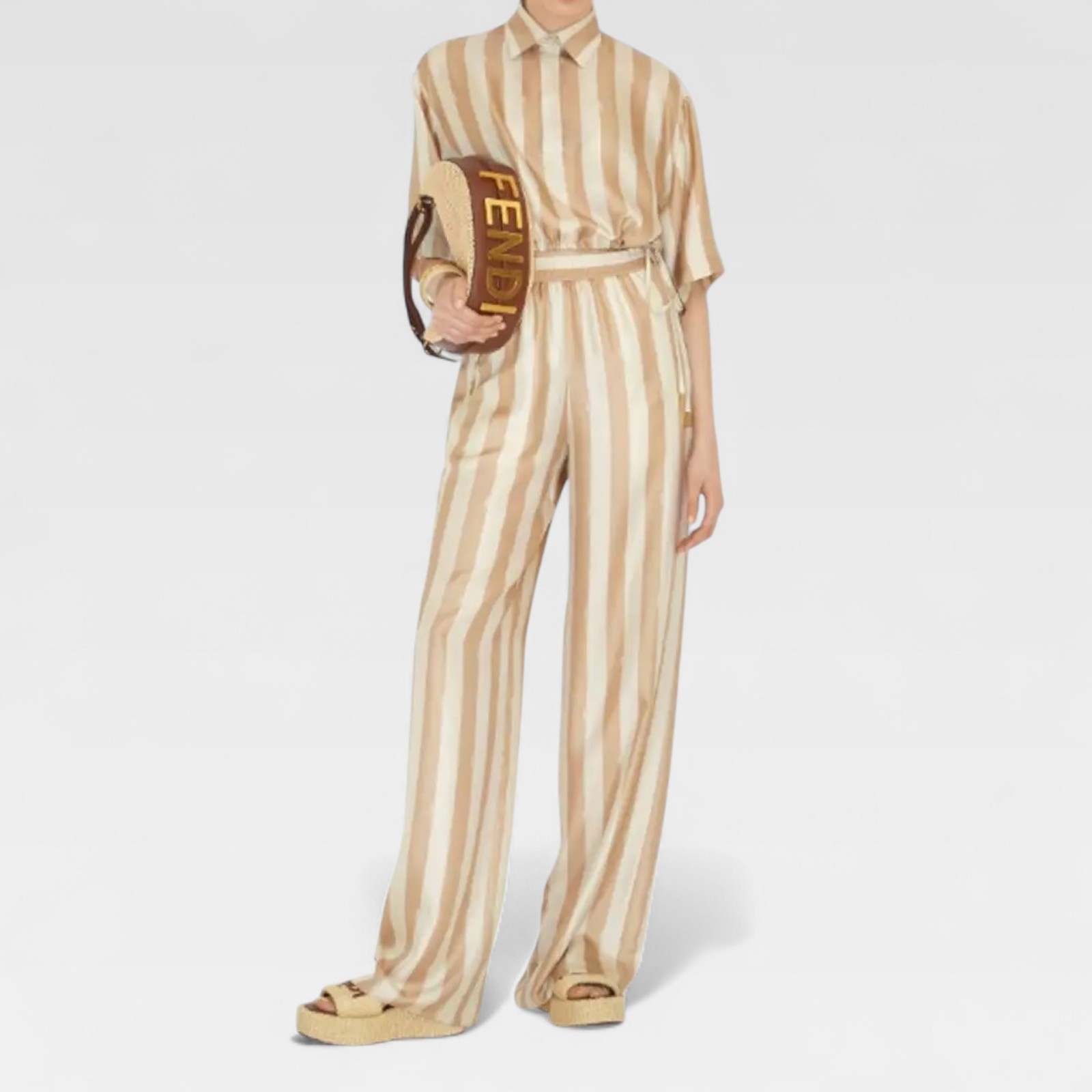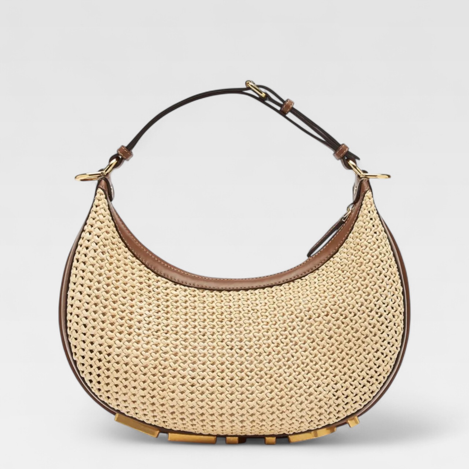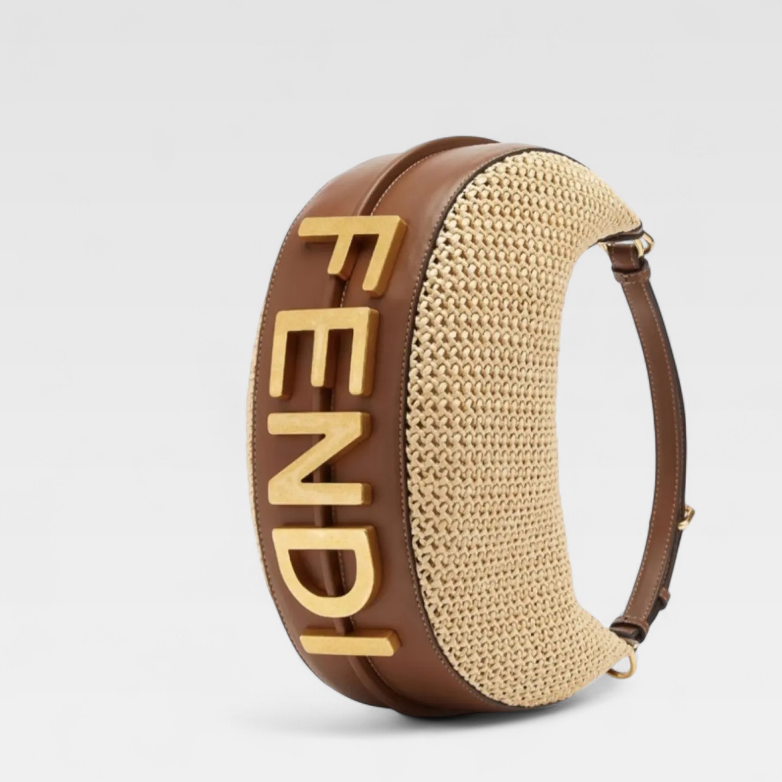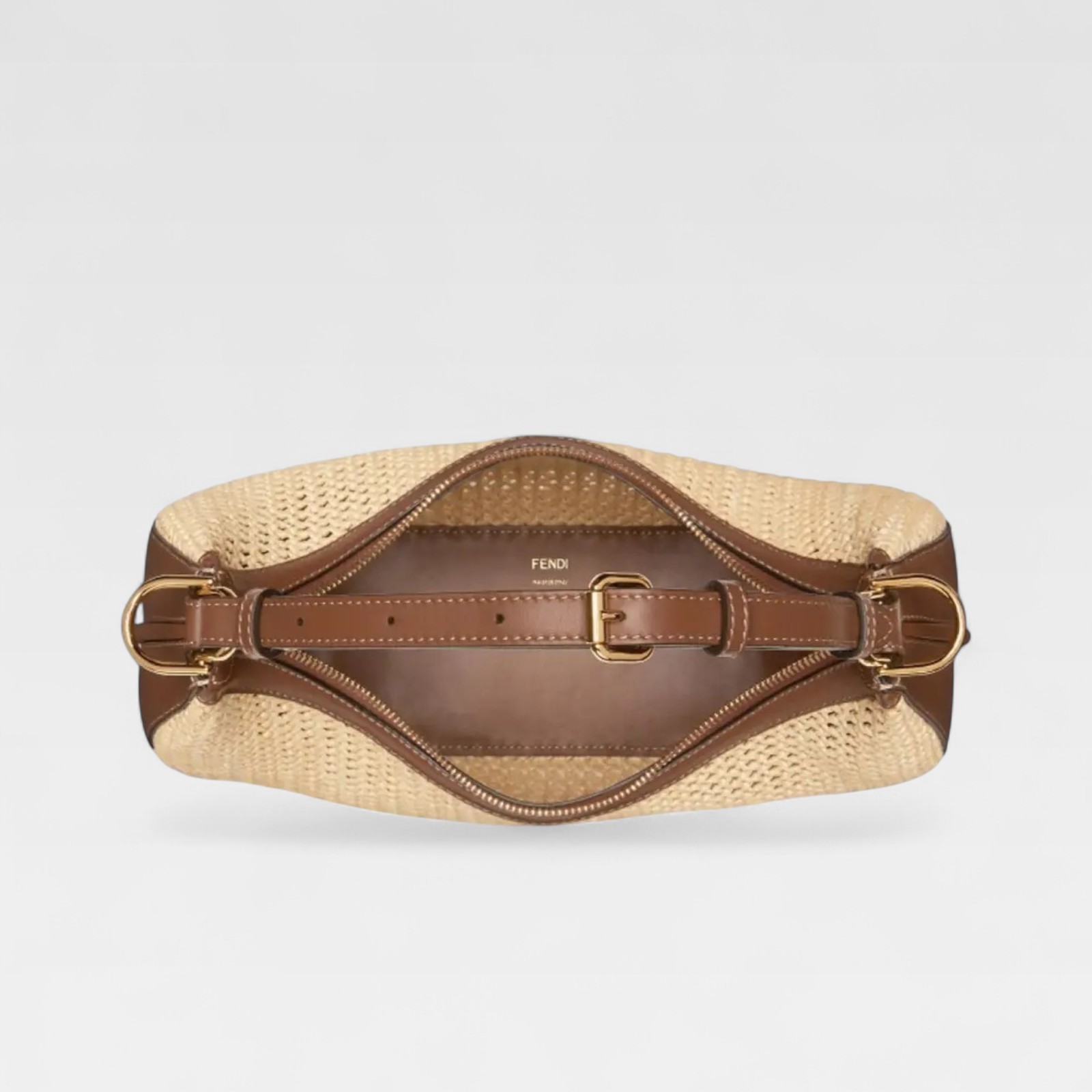 A handcrafted reinterpretation of the iconic Fendigraphy. This hobo bag is crafted in natural raffia macramé and finished with brown calfskin edges for texture and contrast. The most distinctive detail is the large logo FENDI in vintage gold metal at the base, visible when worn under the arm. With a light and summery design, it is ideal for those looking for an elegant accessory with a natural character.
