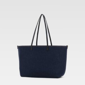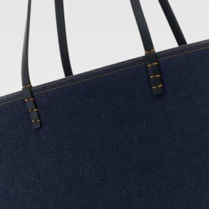 Este bolso tote de Fendi presenta una silueta espaciosa confeccionada en mezclilla azul, con costuras contrastantes y asas largas planas. Su diseño minimalista y funcional lo hace perfecto para el uso diario, ofreciendo amplio espacio interior y un estilo casual sofisticado.
