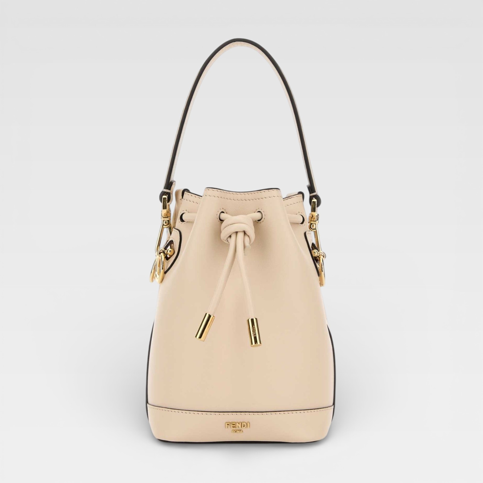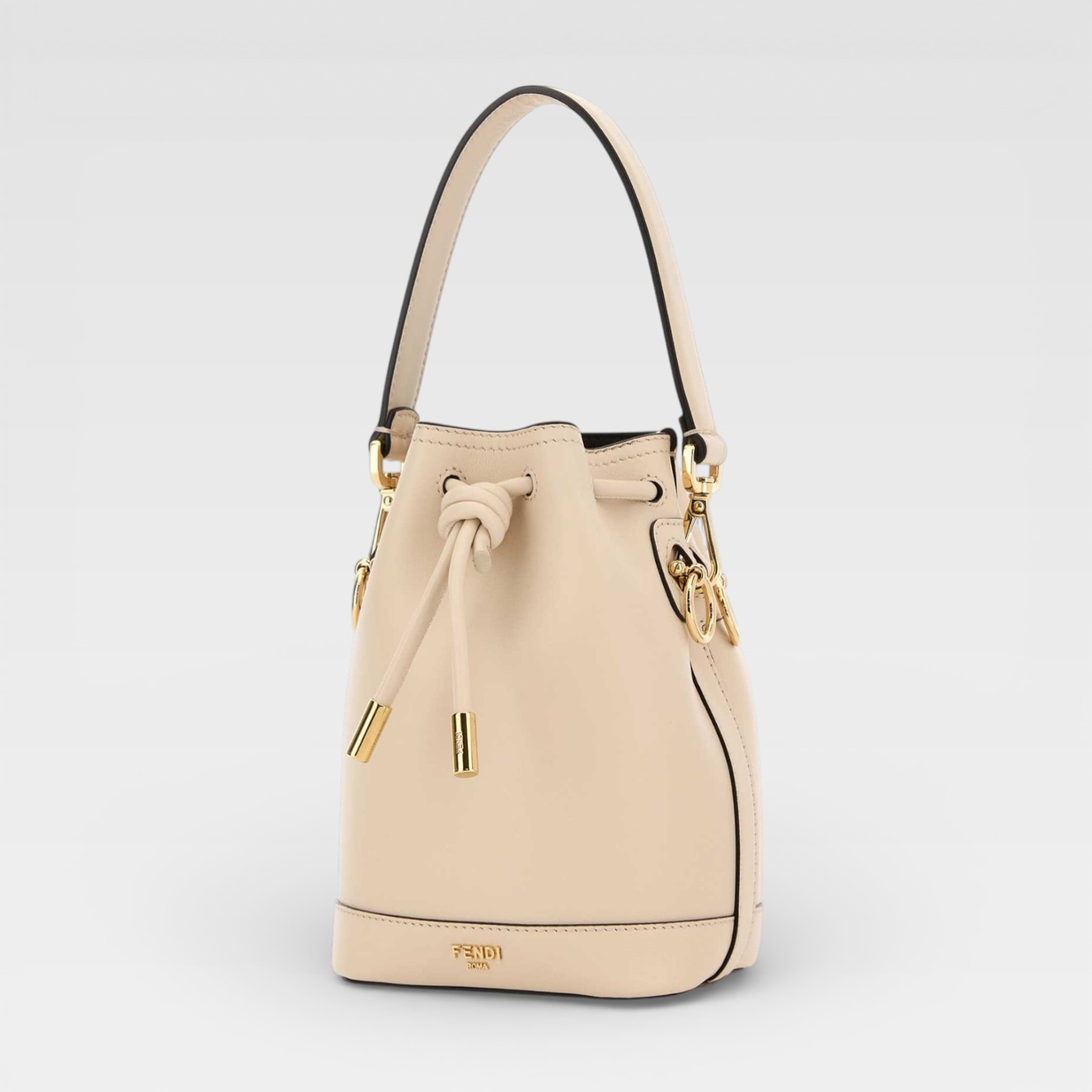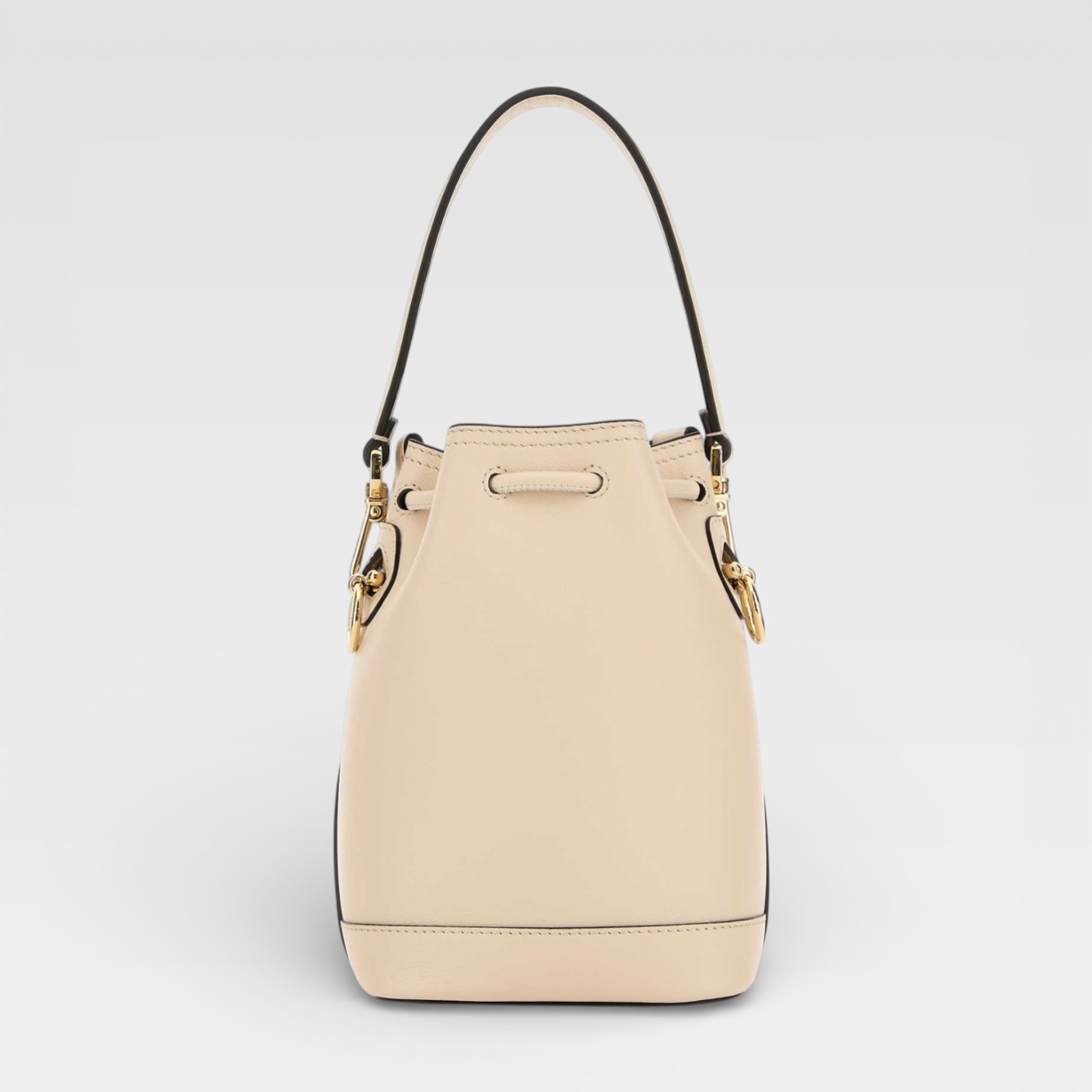Compact structure bag made of smooth leather, with a bucket design and drawstring closure. The short handle allows it to be carried comfortably in the hand or on the shoulder, enhanced with gold-plated metal hardware for a sophisticated touch. The brand's logo is discreetly engraved on the lower front.