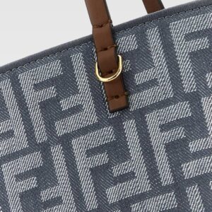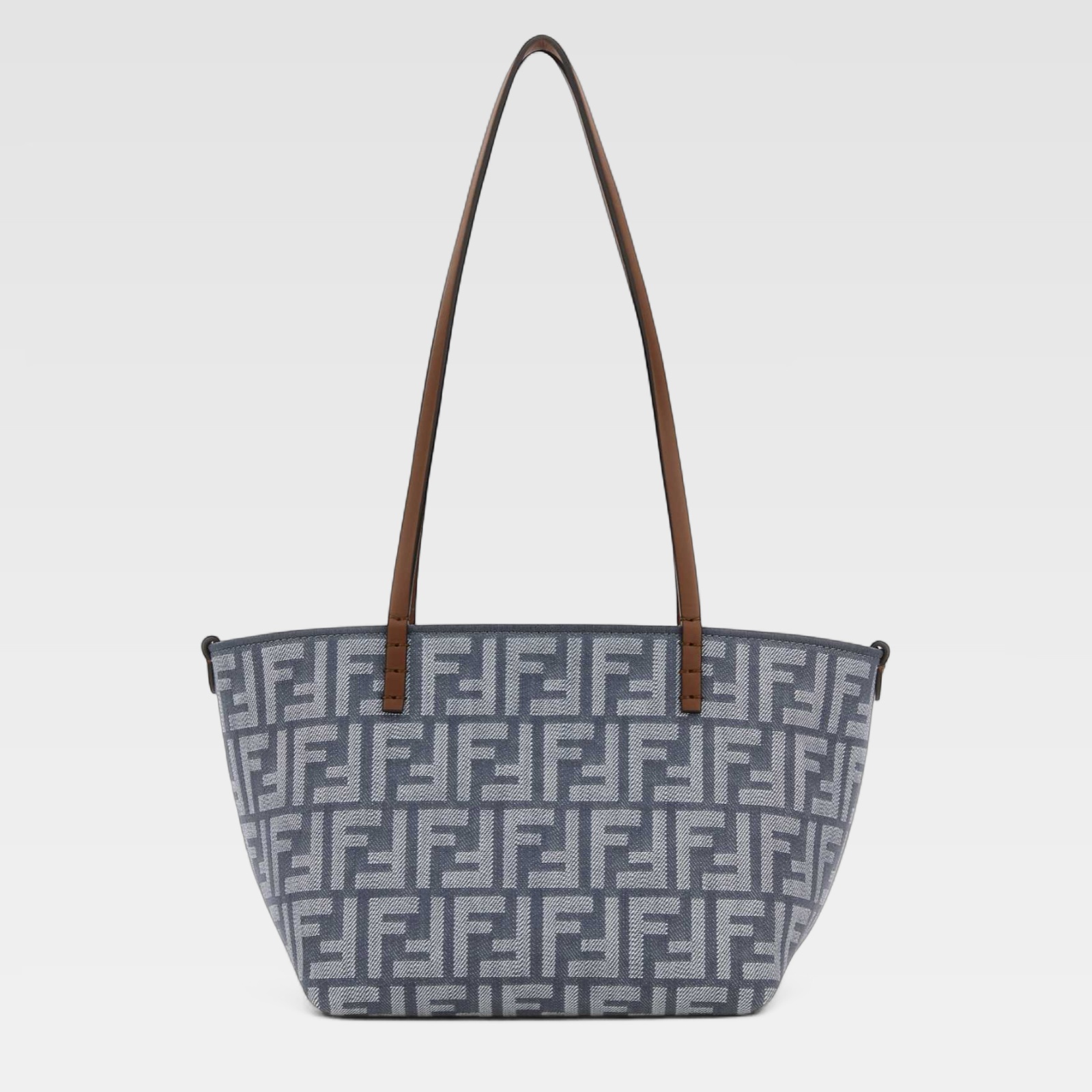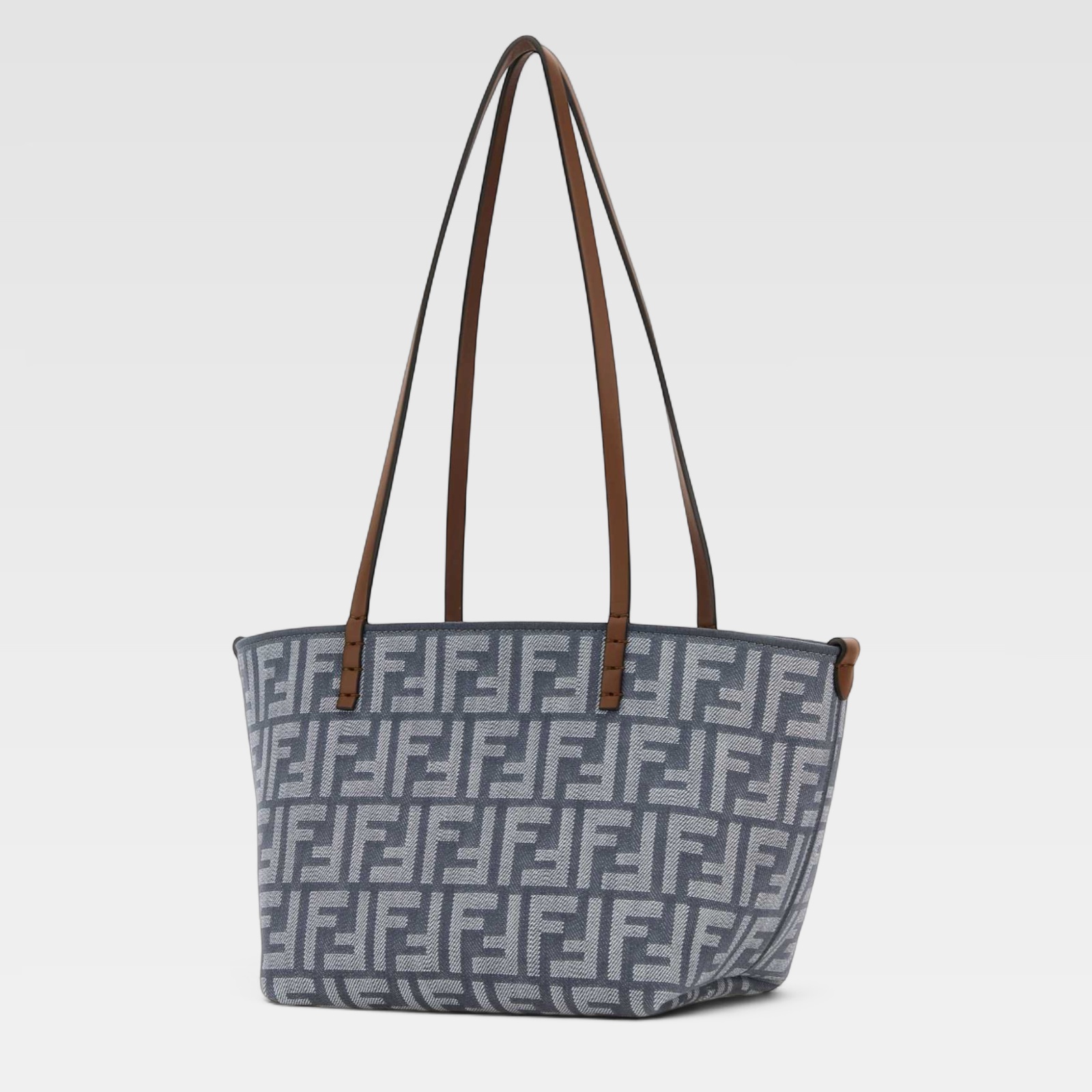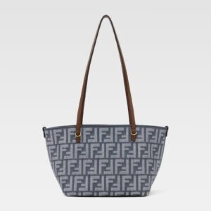 Bolso tote confeccionado en tejido jacquard con el distintivo patrón FF en tono azul y detalles de costuras definidas. Presenta asas largas de piel lisa en color marrón, ideales para llevar cómodamente al hombro. Su silueta estructurada y amplia apertura lo convierten en un accesorio funcional y elegante para el día a día.