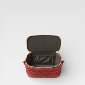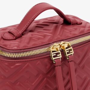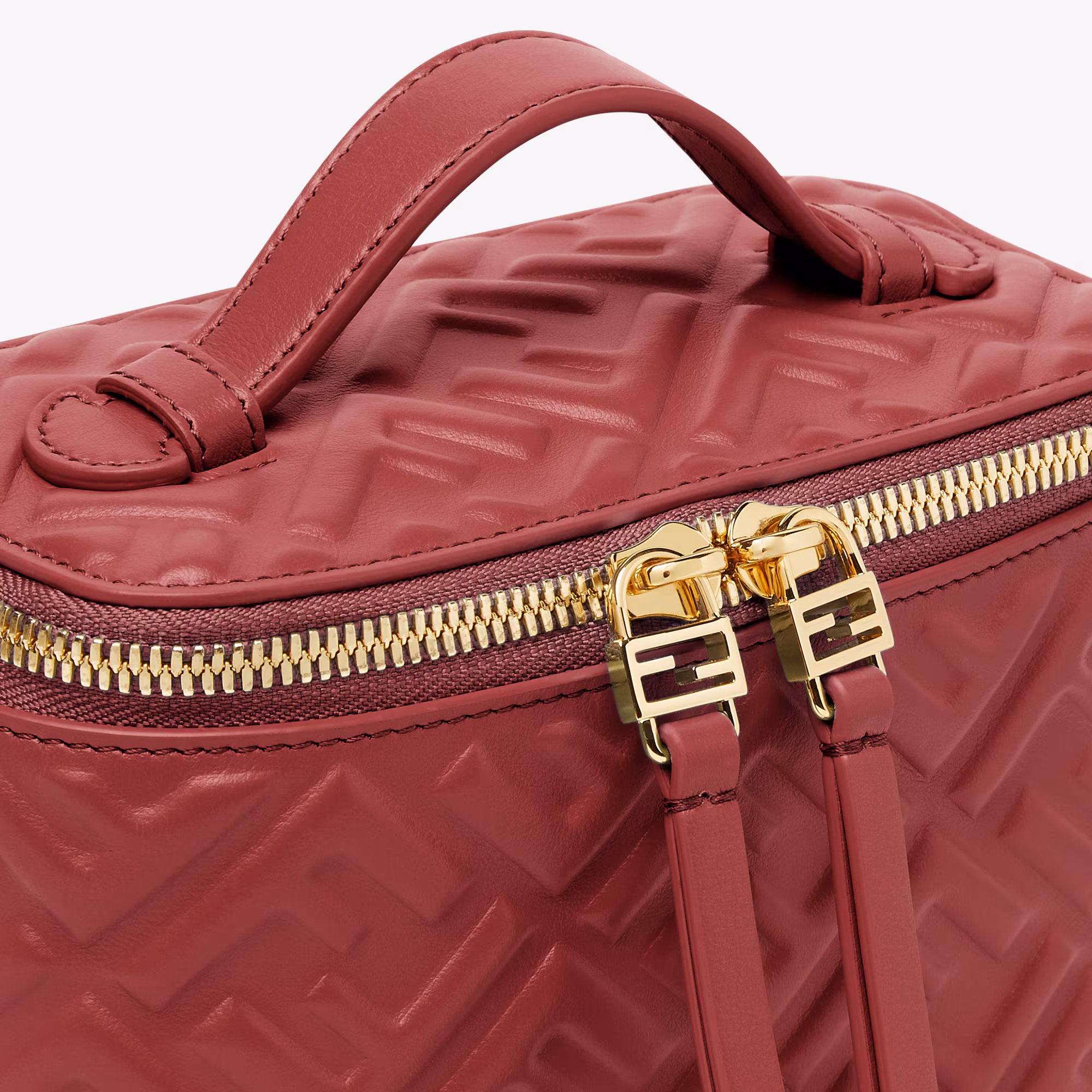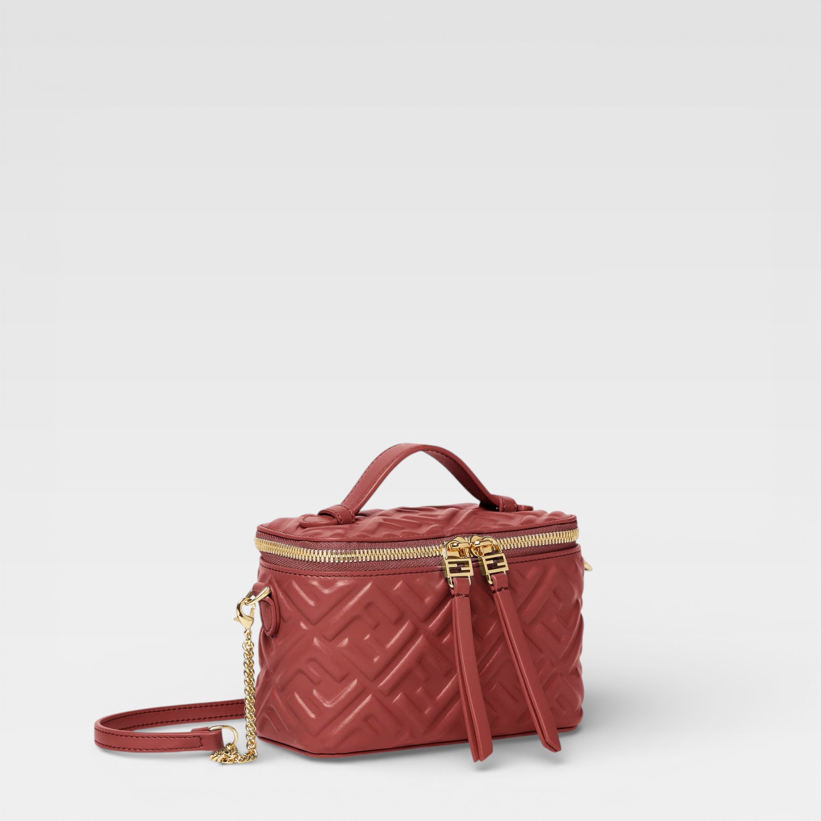 Fendi's Vanity Mini in red nappa leather is a luminous and sophisticated accessory, ideal for complementing seasonal looks. Its cylindrical design is enhanced by the embossed quilted FF motif, adding texture and modernity. It features a top handle and a long adjustable strap with a partial gold-plated chain, allowing it to be worn over the shoulder or across the body. The double zipper closure with leather pulls and gold hardware complete the refined finish.