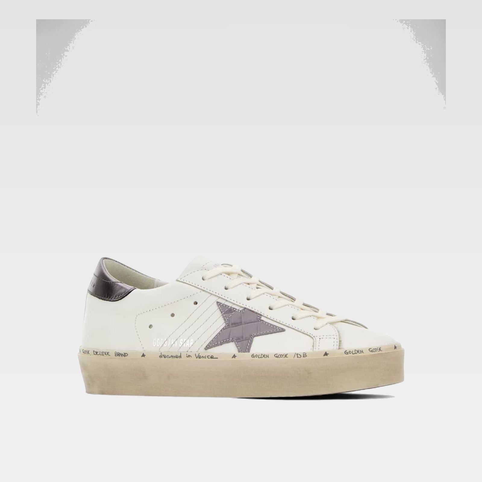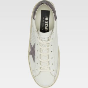 This sneaker features a white base with distinctive details, such as the side star in metallic finish and the heel in shiny tone. The design incorporates side perforations and decorative stitching, as well as original handwritten inscriptions around the sole. The laces and aged-look sole add a unique character to the shoe.