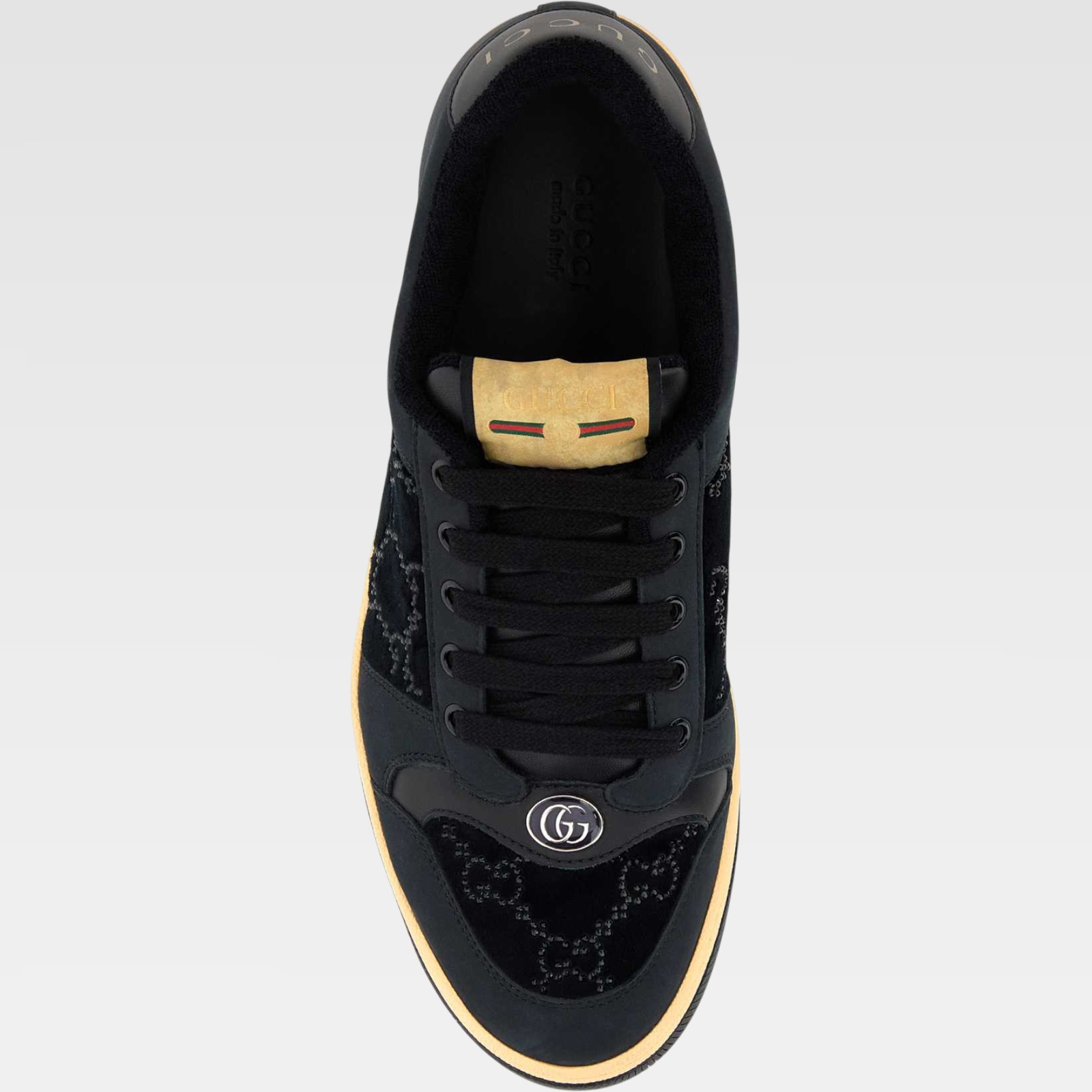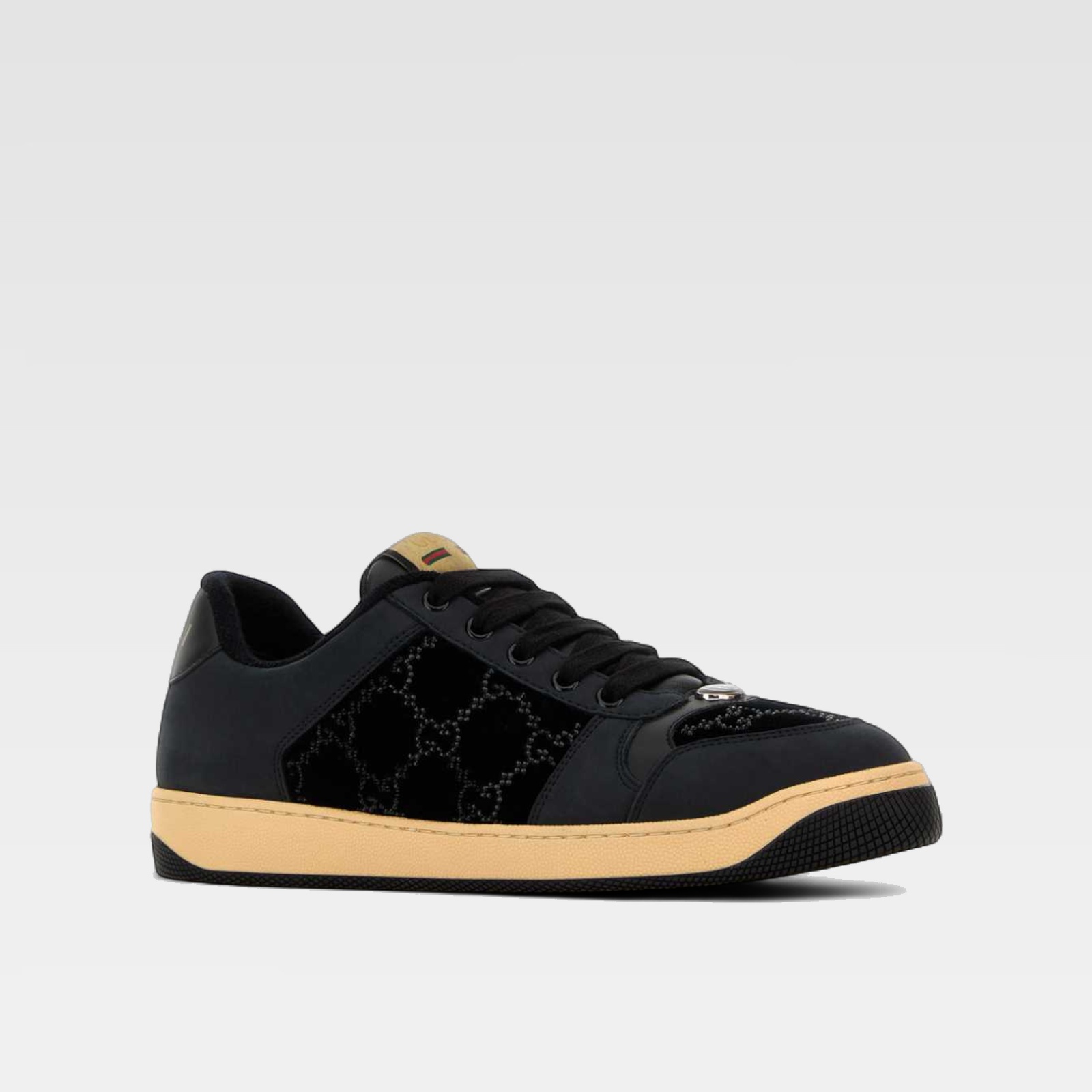 This Gucci sneaker features a modern design with a black fabric base and velvety suede panels with a visible monogram pattern. The beige-toned rubber sole contrasts elegantly with the upper, while the understated logo on the heel and detailing on the heel and tongue add a distinctive touch to the sporty, urban design.