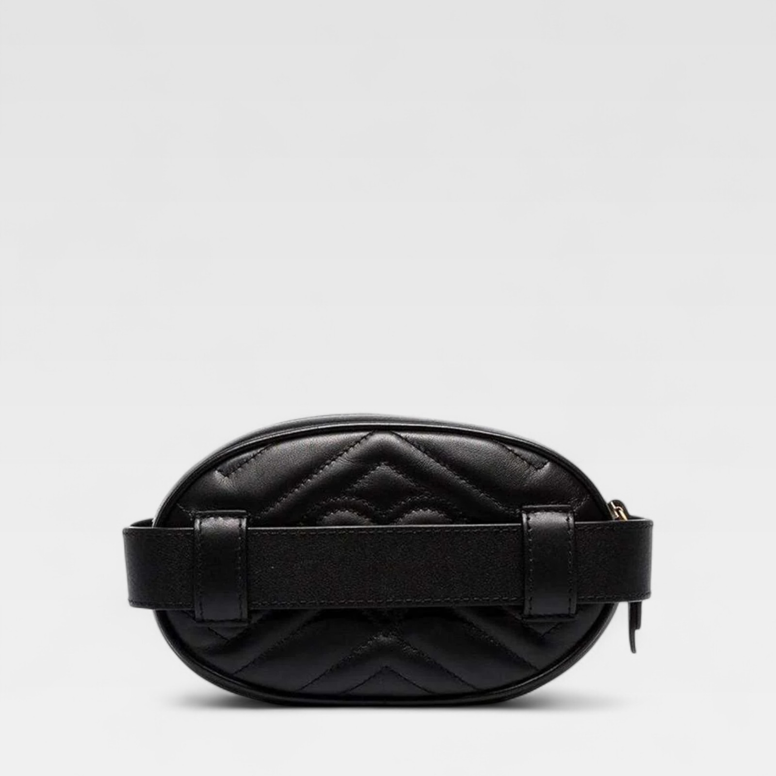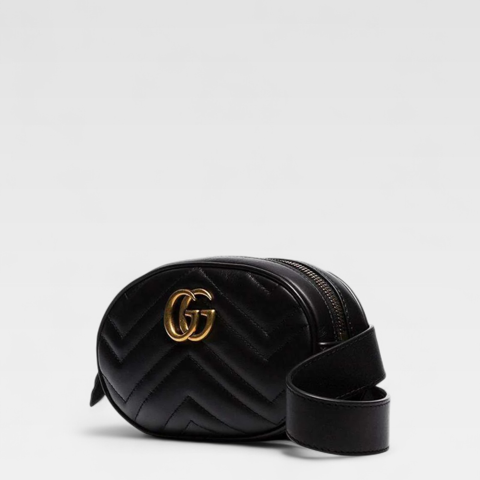 Una reinterpretación funcional del clásico Marmont. Este belt bag de Gucci está confeccionado en cuero negro matelassé con patrón chevron y presenta el icónico logo GG en metal dorado envejecido al frente. Su formato ovalado y compacto se ajusta cómodamente a la cintura con una correa de cuero, ideal para un uso práctico sin renunciar al estilo.