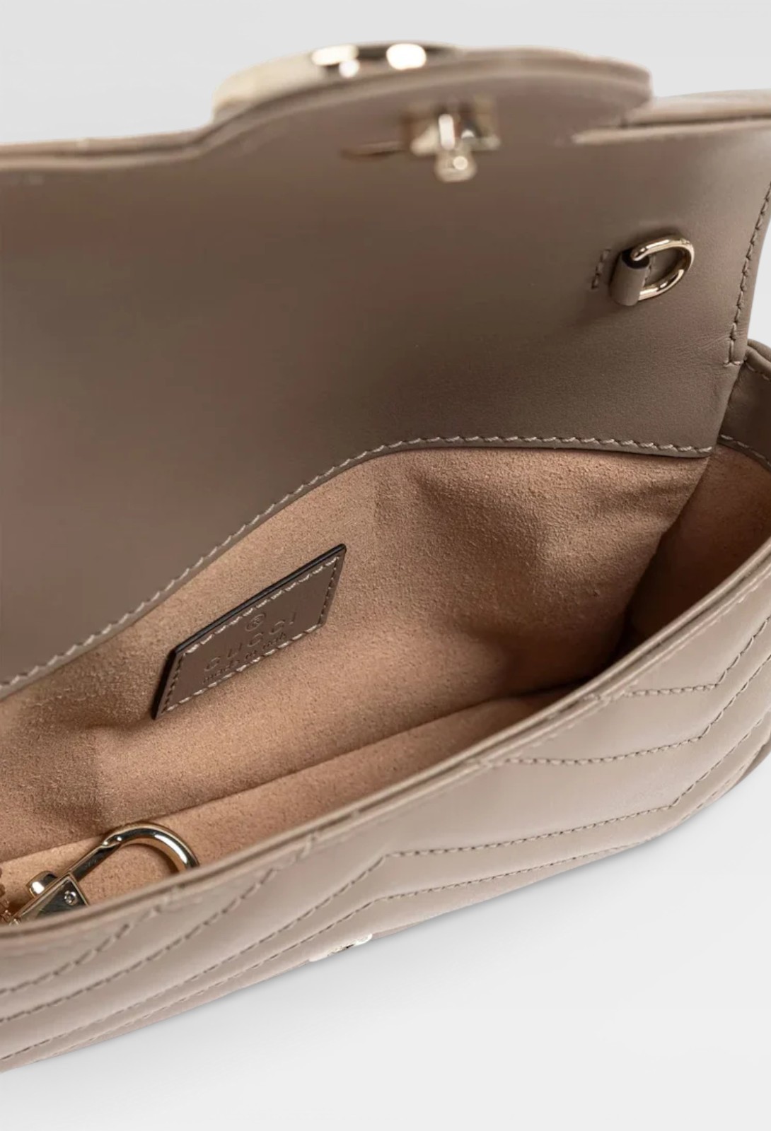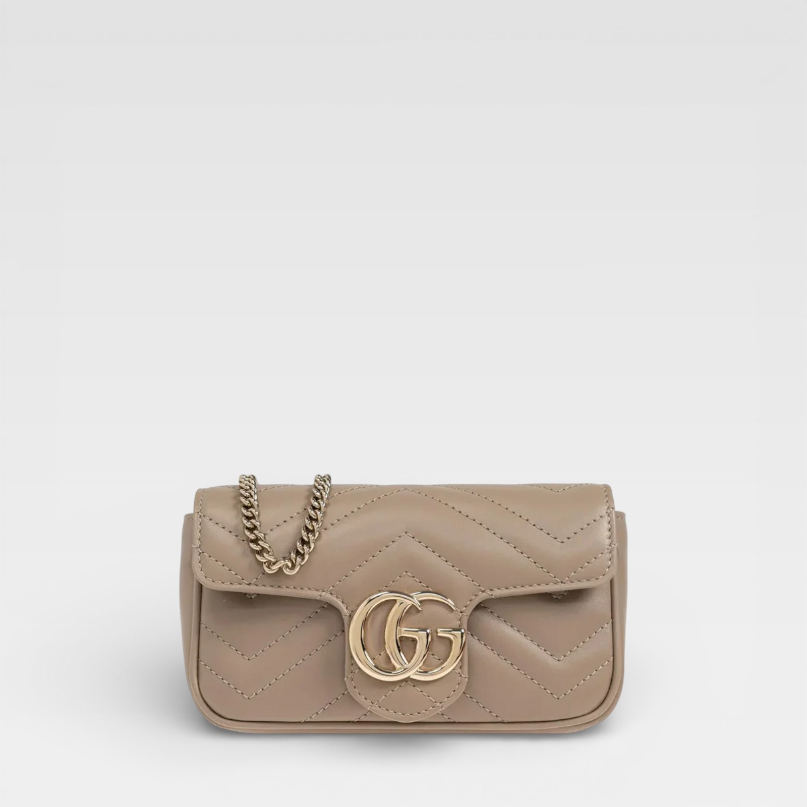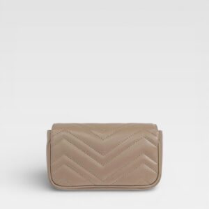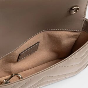 Compact design with distinctive character. This mini bag from Gucci's GG Marmont line is crafted in matelassé taupe leather with herringbone stitching for texture and elegance. The iconic GG logo in antiqued gold-tone metal stands out on the front, while the metal chain allows it to be carried comfortably over the shoulder or across the body. The lined interior offers functional storage with a metal hook for keys or small accessories.