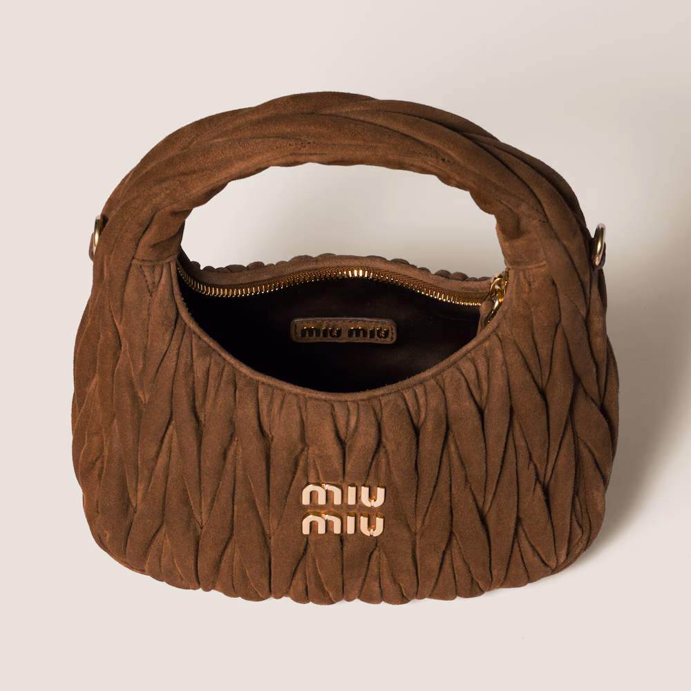 Featuring a wrap-around design with a distinctive texture, Miu Miu's Wander bag stands out for its brown suede construction and signature matelassé quilting. Its soft, curved silhouette hugs the shape of the body, while the wide handle allows it to be carried comfortably on the arm or over the shoulder. The metallic Miu Miu logo on the front finishes this piece with a recognizable and contemporary touch.