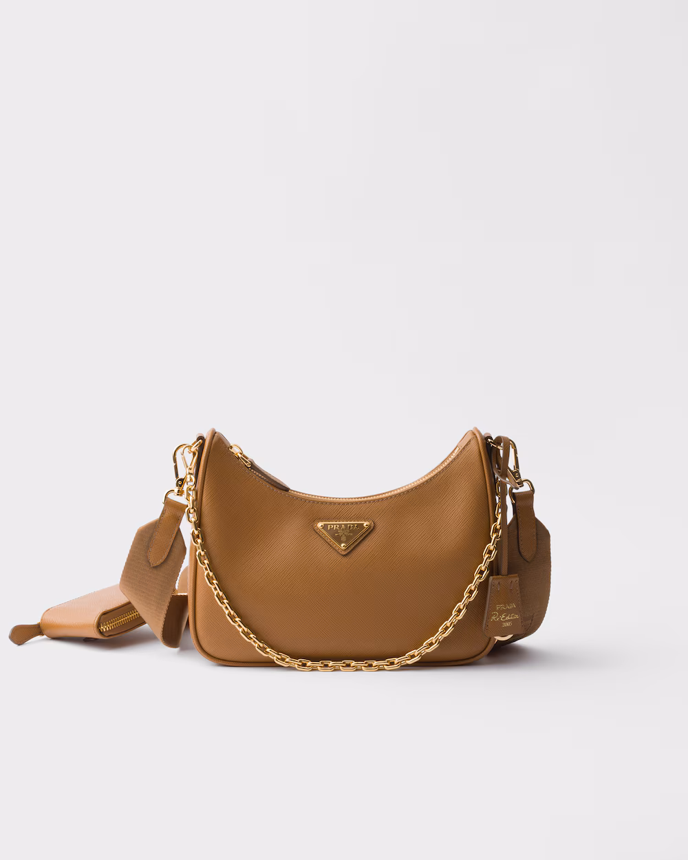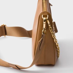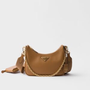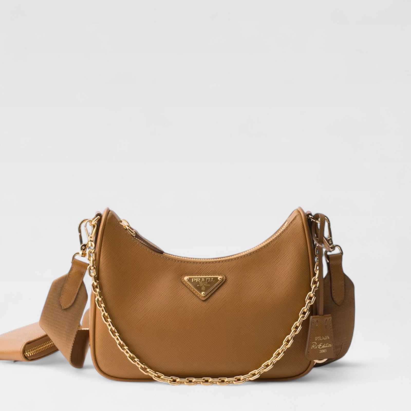 The Prada Re-Edition 2005 is presented in a warm caramel brown tone, highlighting the tough and elegant texture of the maison's signature saffiano leather. Its structured silhouette is completed with a metal chain handle and an adjustable nylon strap, allowing it to be worn in different ways depending on the occasion. A removable pouch adds functionality, while the enameled triangular logo and “Prada Re-Edition 2005” label consolidate its iconic identity.