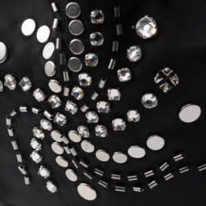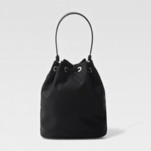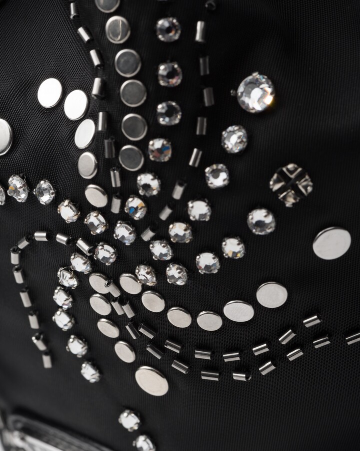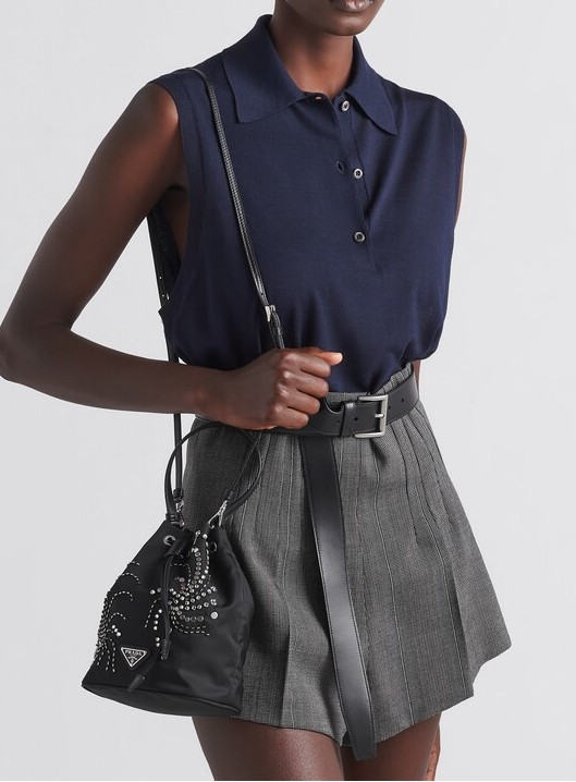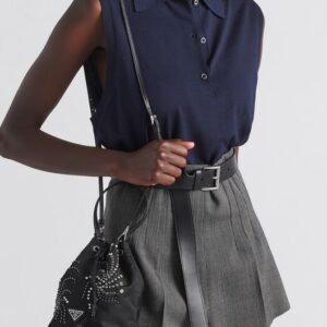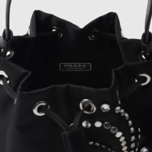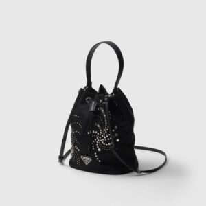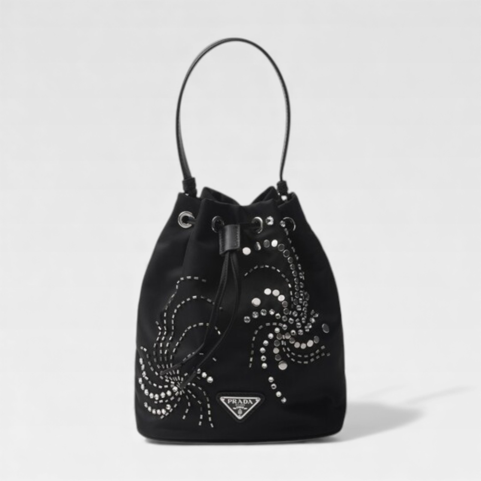 A contemporary reinterpretation of the classic bucket style, this mini bag from Prada fuses sustainability and ornate design. Crafted from recycled Re-Nylon, the exterior is embellished with elaborate crystal embroidery, metallic beads and circular appliqués that create a dynamic, modern pattern. The lace-up closure and soft structure enhance its casual functionality without losing elegance.