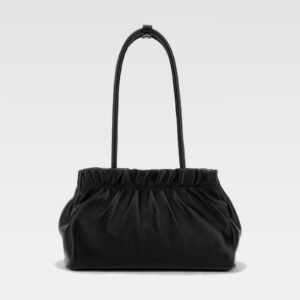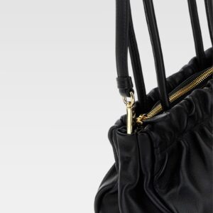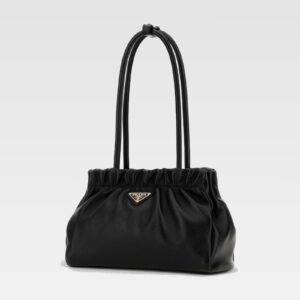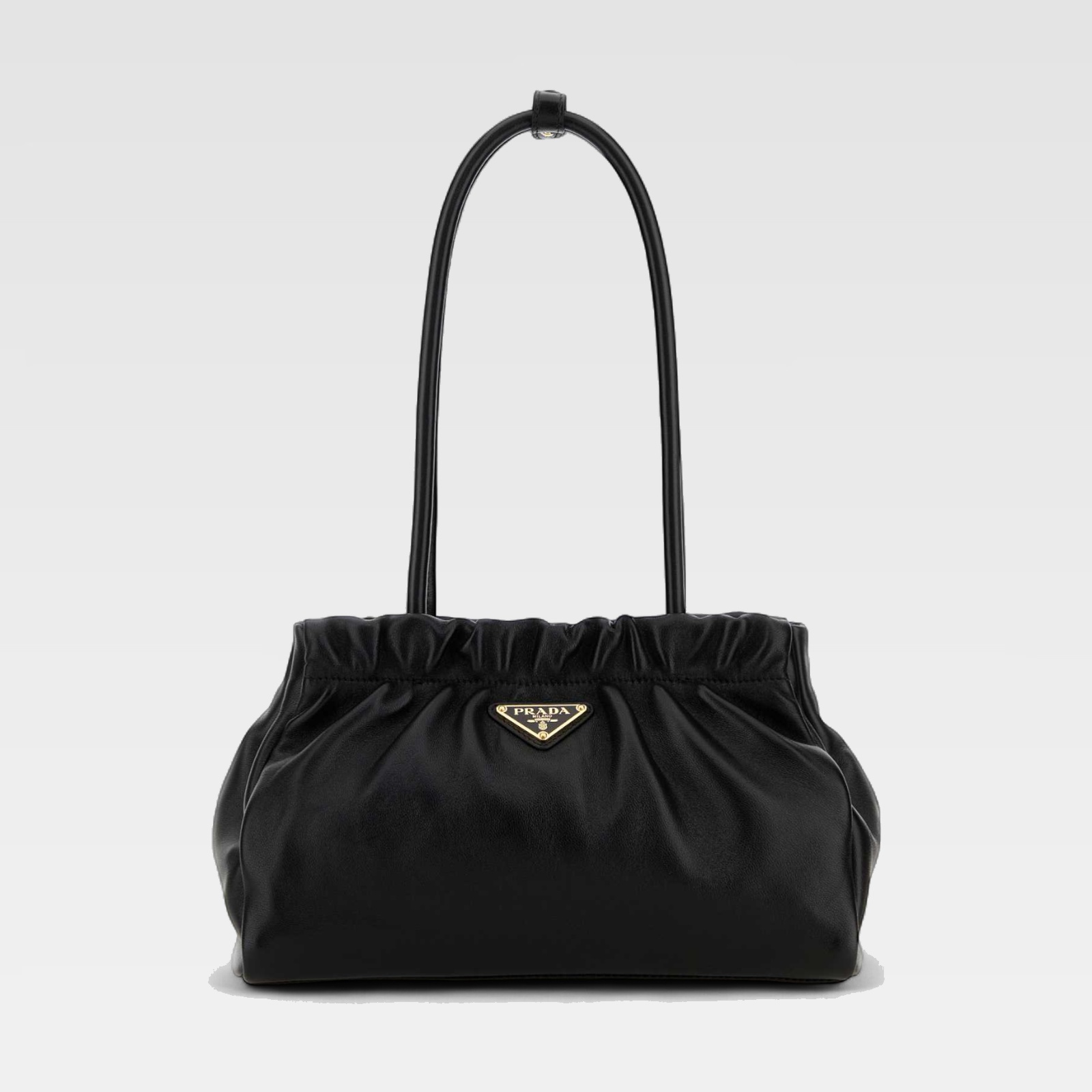 This Prada bag features black leather construction with a smooth, soft finish, complemented by a structured design and light draping at the top. The metallic triangular logo on the front adds a distinctive detail, while the long handles allow it to be carried comfortably over the shoulder or in the hand.