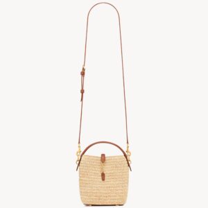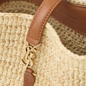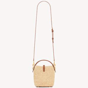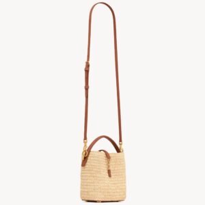With a fresh and summery feel, the Le 37 Mini by Saint Laurent is made of braided raffia in a natural tone, with brown leather finishes that enhance its silhouette. The central detail is the iconic gold metallic YSL monogram, integrated into the front strap that secures the flap. Its structured top handle and removable long strap make it versatile to carry in the hand, over the shoulder or across the body.
