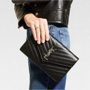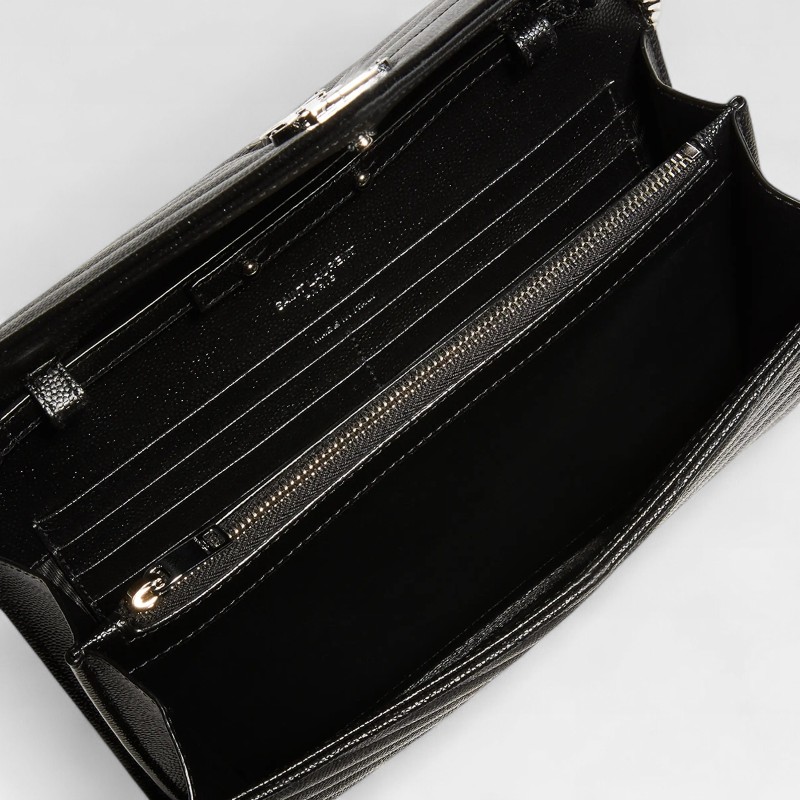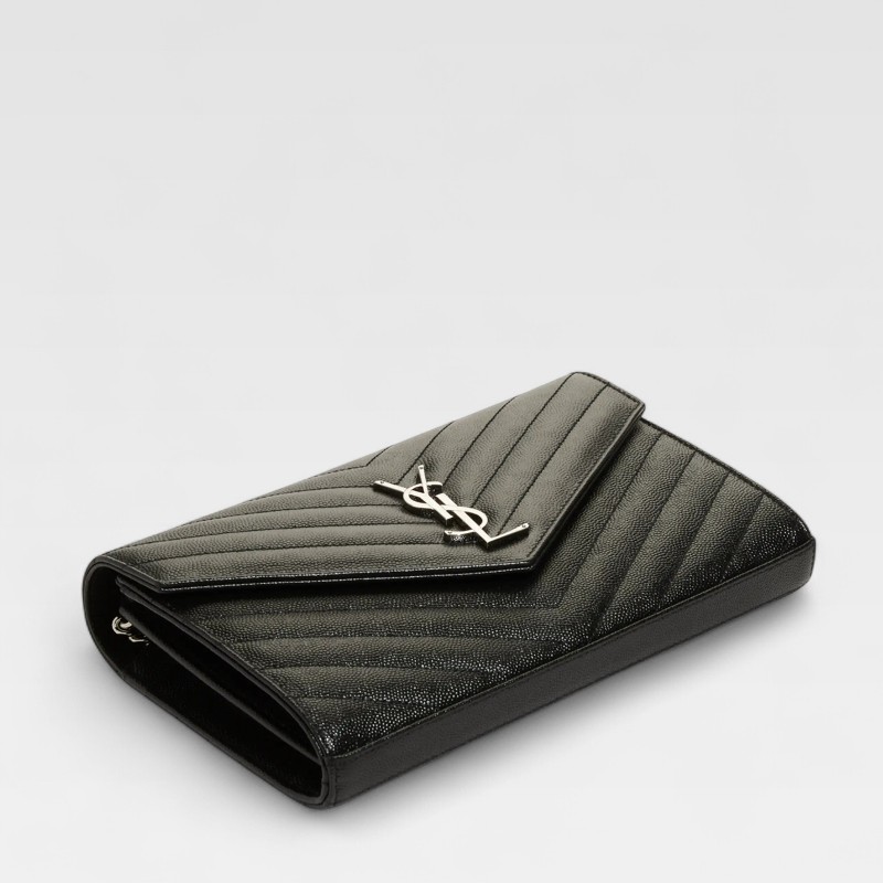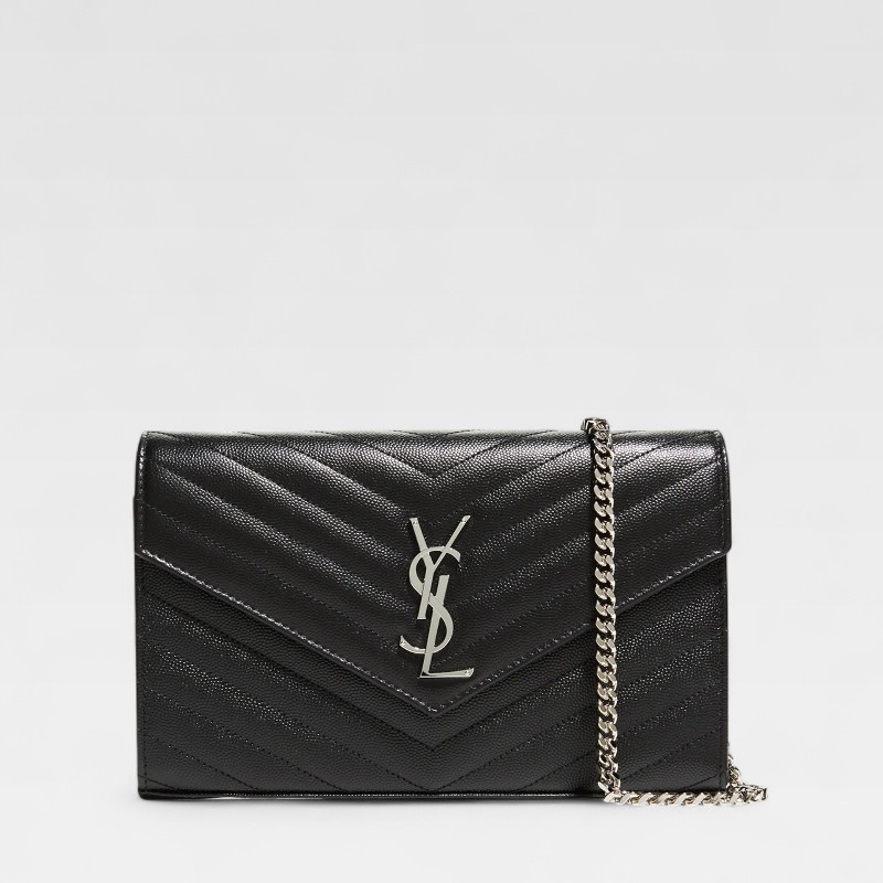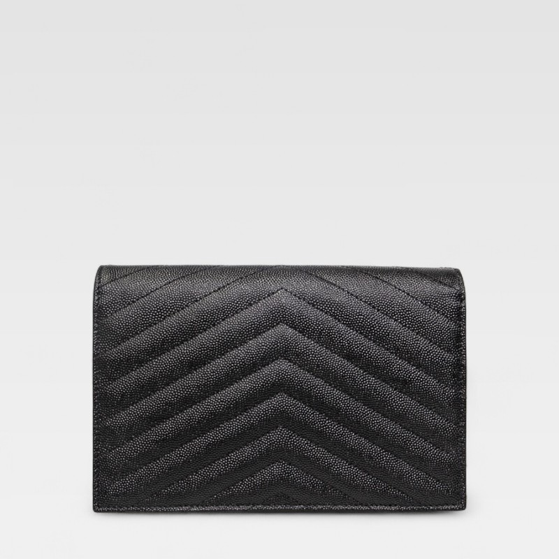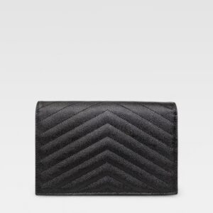 Elegant and functional, the Wallet on Chain by Saint Laurent is a timeless classic. Crafted in black matelassé leather with a chevron pattern, it is adorned with the iconic YSL logo in gold-tone metal. Its compact size is ideal for carrying your essentials, with internal card slots, a zippered pocket and a removable gold chain that allows you to use it as a clutch or crossbody.