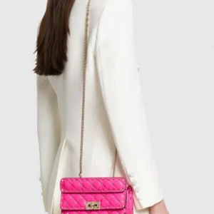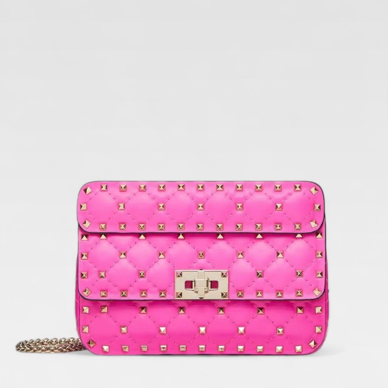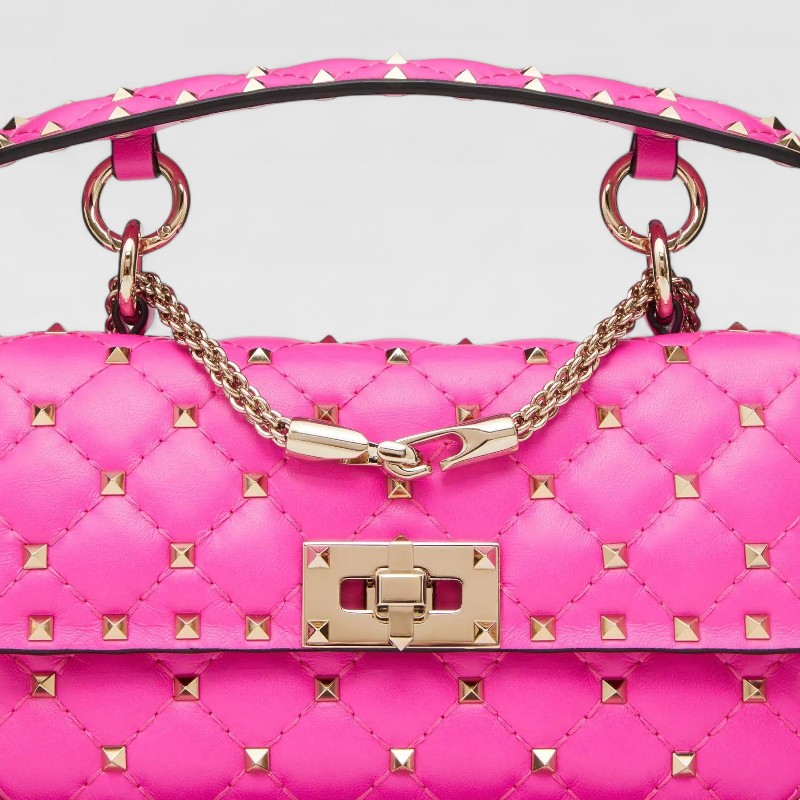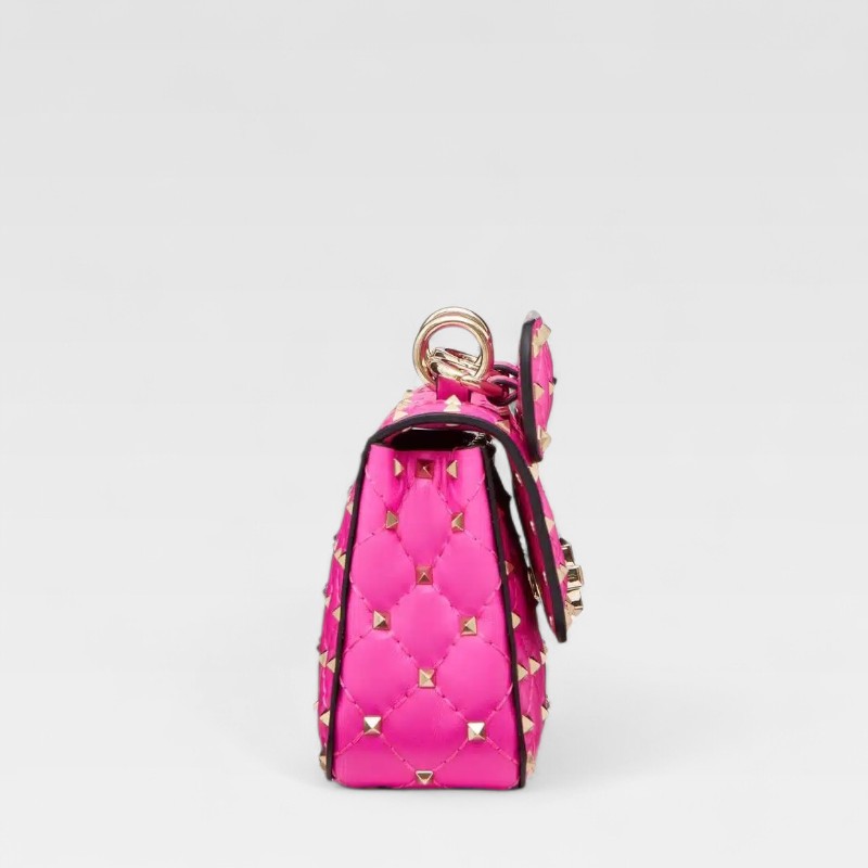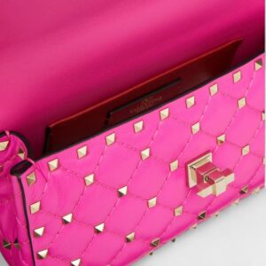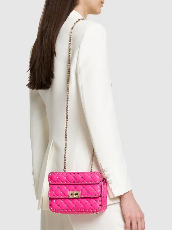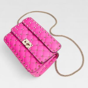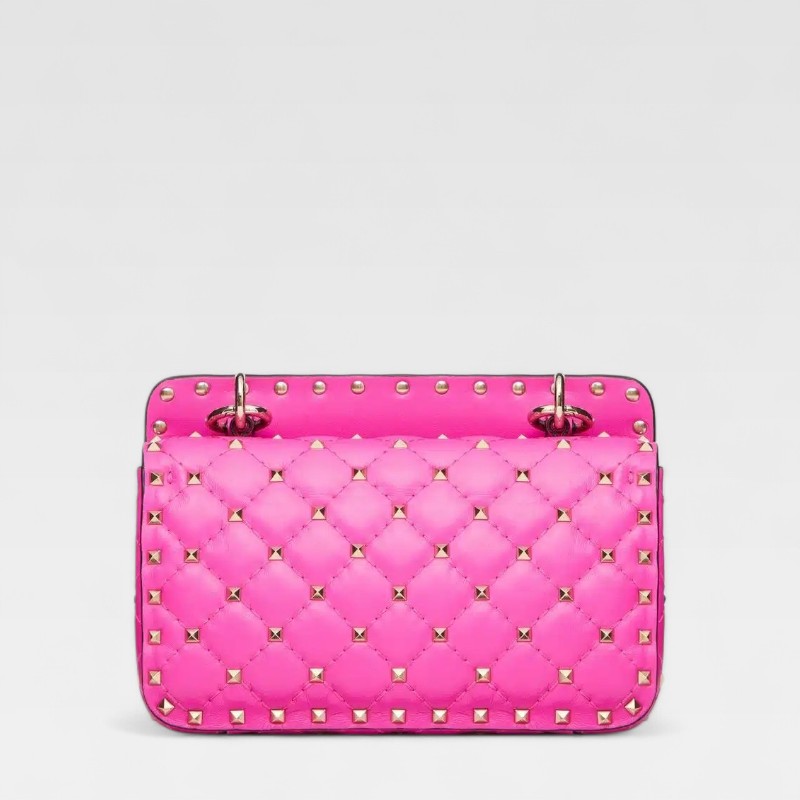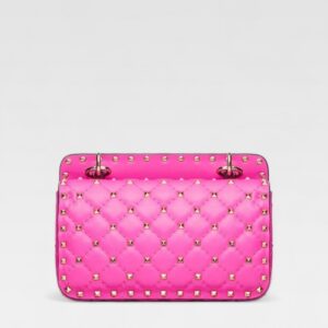A bold design with a feminine touch. The Mini Rockstud Spike by Valentino Garavani is crafted in soft quilted calf leather in azalea pink and decorated with the iconic golden studs all over. Its compact size and versatile structure allow it to be carried as a shoulder bag, cross-body bag or clutch, thanks to the detachable golden chain and padded top handle.