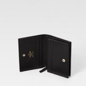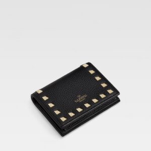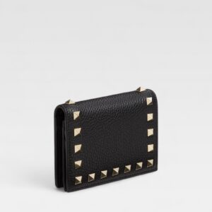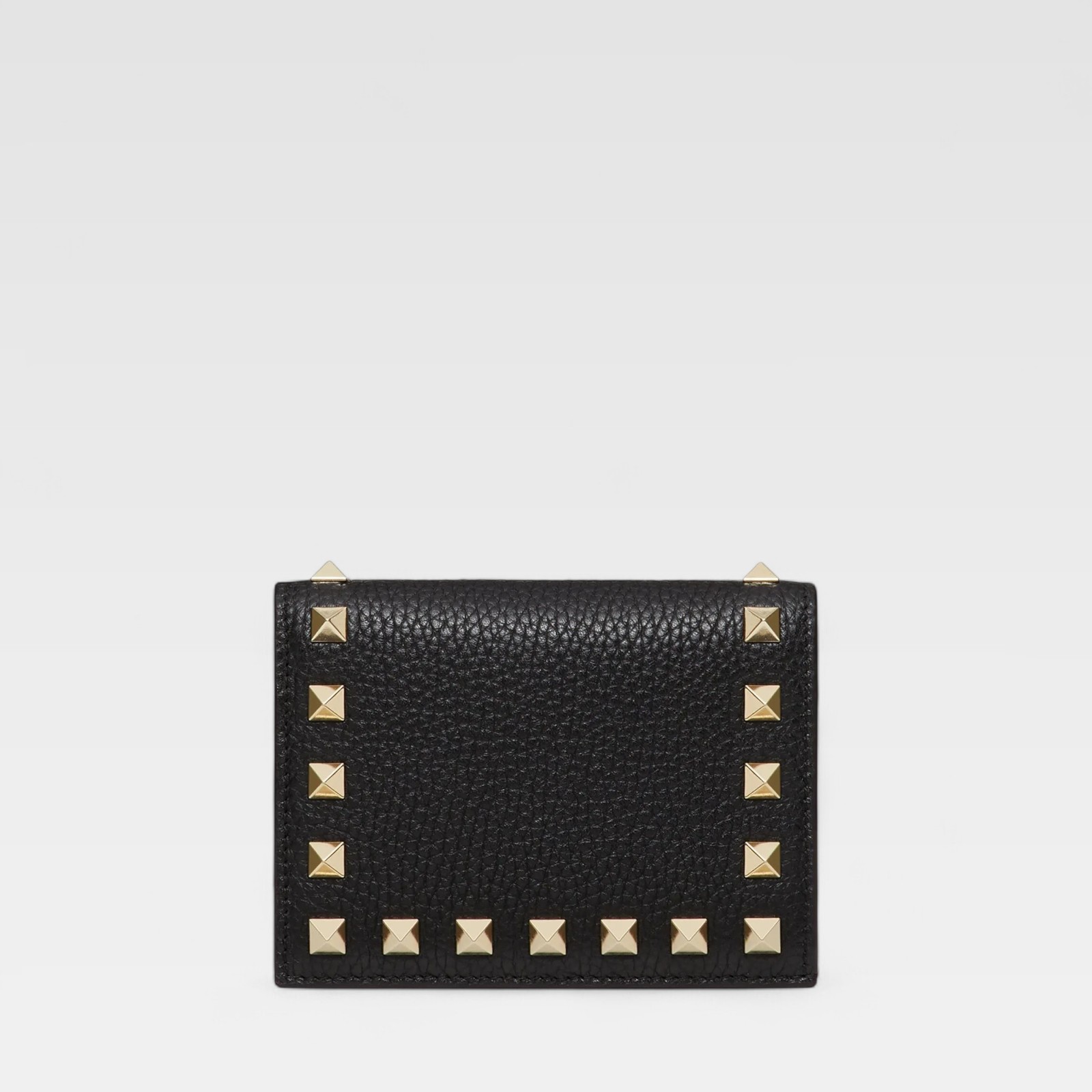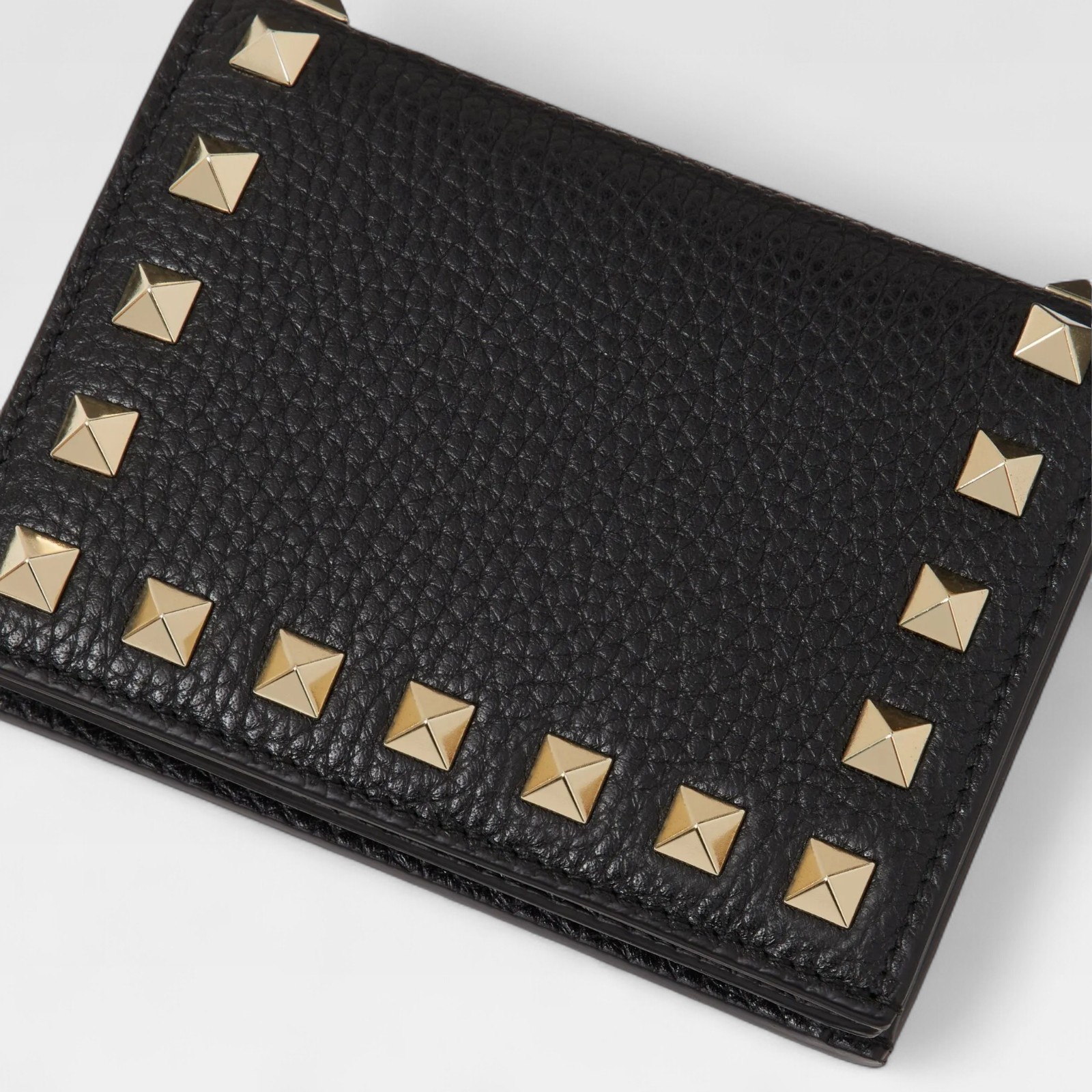 A compact design that reflects Valentino's iconic aesthetic. This wallet is crafted in fine-grain black leather and decorated with antiqued gold Rockstud studs applied geometrically along the edges. Its interior offers organized spaces for cards and bills, while the zipper closure maintains security and practicality in everyday use.