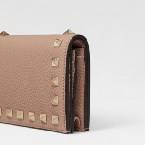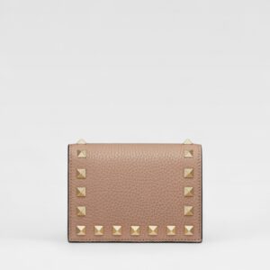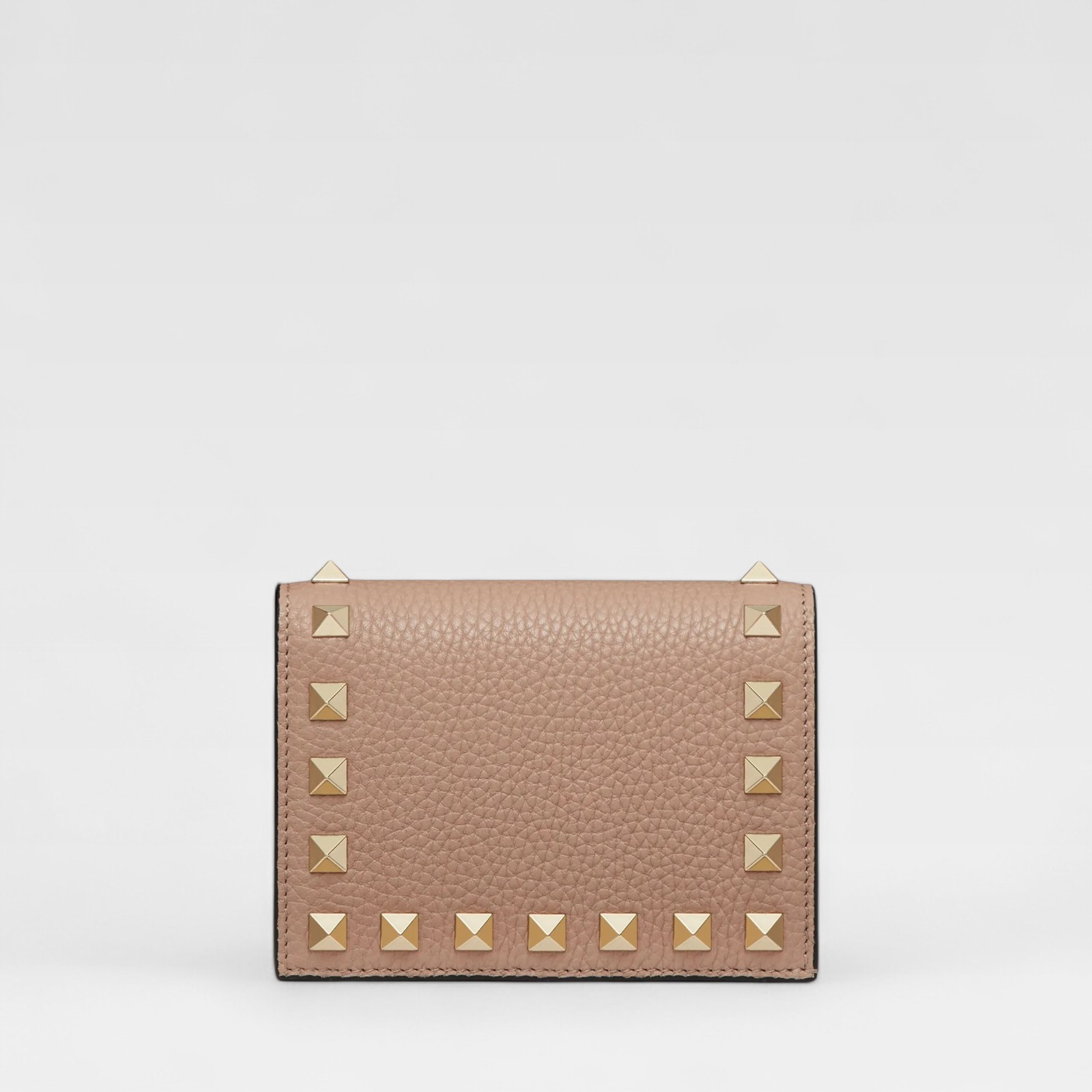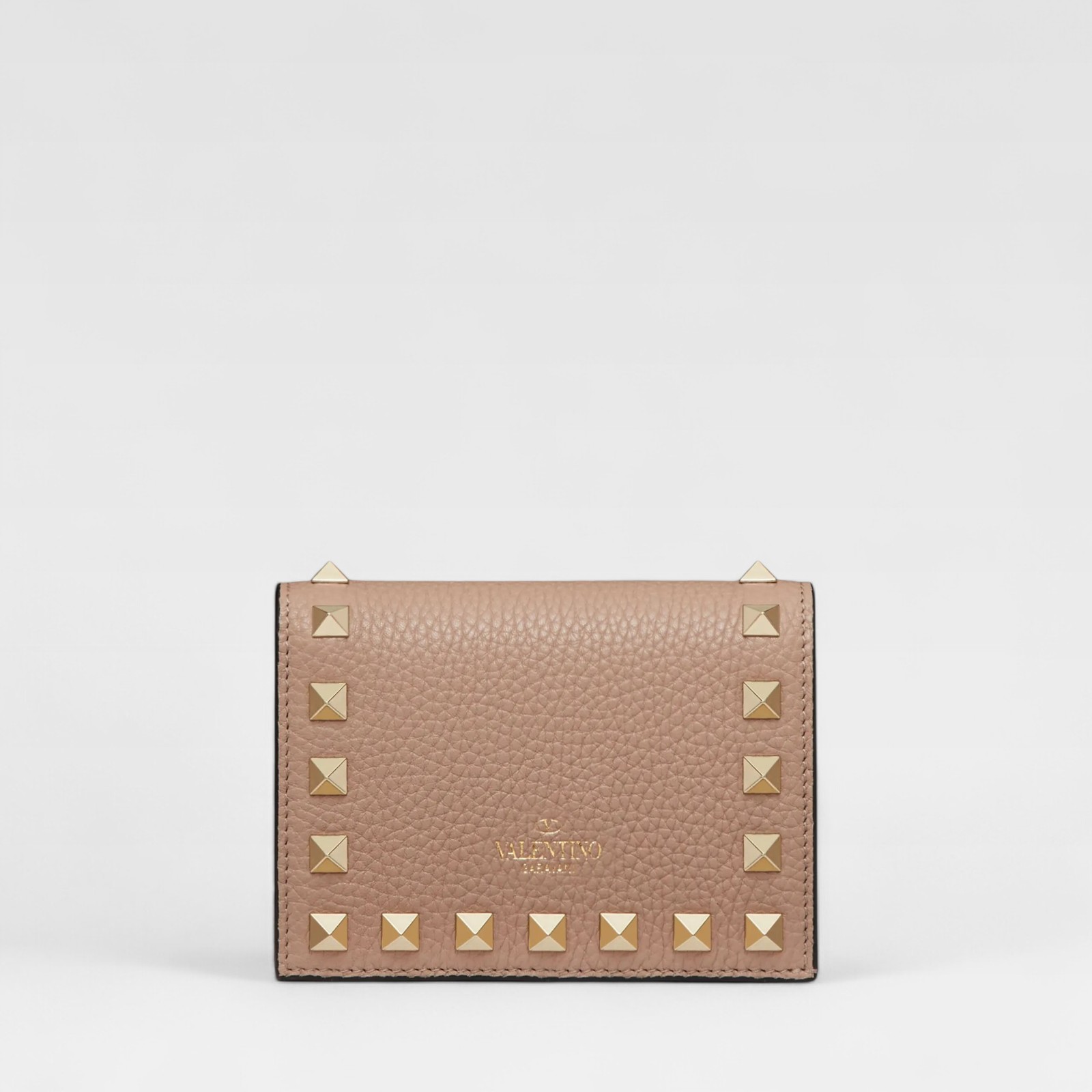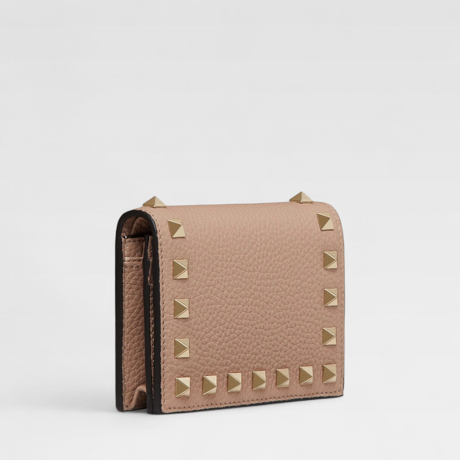 A distinctive accessory that combines functionality with Valentino's iconic style. This wallet is crafted in nude leather with grained texture and decorated with antiqued gold Rockstud studs, applied symmetrically on the edges. Its compact size makes it ideal for carrying in small bags, while maintaining organization and sophistication.