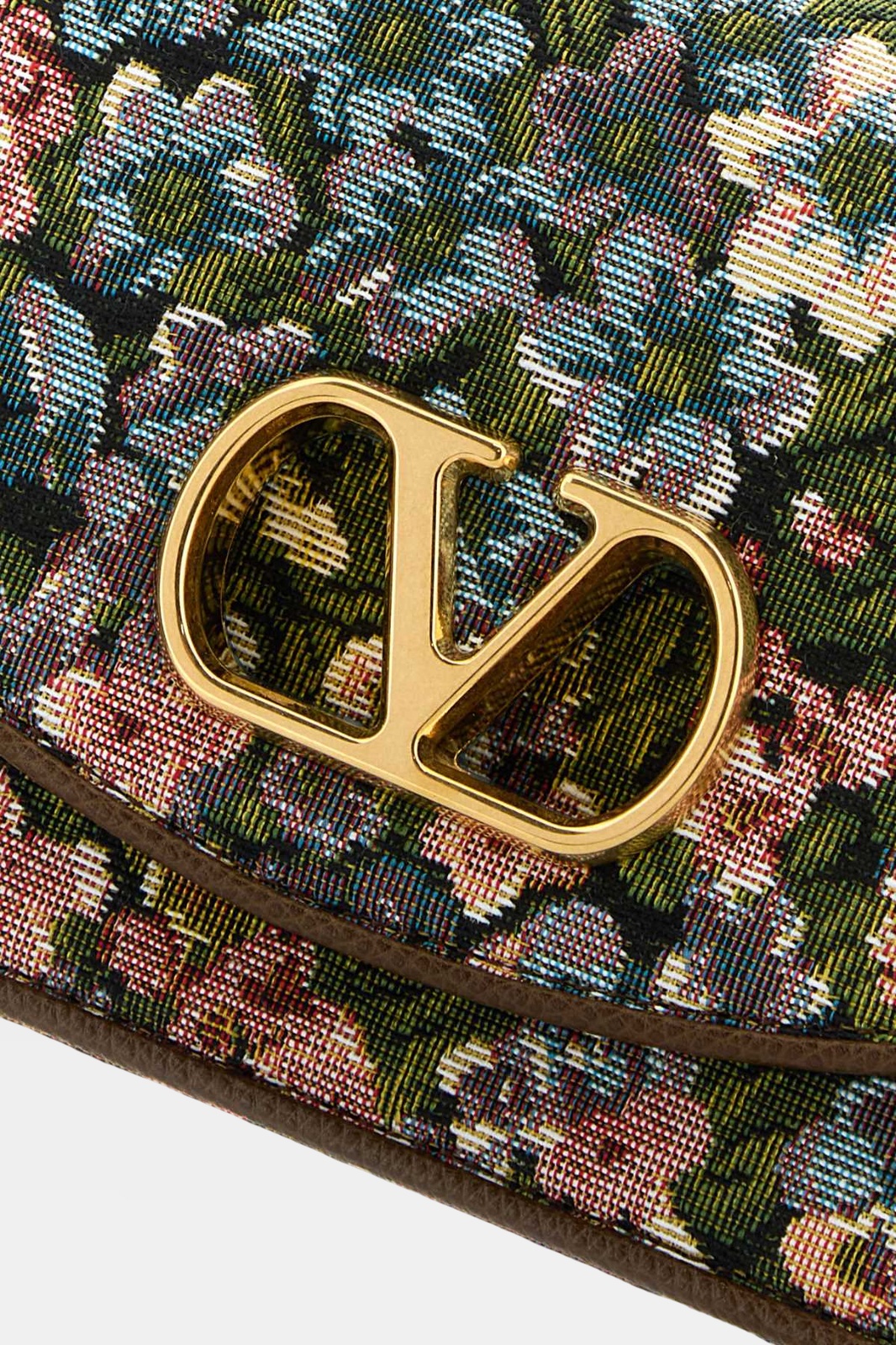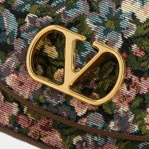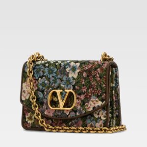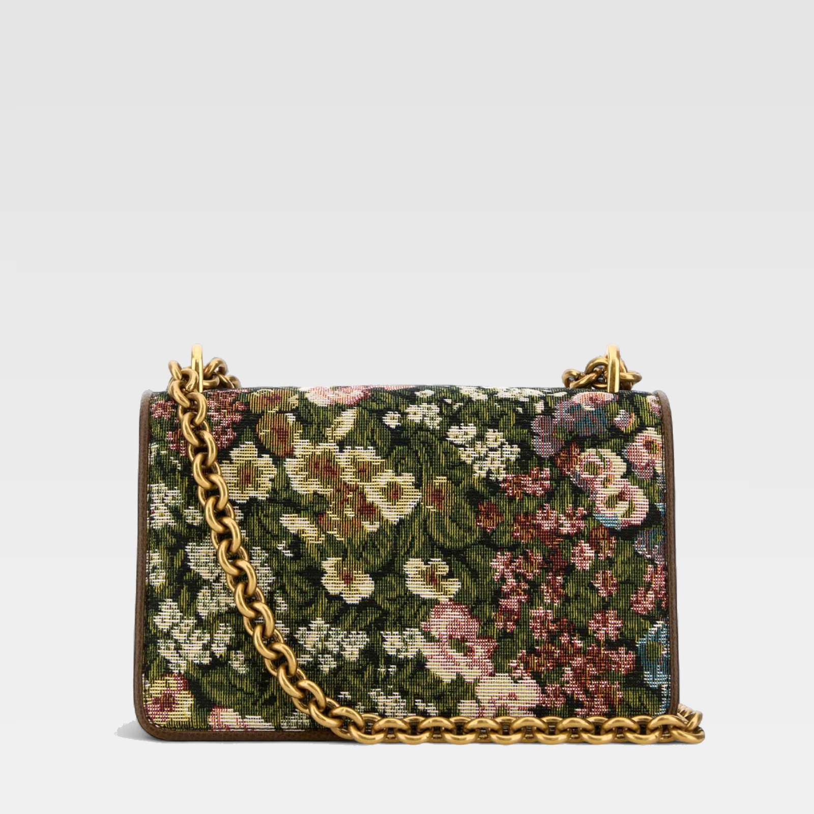Small tapestry bag with an intricate multicolor floral design, featuring a front flap adorned with the iconic gold-tone metallic logo. The prominent gold-tone chain adds a sophisticated touch and can be worn over the shoulder. The rectangular structure and detailed finishes complement its classic and elegant look.