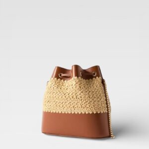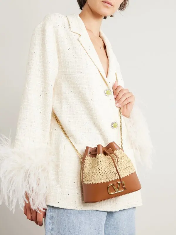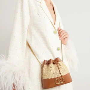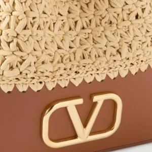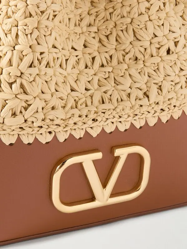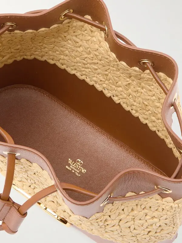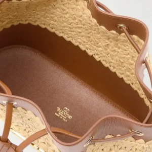 Relaxed design with distinctive character. This Valentino Garavani bucket bag combines the natural texture of woven raffia with panels of structured brown leather. Its supple silhouette is fastened with a lace-up system at the top, while the iconic gold-tone metallic VLogo logo at the front adds instant identity. The roomy interior with no visible compartments allows you to carry your essentials in comfort, ideal for everyday wear with a stylish twist.