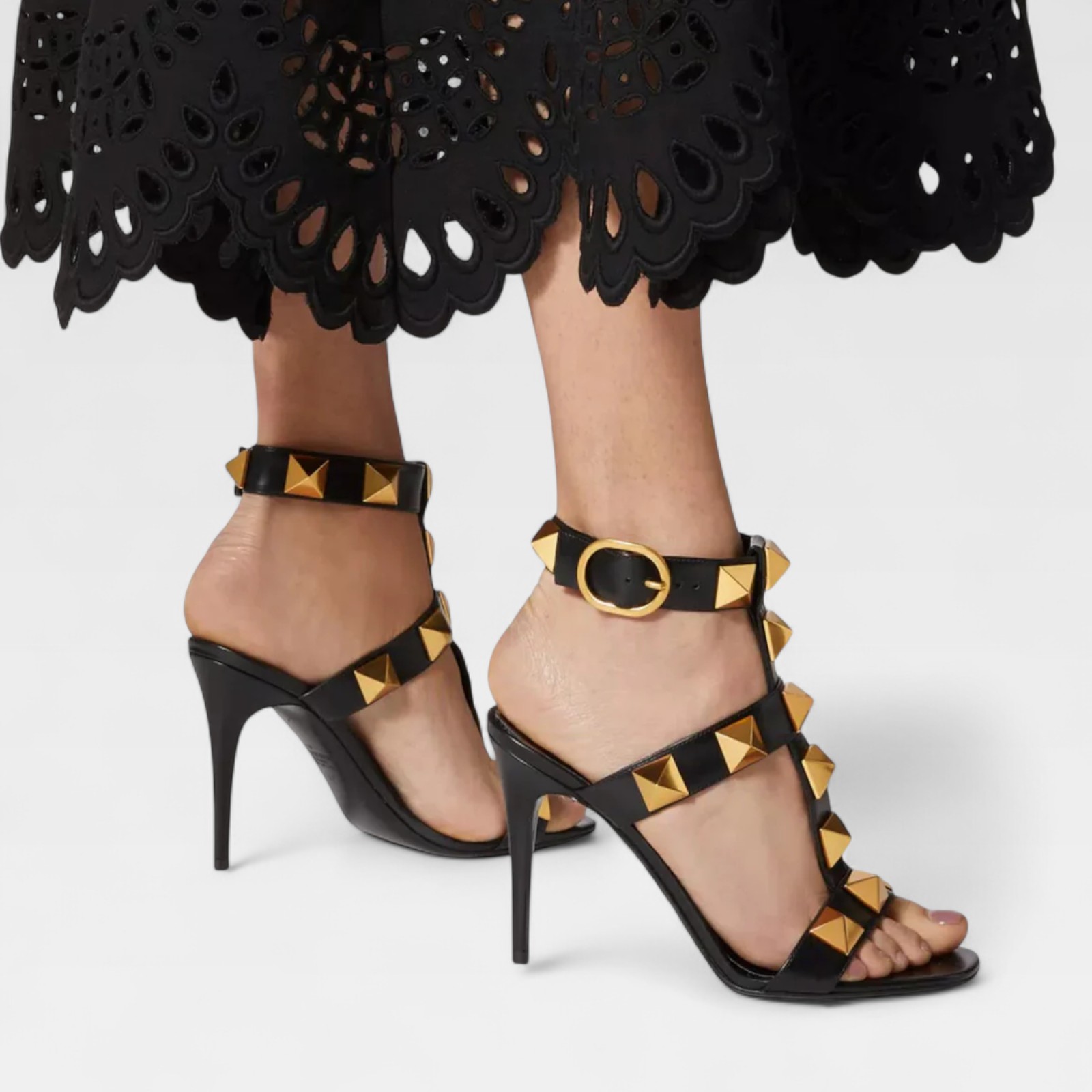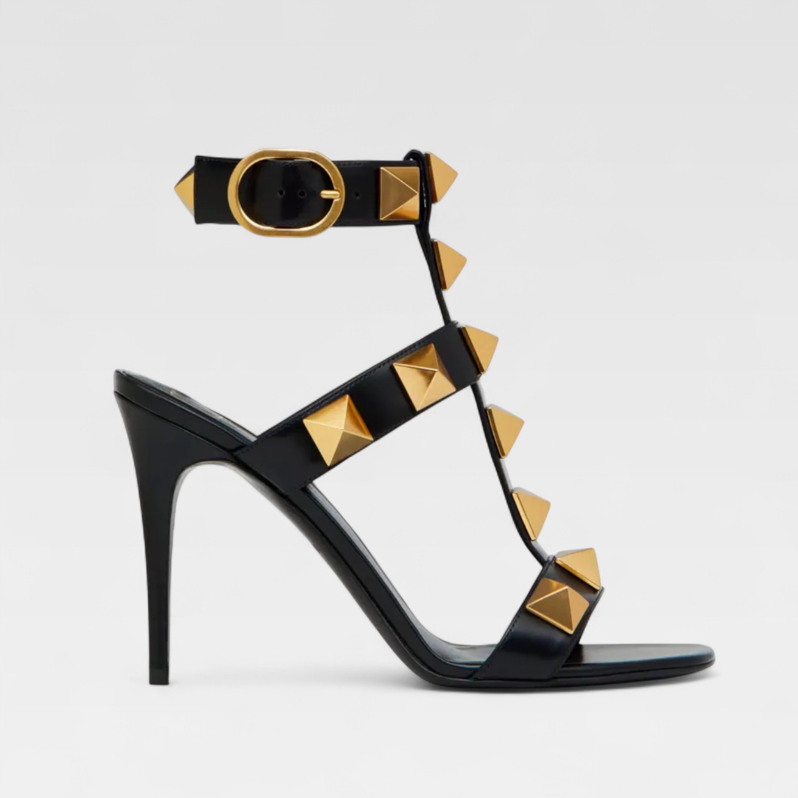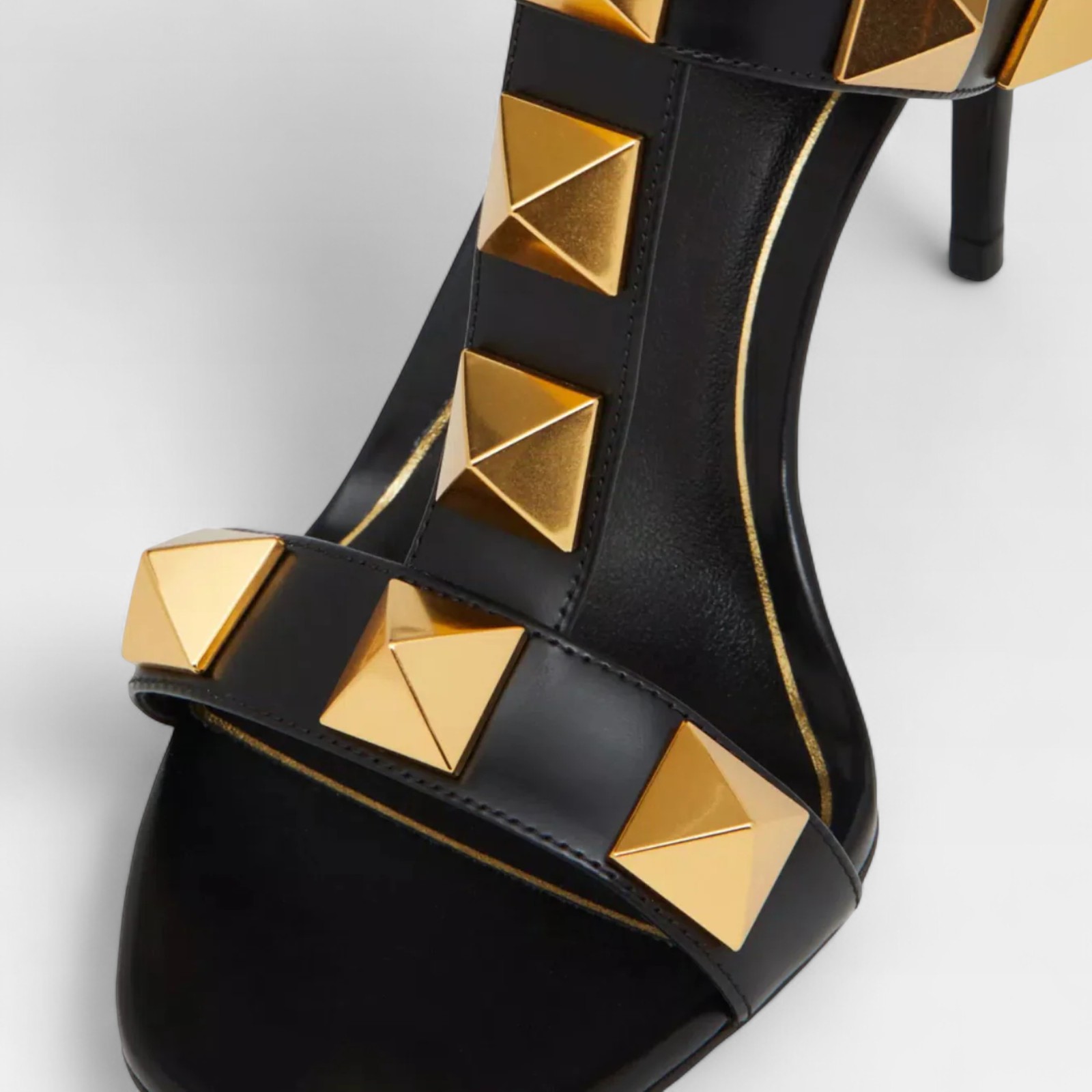 Sculptural design with character. These Valentino sandals are crafted in shiny black leather and decorated with the distinctive Roman Studs in matte gold. Their strappy structure generates a graphic effect on the foot, while the high heel stylizes the figure. A model designed to stand out with firmness and elegance.