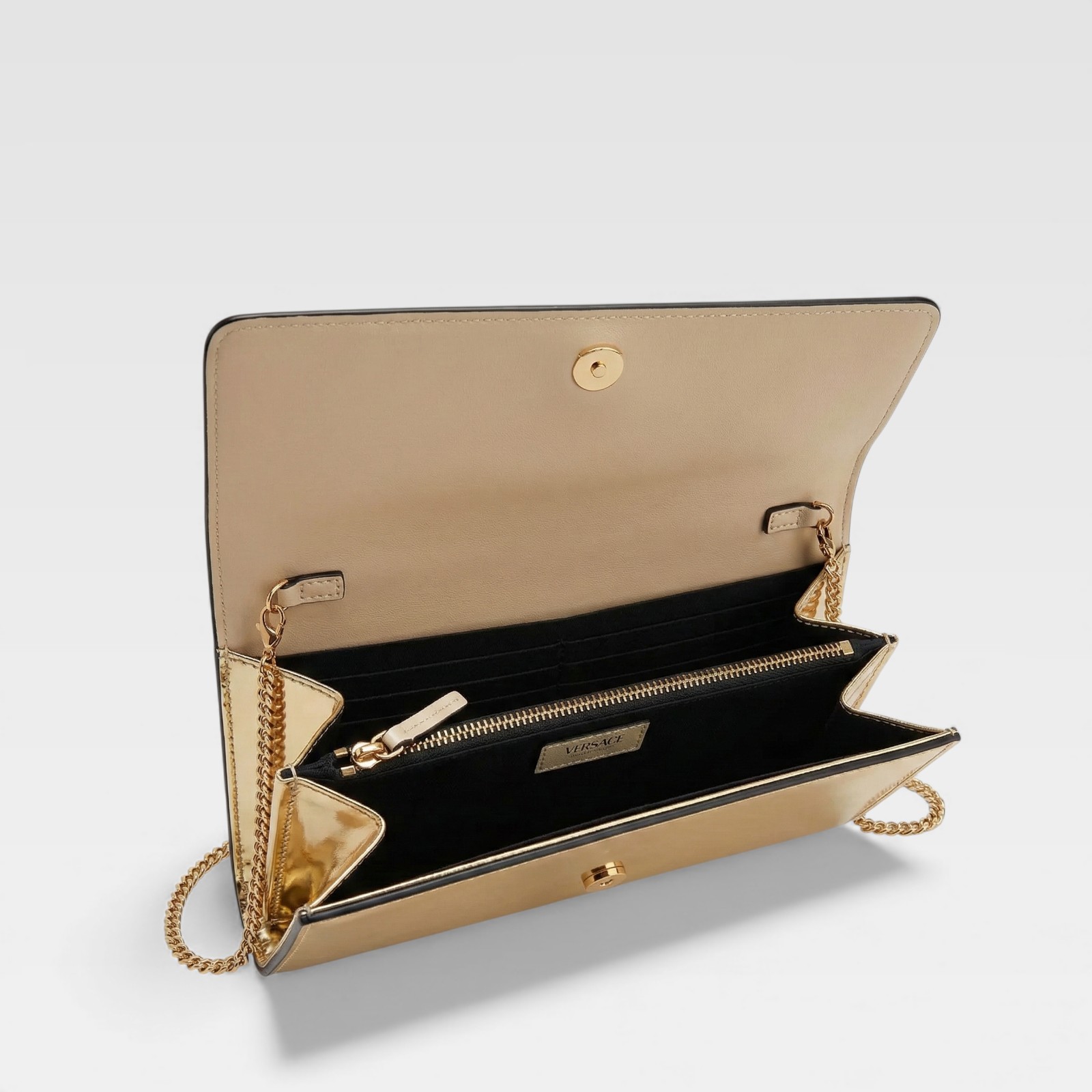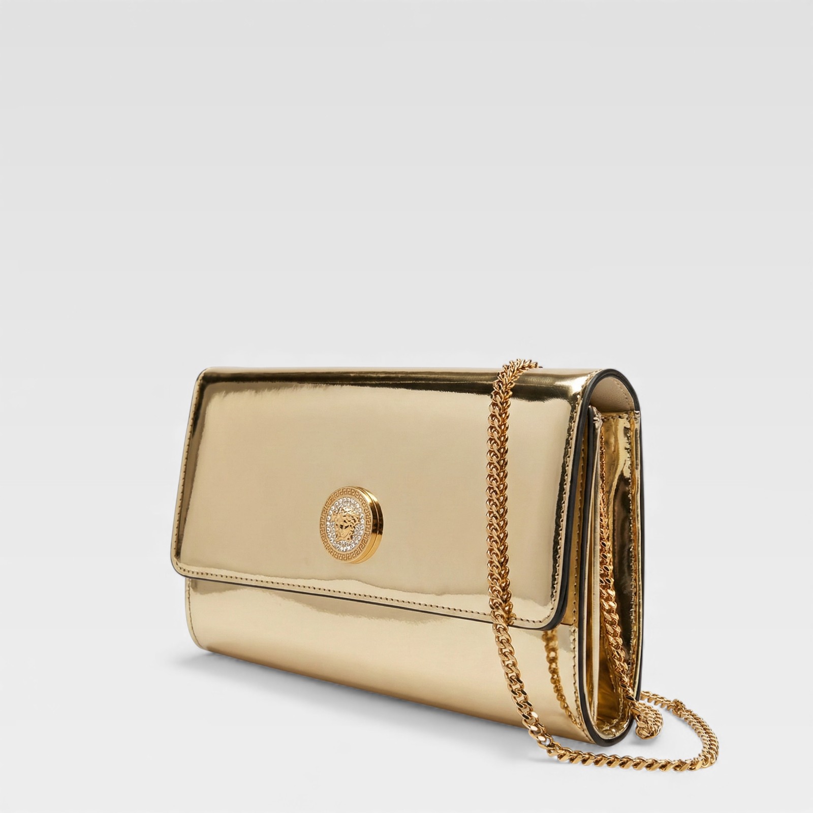 Sleek and bold design in one accessory. This Versace clutch is crafted in smooth gold-tone leather and decorated with the iconic Medusa medallion embossed in tone-on-tone. Its compact format makes it an ideal piece for evening outings or special events, and it can be carried in the hand or over the shoulder thanks to the removable strap.