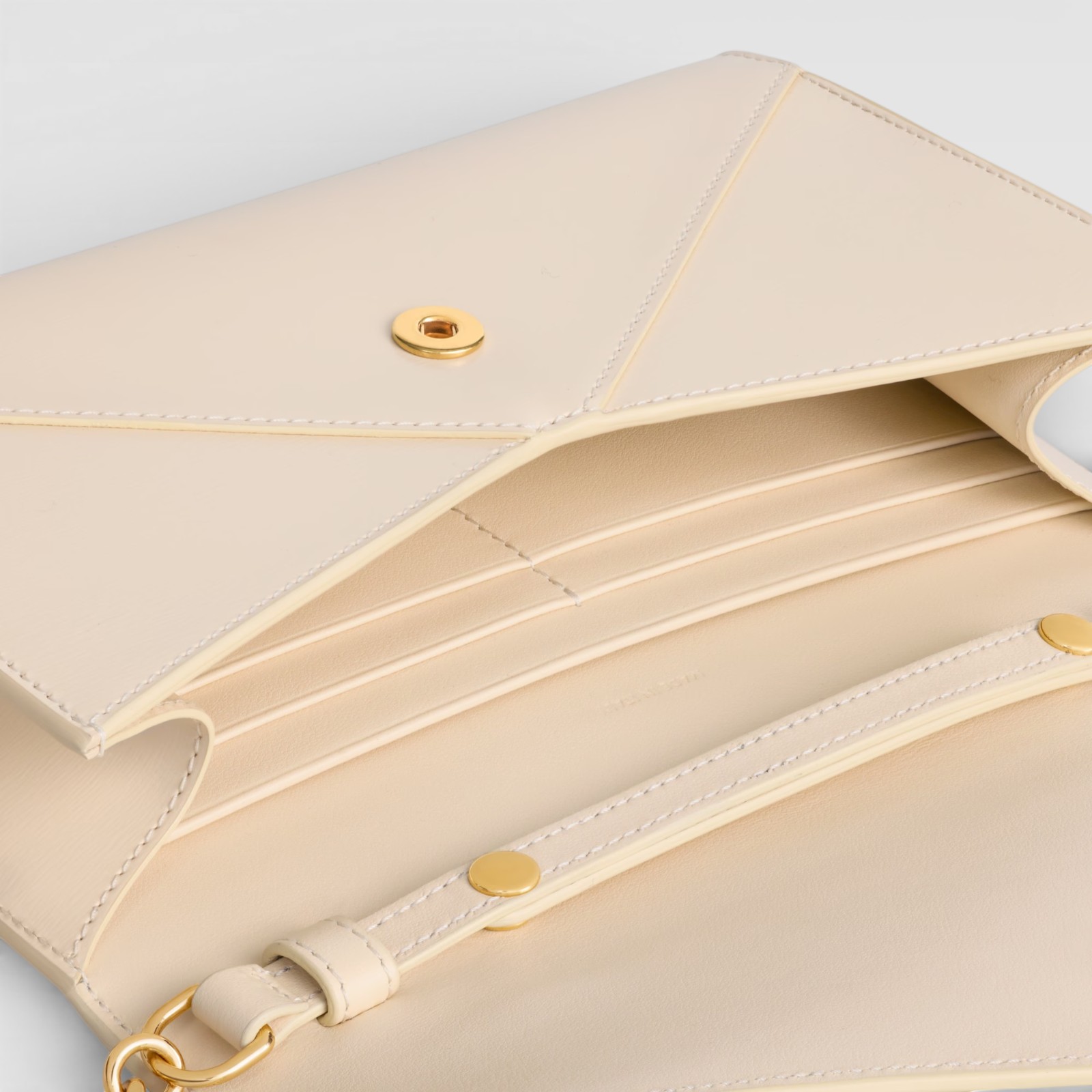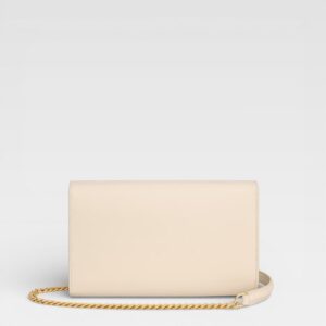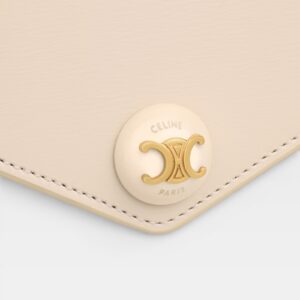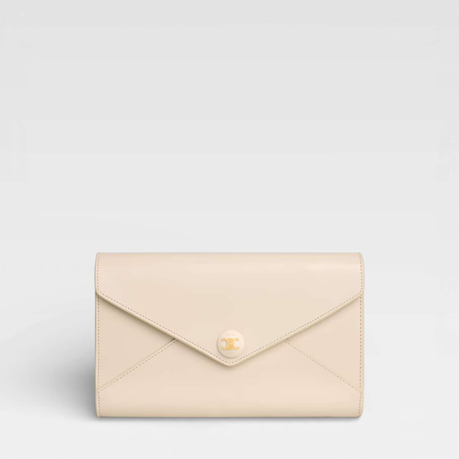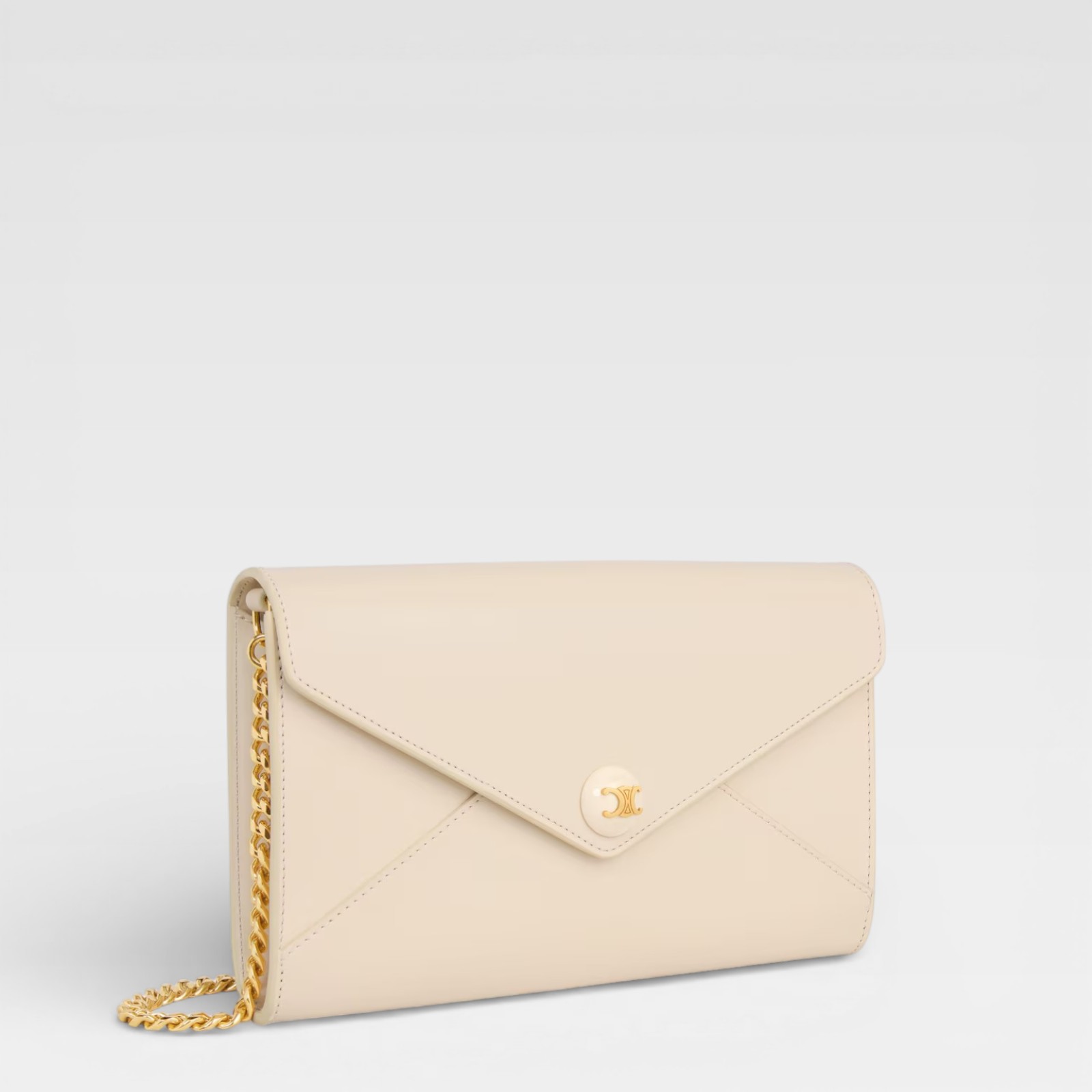 Diseño elegante y estructurado en formato compacto. Esta Envelope Wallet on Chain de Celine está confeccionada en cuero de becerro brillante en tono cream, con una silueta tipo sobre y líneas limpias. El cierre frontal presenta el icónico motivo Triomphe metálico en dorado, que aporta identidad y contraste. Incluye una cadena fina que permite llevarla al hombro o cruzada, combinando funcionalidad y estilo en una sola pieza.