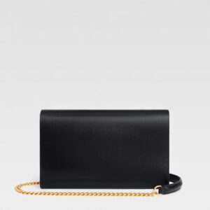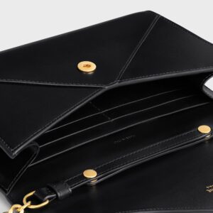 Diseño sobrio con líneas definidas, esta cartera tipo sobre de Celine está confeccionada en cuero de becerro brillante color negro. Su estructura limpia y geométrica se realza con un cierre frontal adornado por el emblemático botón dorado Triomphe sobre fondo negro. Ideal para usar como cartera o mini bolso de noche gracias a su formato elegante y compacto.