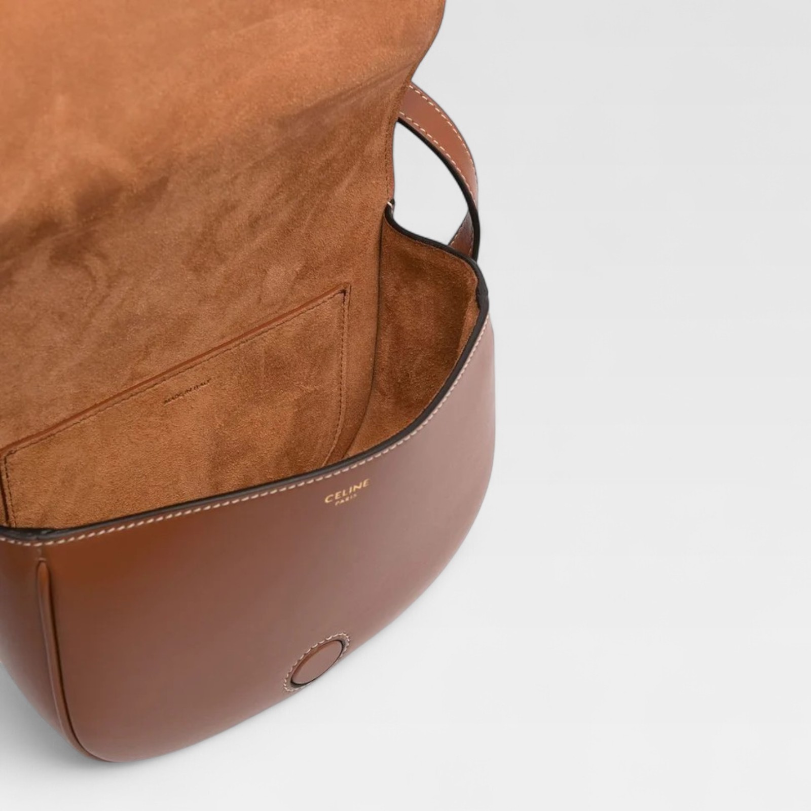 Un diseño distintivo con un aire sobrio y contemporáneo. El Folco Triomphe de Celine está confeccionado en cuero de becerro liso color marrón y decorado con el icónico logo Triomphe en relieve, integrado en la misma piel del bolso. Su silueta redondeada y líneas limpias lo hacen una pieza versátil para el uso diario, con una correa ajustable que permite llevarlo cómodamente al hombro o cruzado.