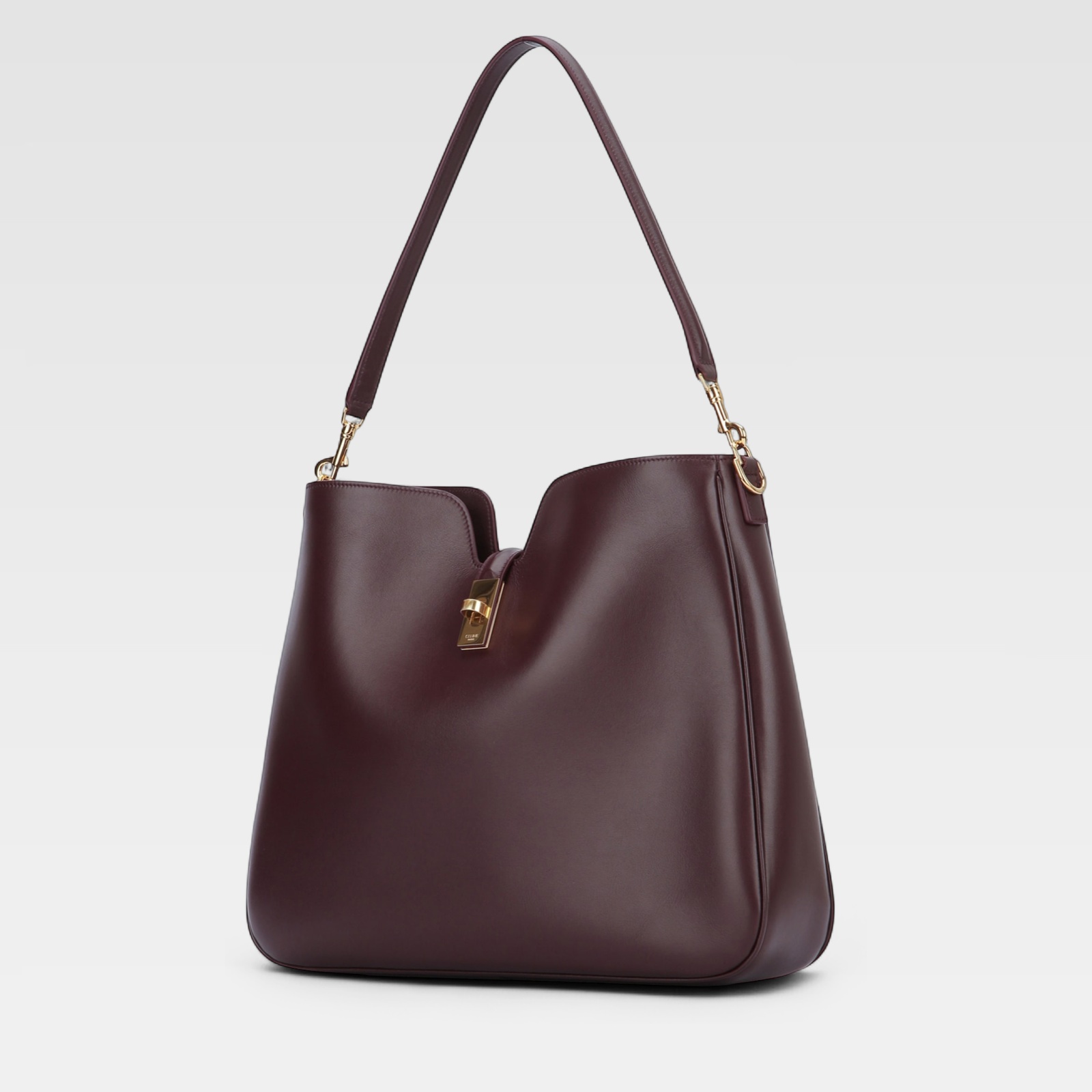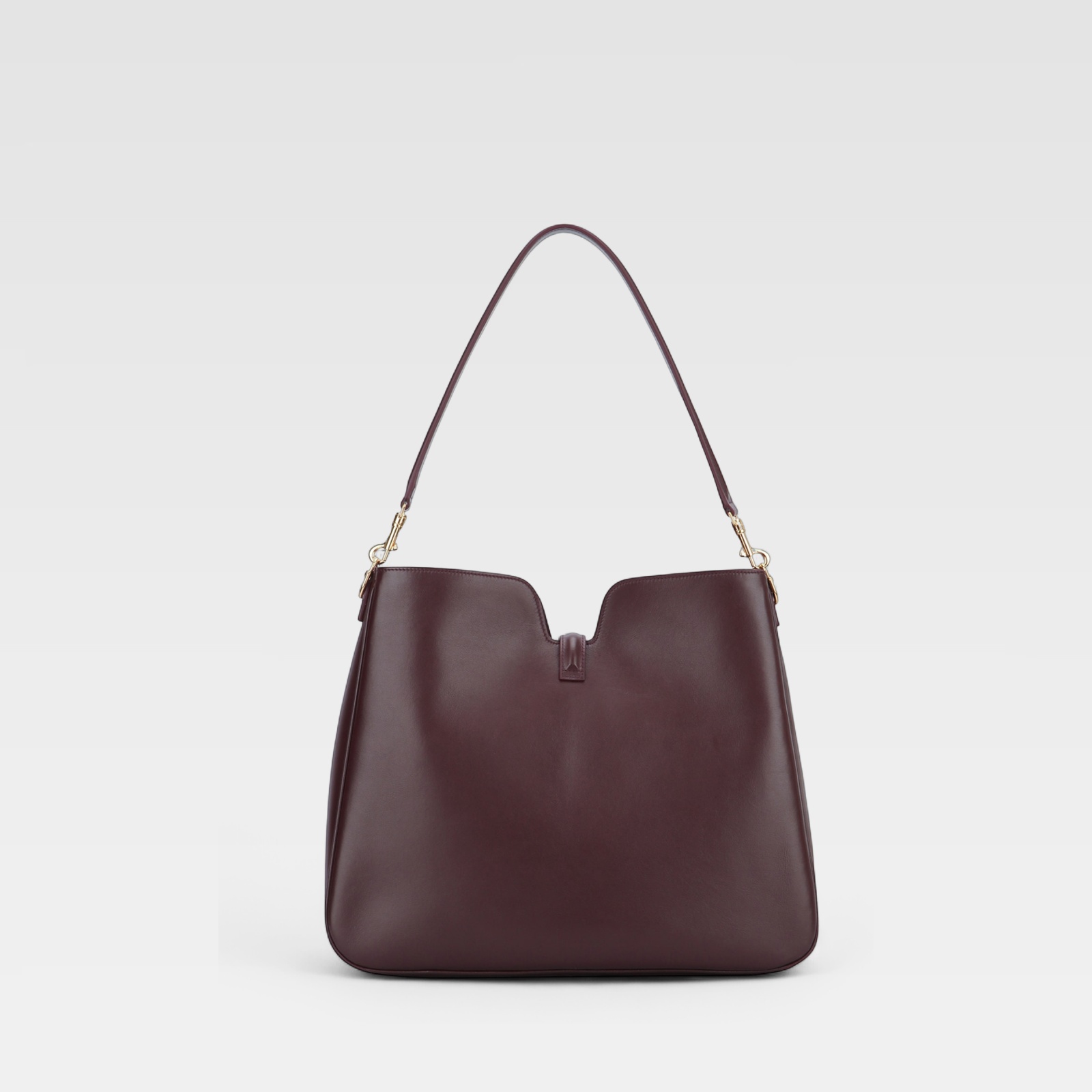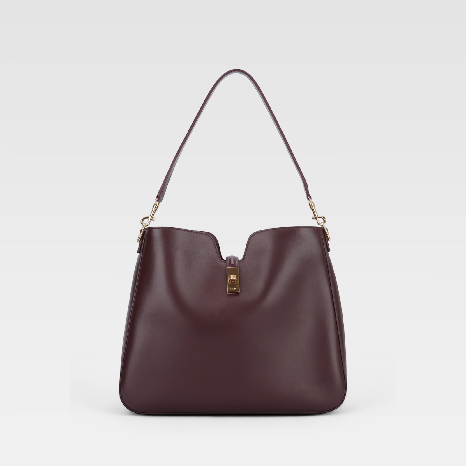 Bolso confeccionado en cuero liso burdeos, con estructura suave y silueta sofisticada. Presenta un cierre frontal con broche dorado y distintivo detalle metálico. El diseño de asa única permite llevarlo cómodamente al hombro, ideal para un estilo elegante y contemporáneo.
