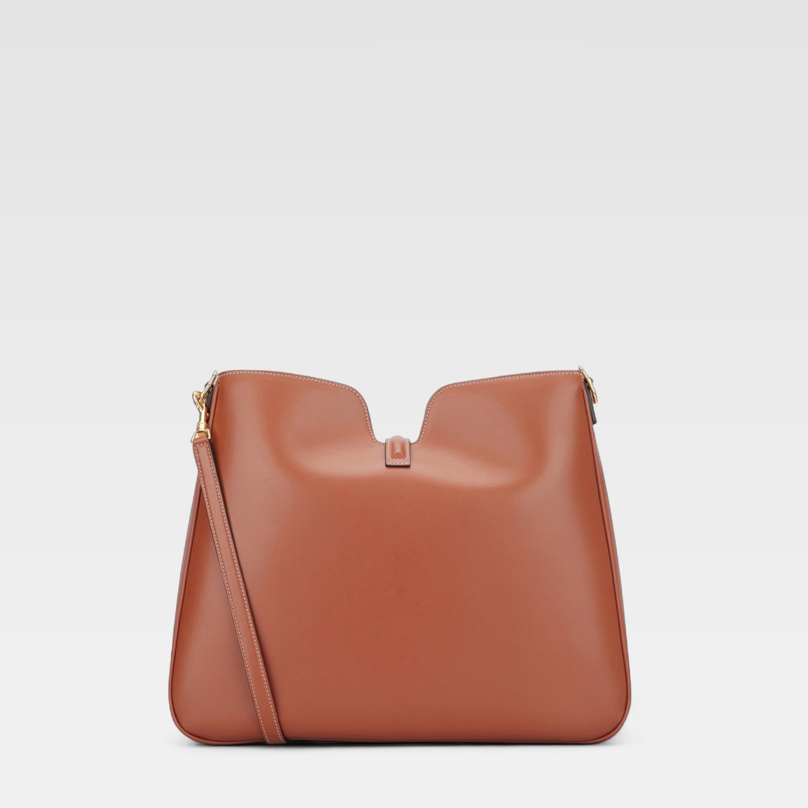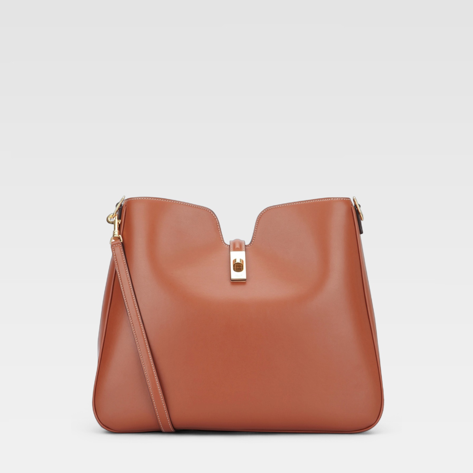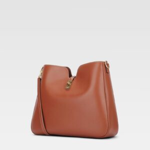 Este bolso presenta un diseño elegante en cuero liso marrón, con silueta estructurada y líneas suaves. Incorpora una correa larga para llevar al hombro y un distintivo cierre metálico dorado en la parte frontal, logrando un equilibrio entre modernidad y sofisticación.