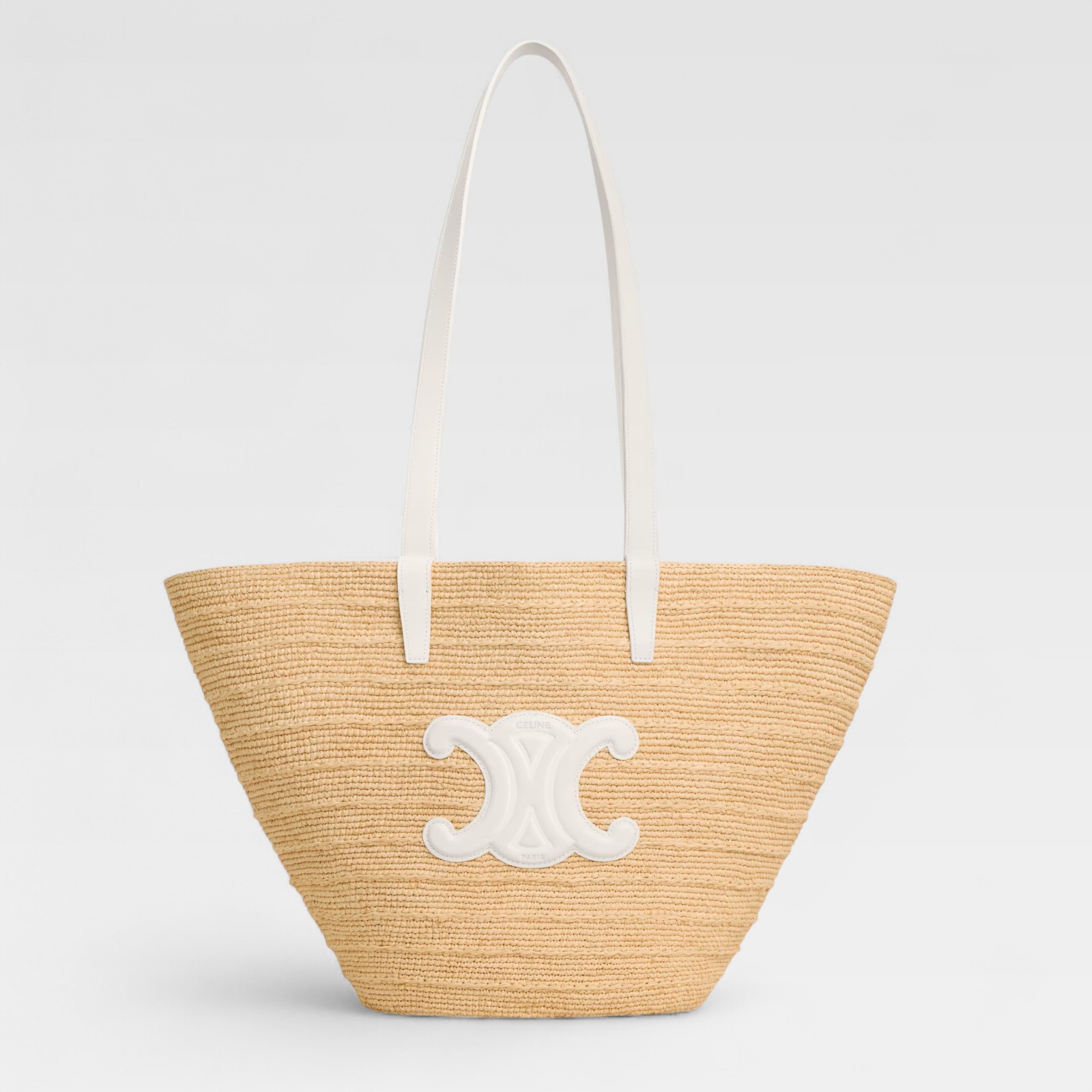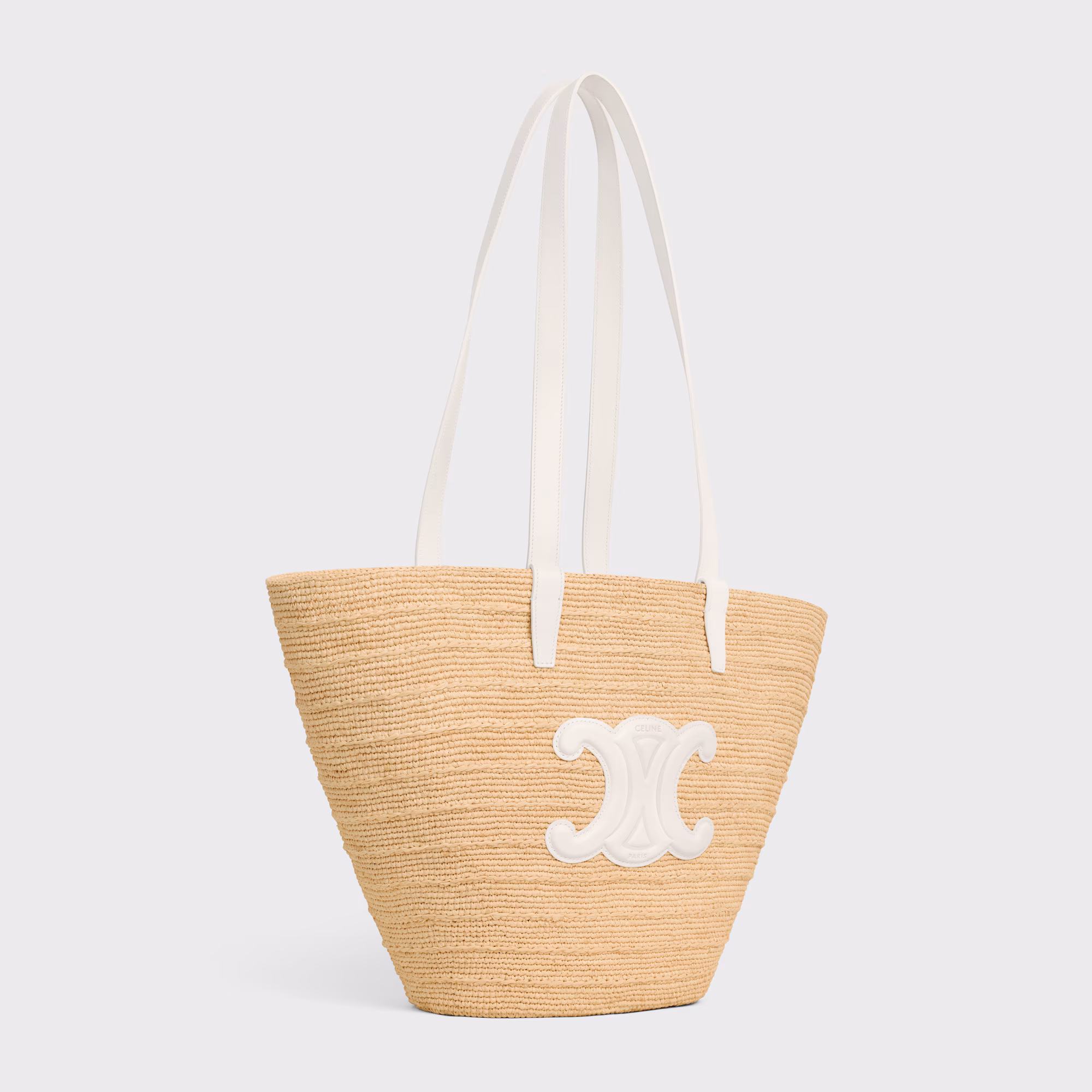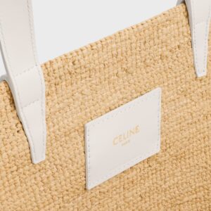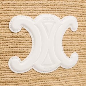 Diseño veraniego con el sello inconfundible de Celine. Este bolso tipo panier mediano está confeccionado en rafia natural trenzada, con asas largas en piel blanca que permiten llevarlo cómodamente al hombro. En el frente, un aplique en piel con el icónico logo Triomphe aporta contraste y carácter. Ideal para días de verano, salidas relajadas o looks de inspiración mediterránea.