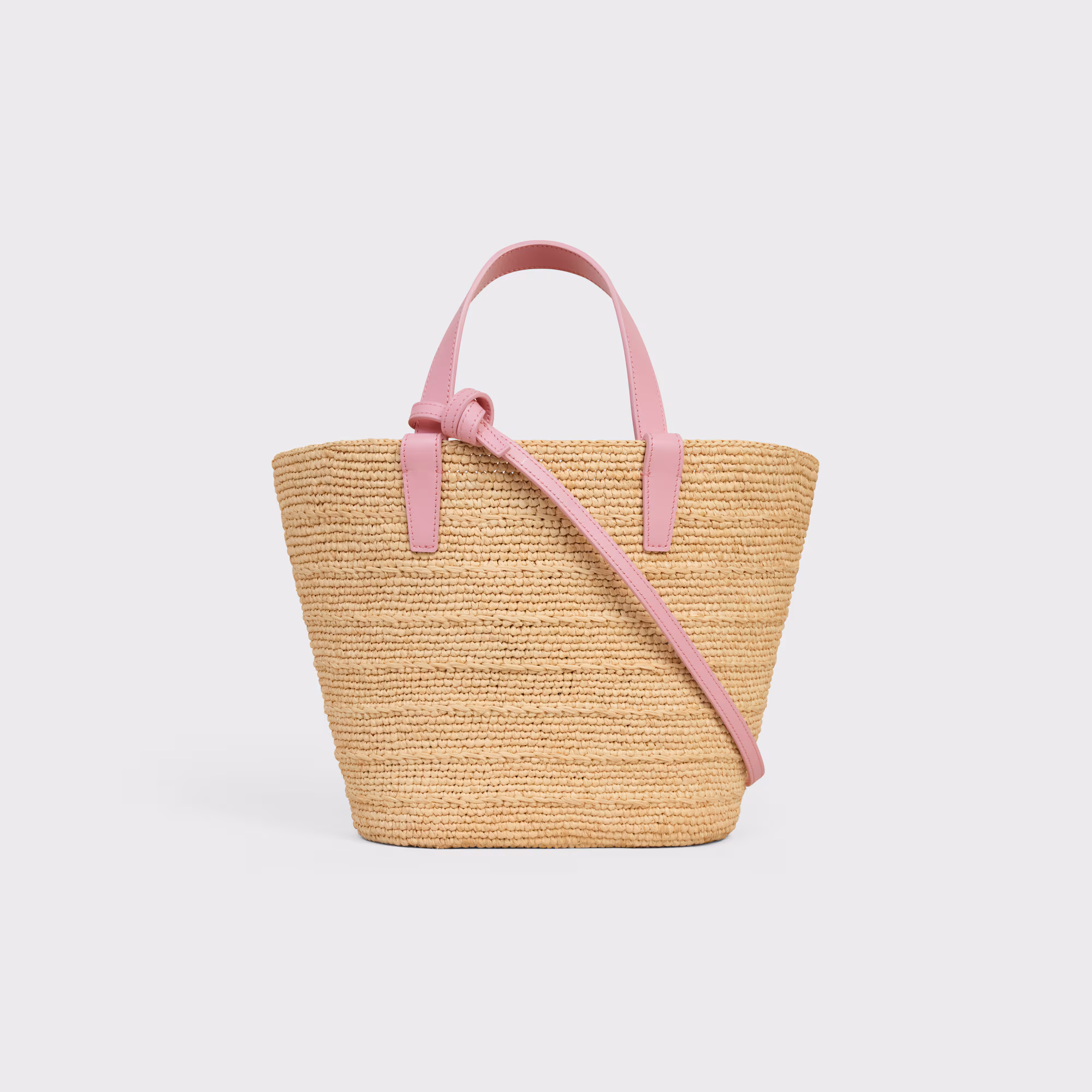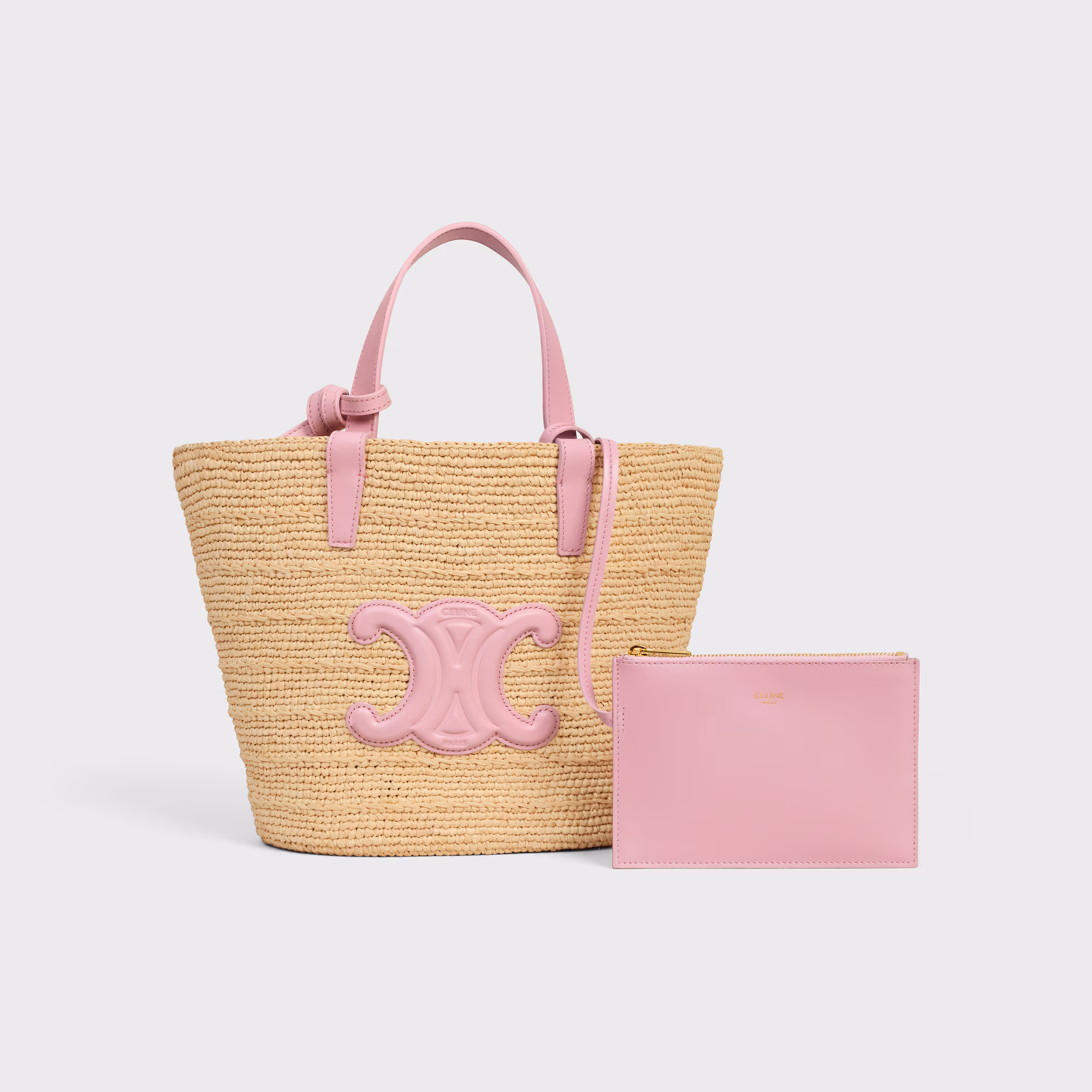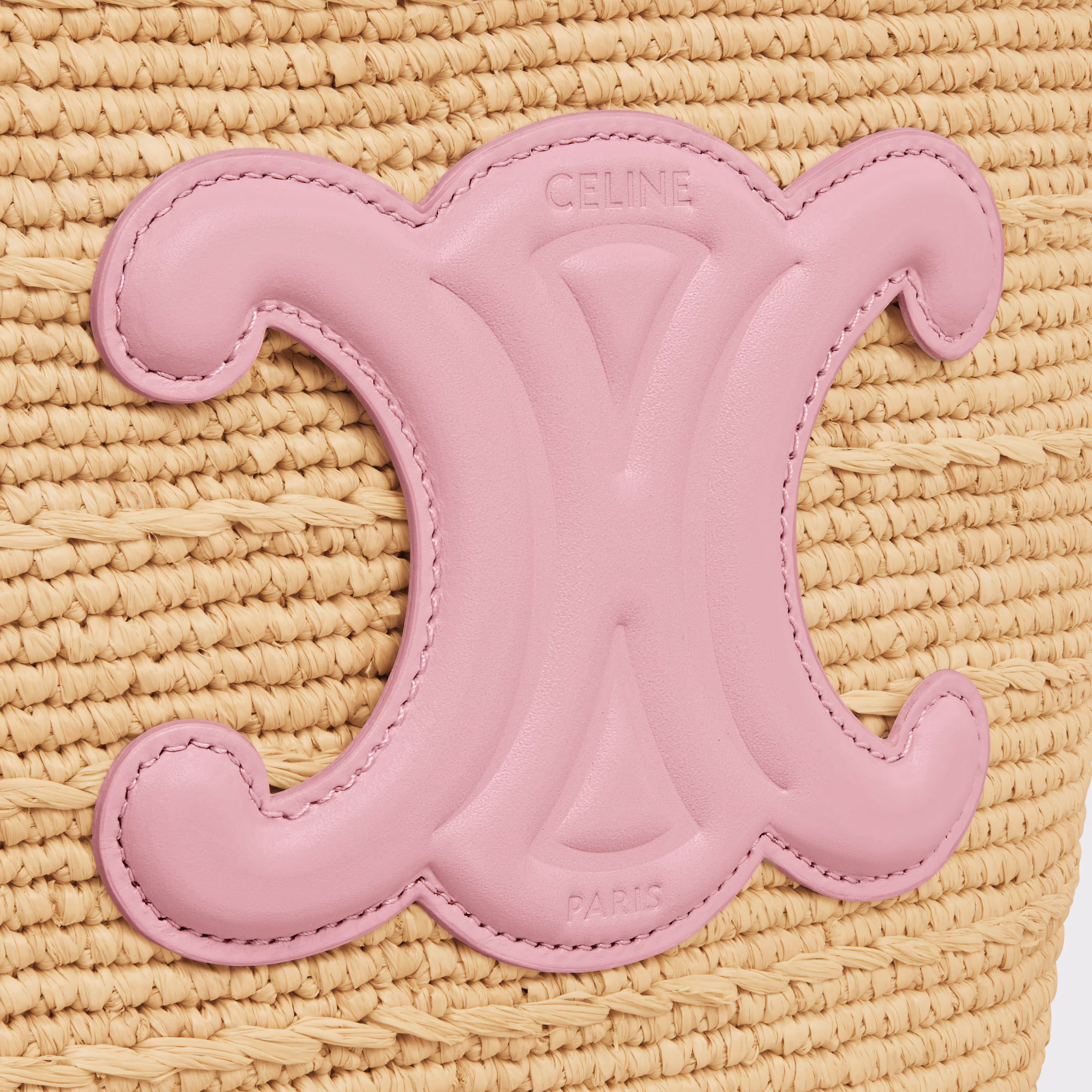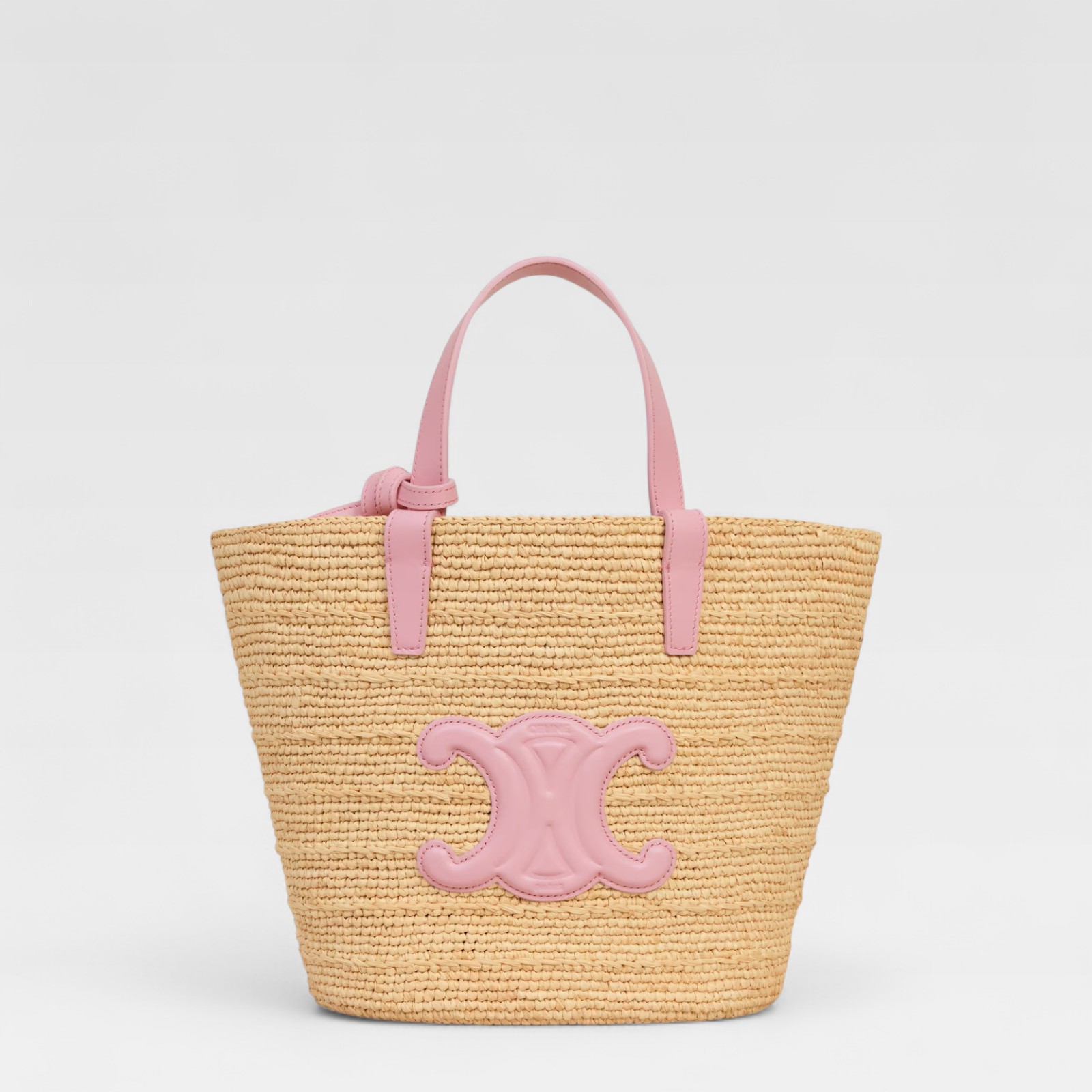 Un diseño fresco y femenino que combina tradición artesanal con el sello icónico de Celine. Este bolso tipo panier en tamaño teen está confeccionado en rafia natural trenzada, con asas cortas en piel rosa que le aportan un contraste delicado. El aplique frontal con el logo Triomphe en piel a tono refuerza su identidad, convirtiéndolo en el accesorio perfecto para looks de verano o escapadas casuales.