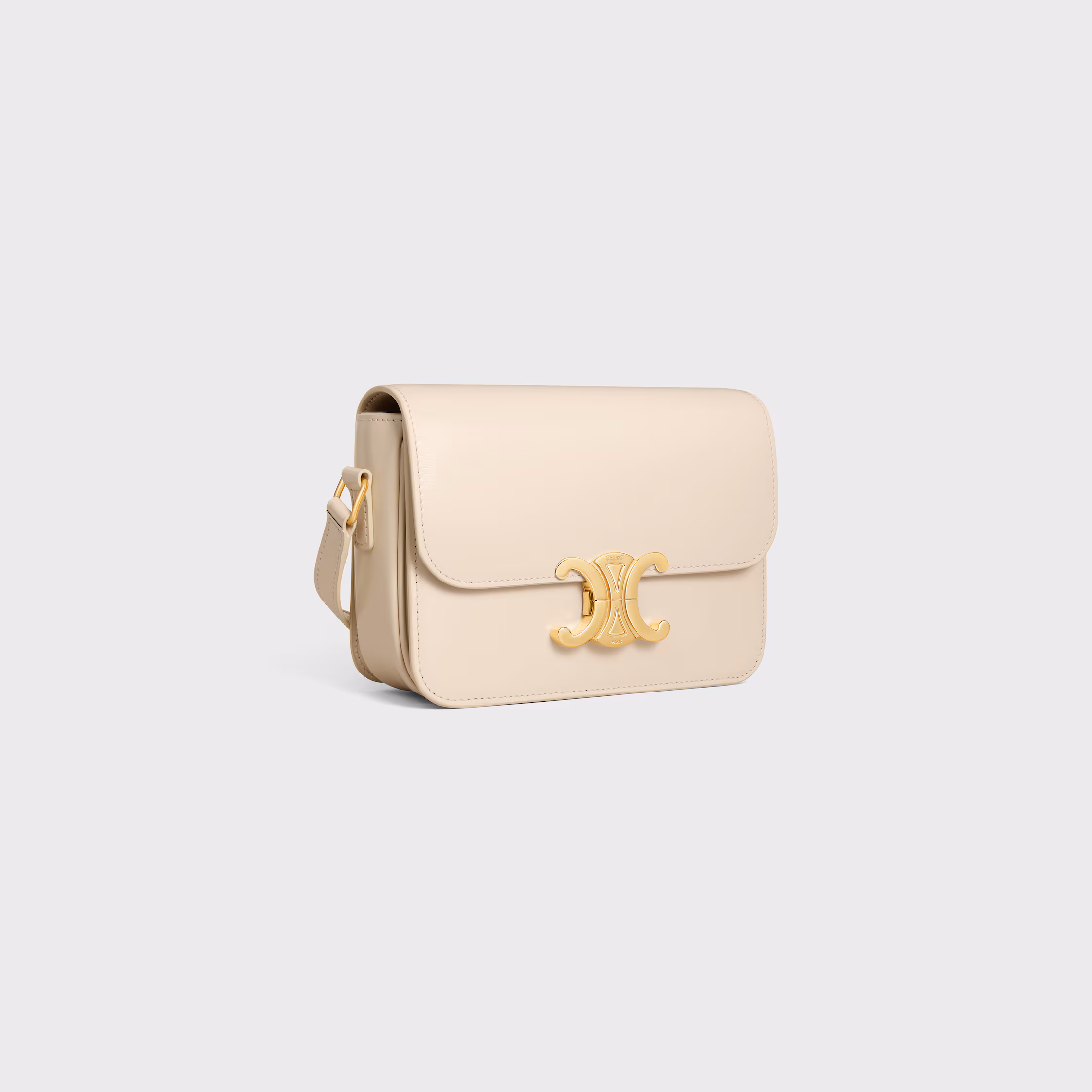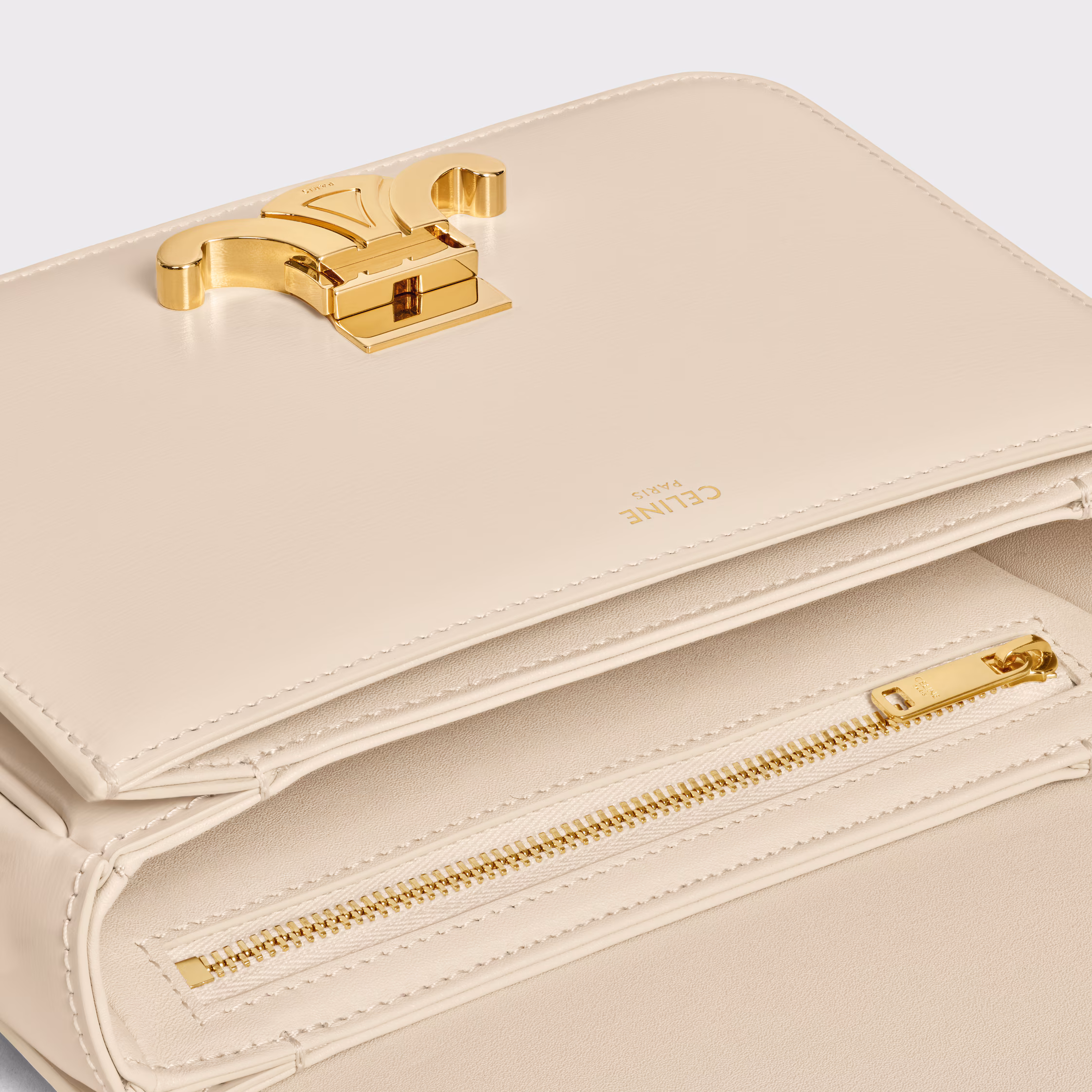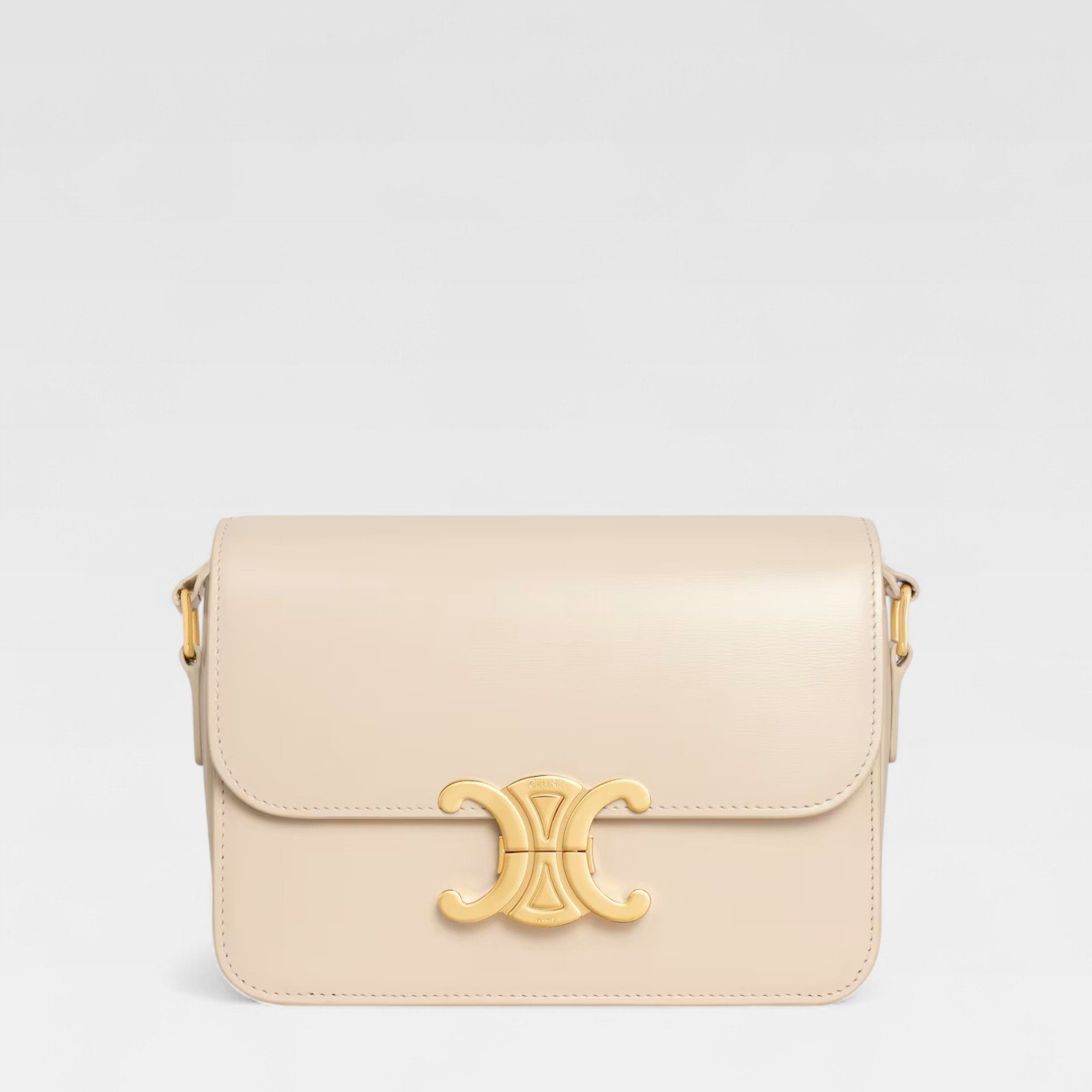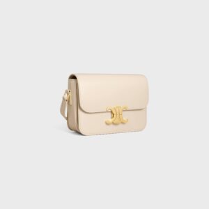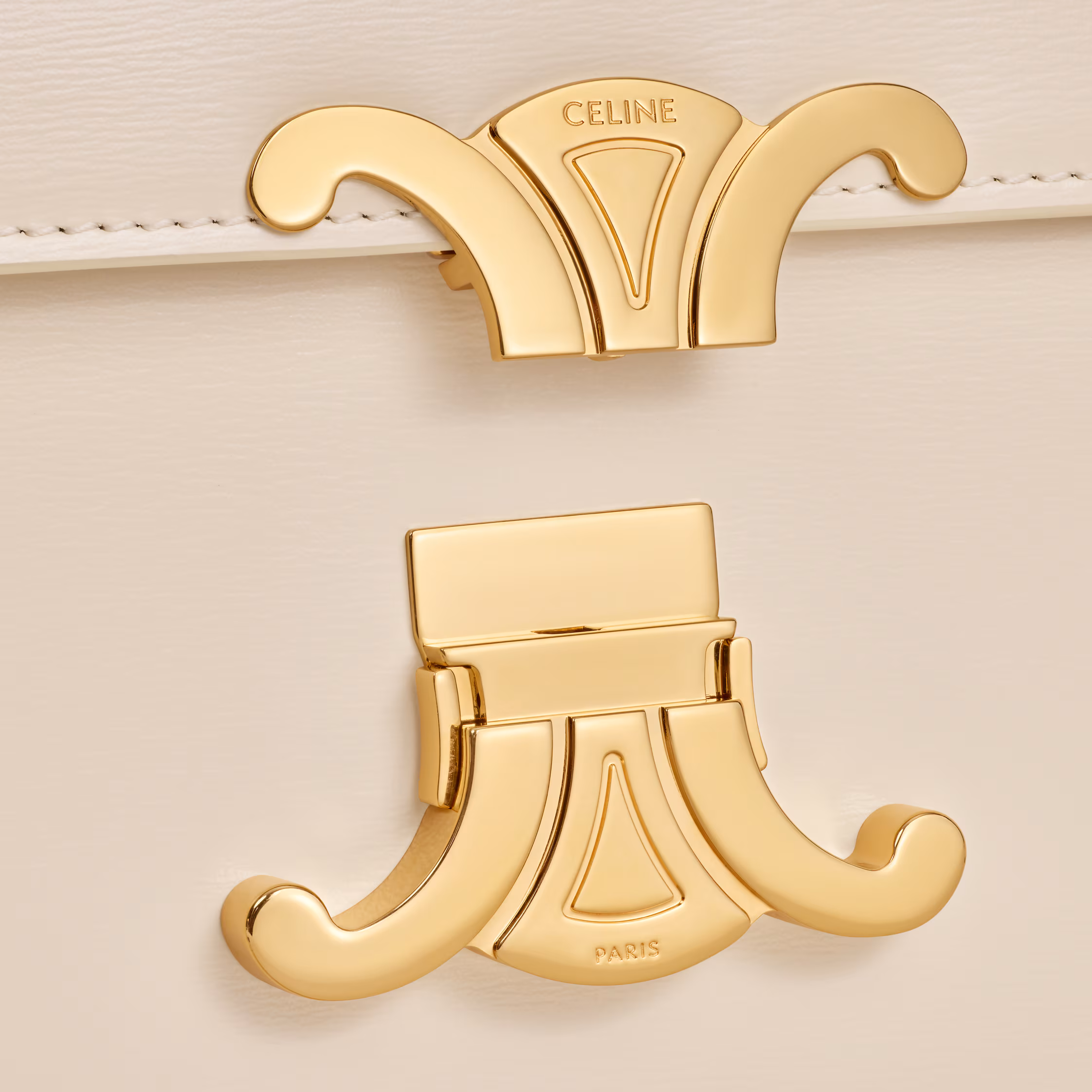 Refinado y atemporal, el Teen Triomphe de Celine es un símbolo de elegancia discreta. Confeccionado en cuero de becerro brillante color beige claro, presenta líneas limpias y una estructura compacta que equilibra modernidad y clasicismo. El cierre frontal dorado con el emblema Triomphe aporta el sello inconfundible de la maison. Perfecto para acompañar looks de día o de noche con sobriedad y estilo.