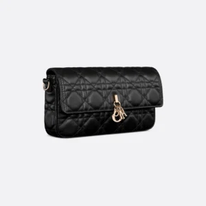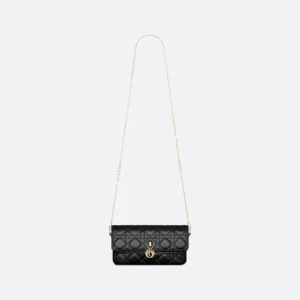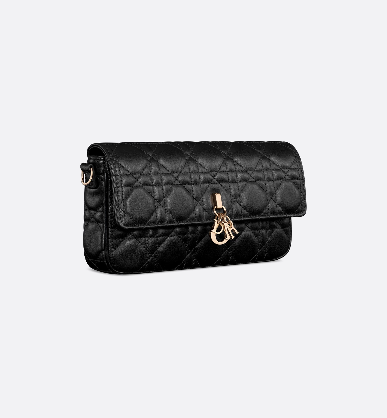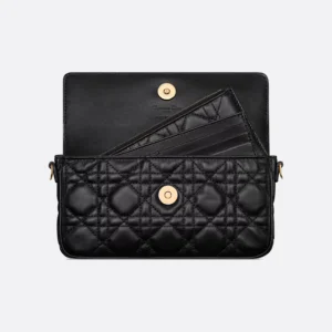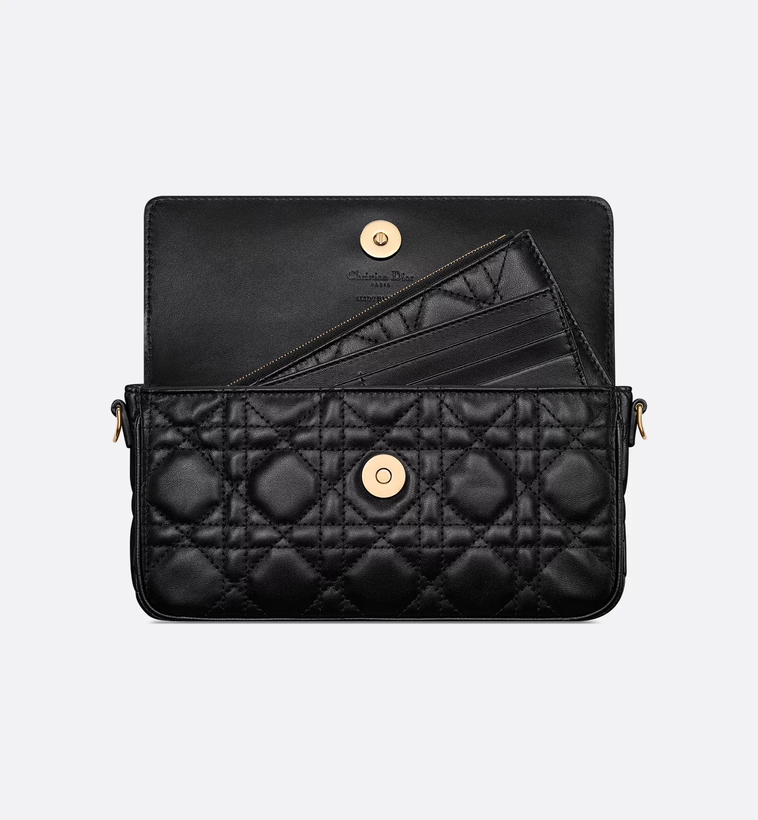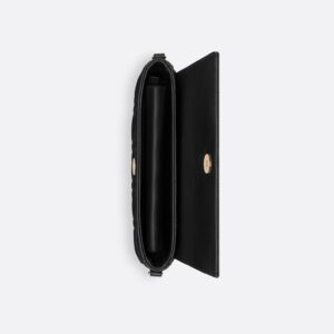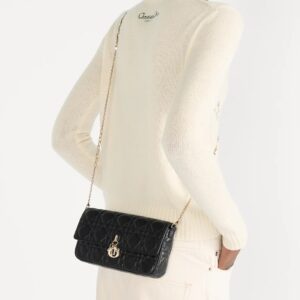 Confeccionado en piel suave color negro y trabajado con el emblemático pespunte Cannage, el bolso Dior My Dior está confeccionado en piel negra con el distintivo pespunte Cannage de la maison. Su solapa frontal con botón magnético está adornada con el charm metálico colgante ‘D.I.O.R.’, que aporta movimiento y carácter. En el interior, se encuentra una cartera integrada con múltiples ranuras para tarjetas y un bolsillo con cremallera, todo organizado con precisión. Ideal como clutch o para usar con correa (no incluida en las imágenes).