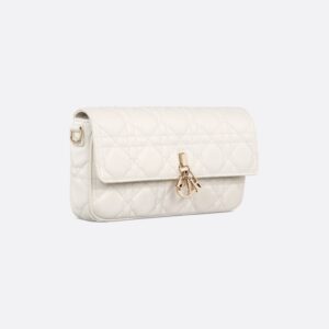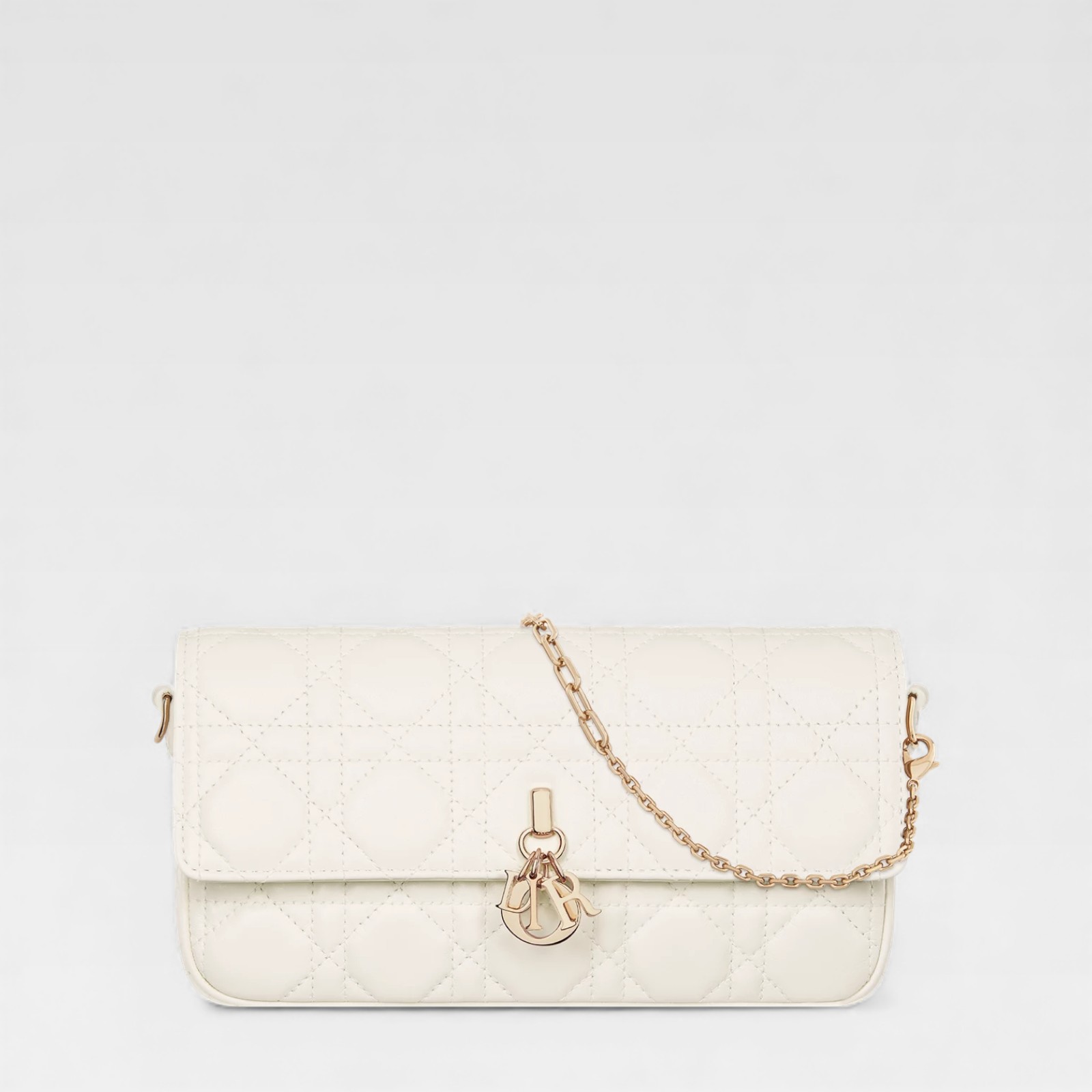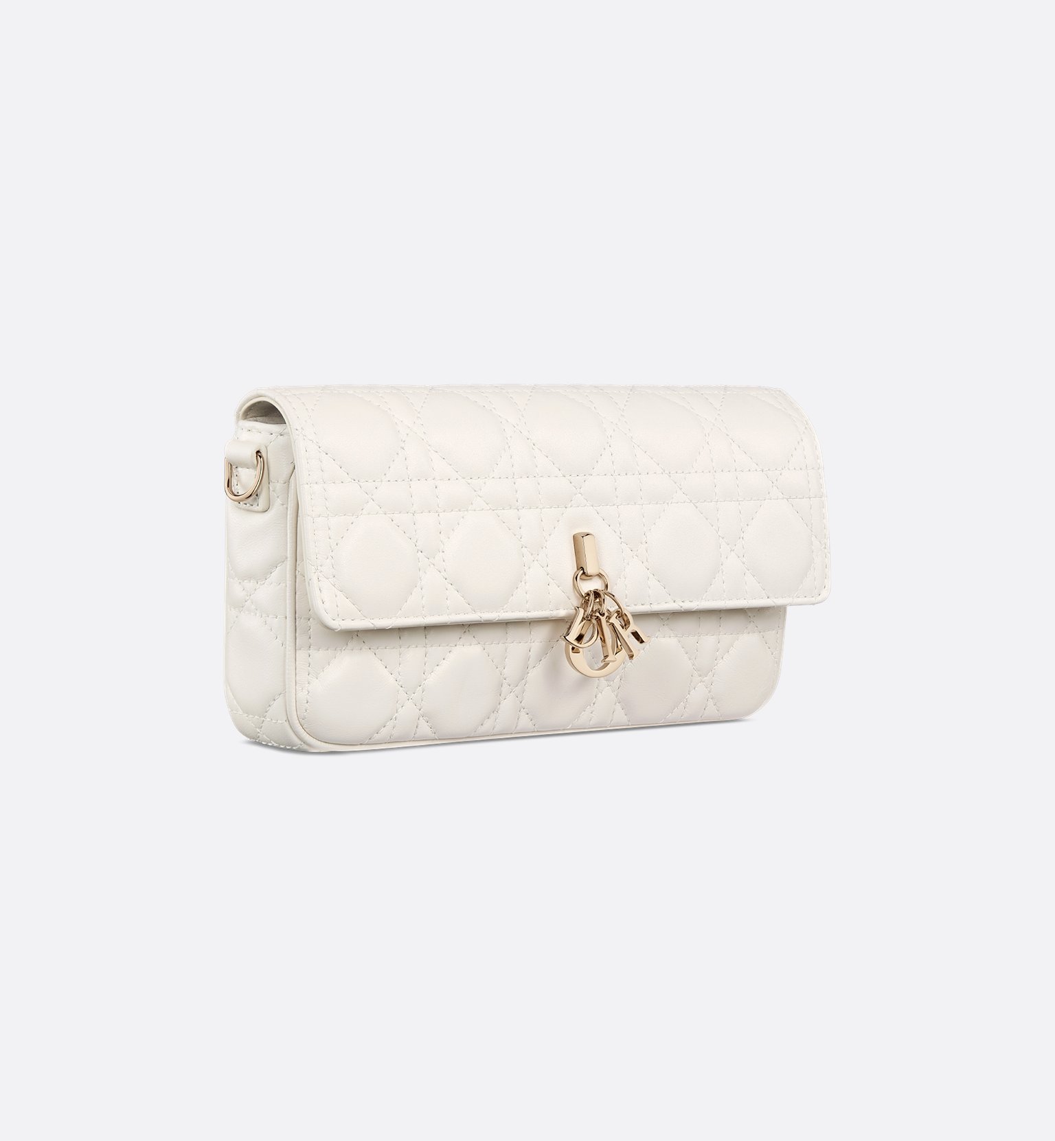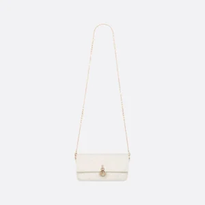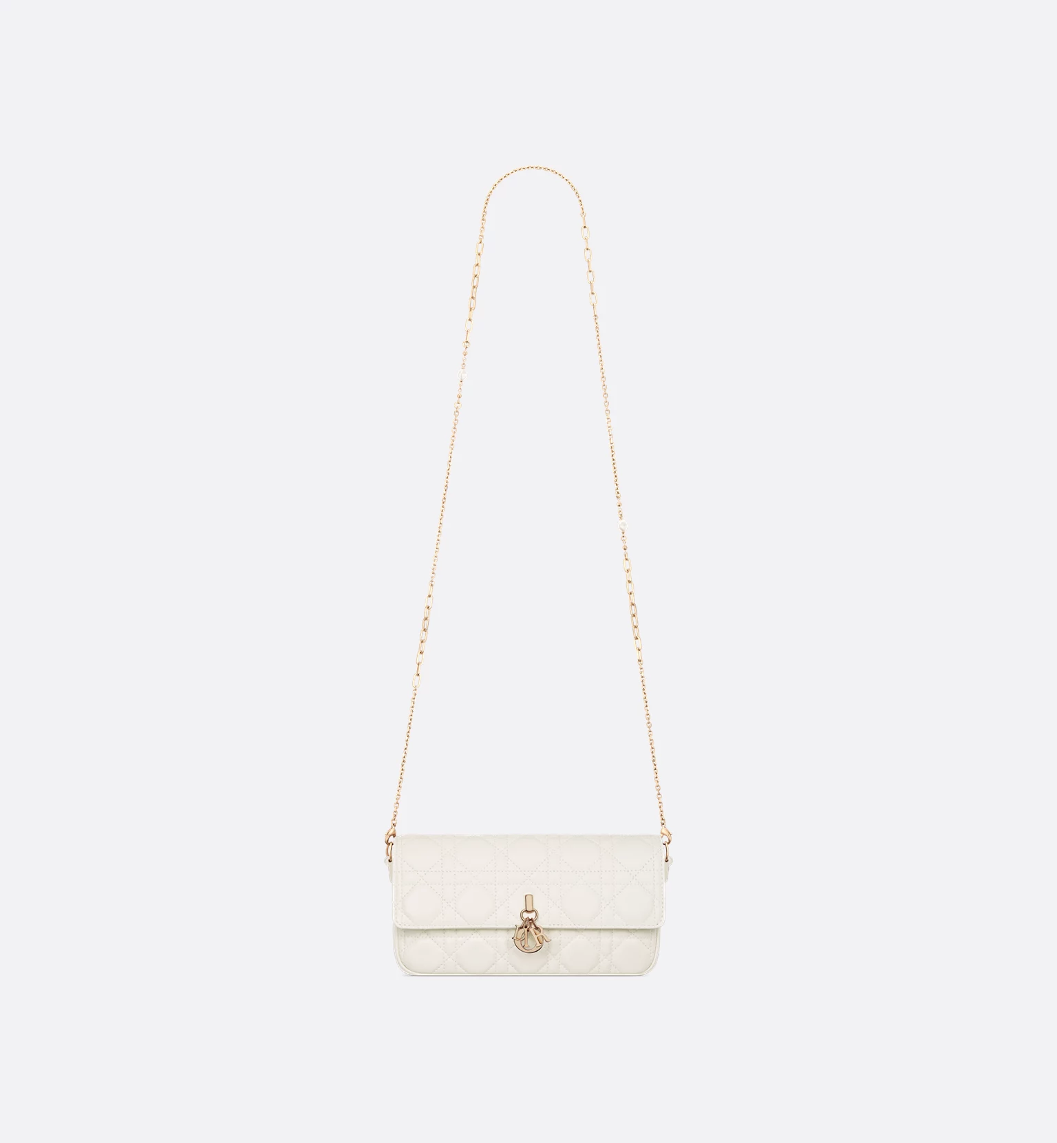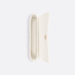 Elegante y compacto, el bolso My Dior en color crema está confeccionado en piel suave con el emblemático pespunte Cannage que caracteriza a la maison. Su diseño tipo sobre con solapa estructurada se complementa con un charm colgante ‘D.I.O.R.’ en dorado y una cartera interna desmontable con ranuras organizadoras. Ideal para llevarlo como clutch o al hombro con la cadena metálica (no visible en imagen, pero incluida en el modelo).