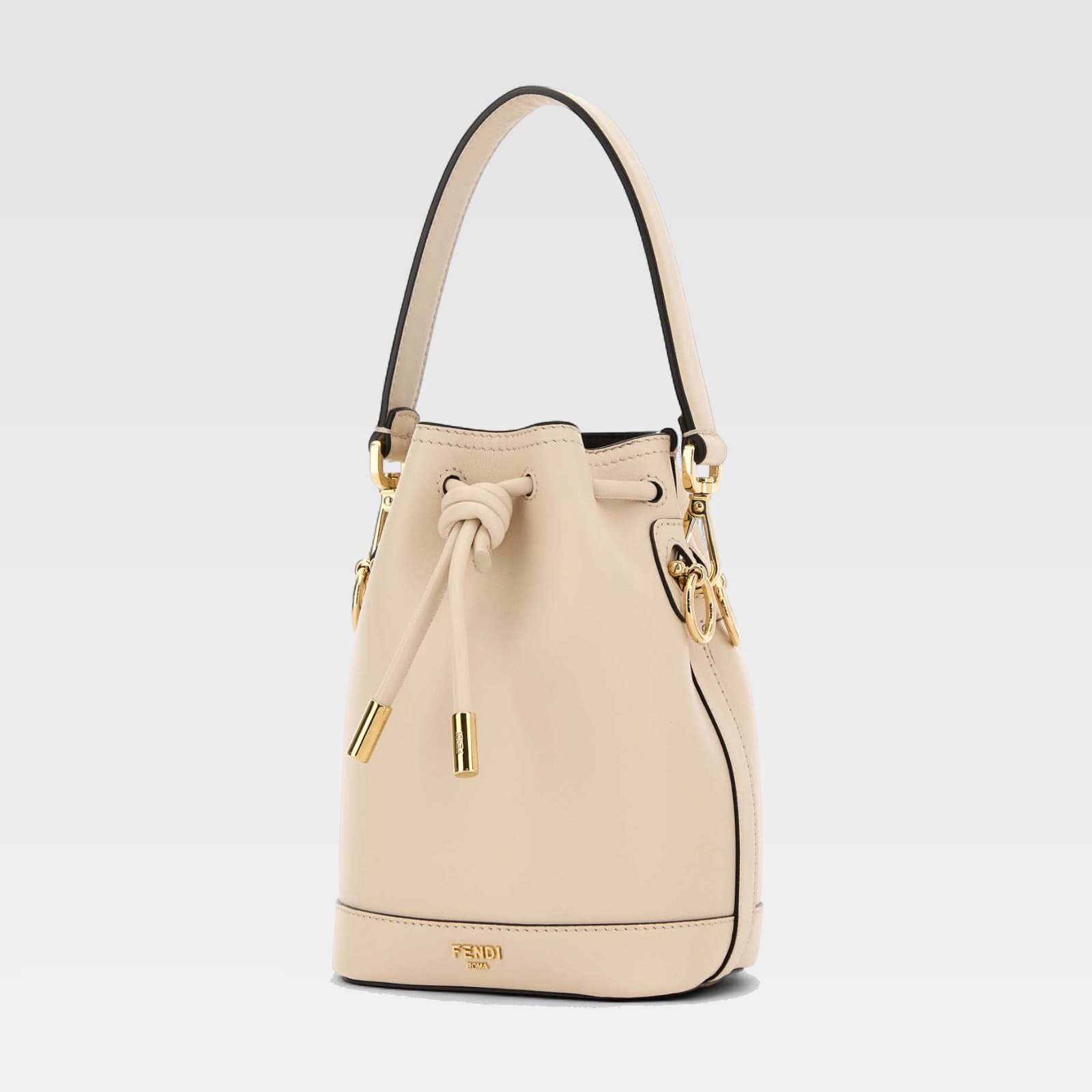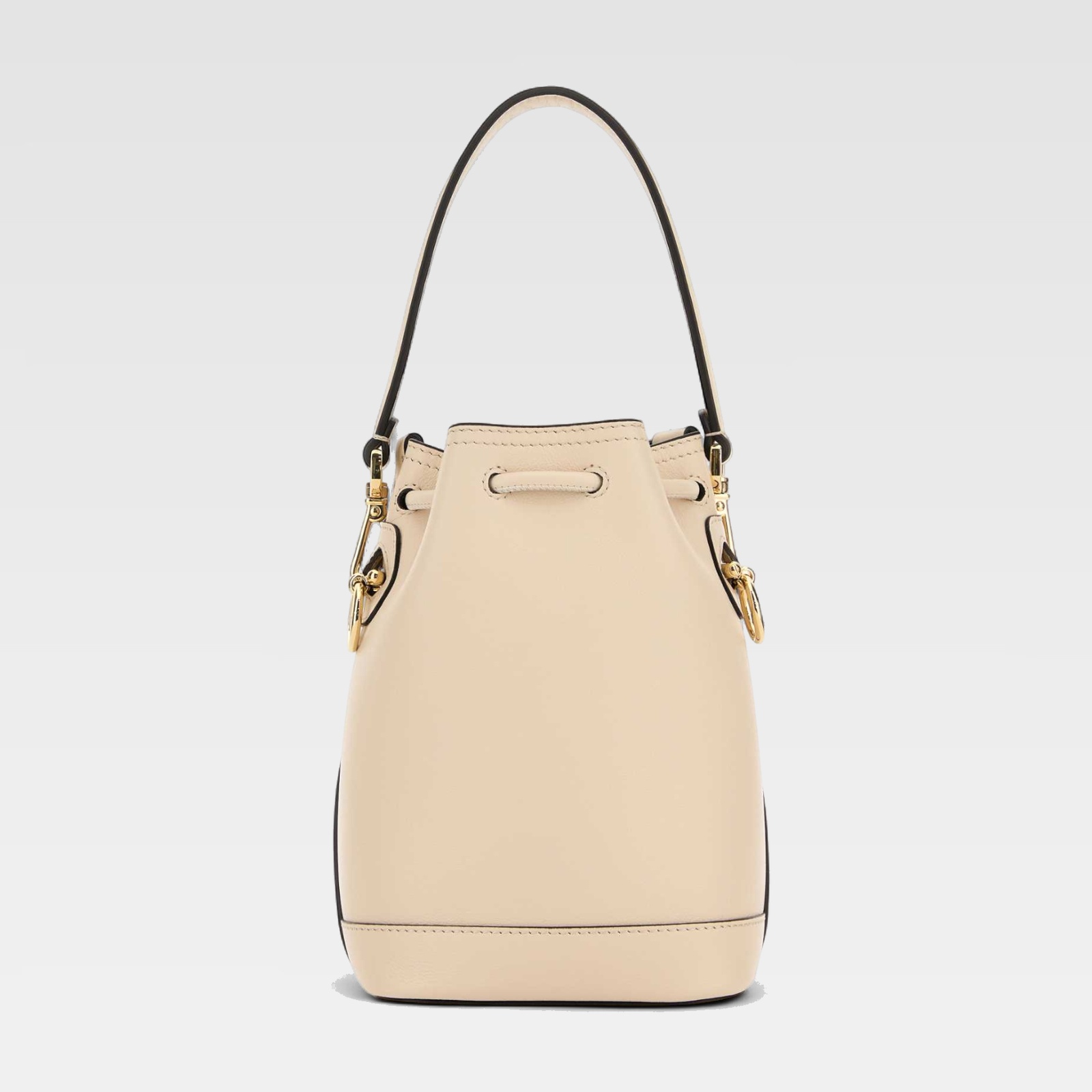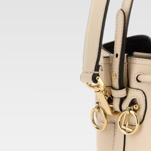 Bolso de estructura compacta confeccionado en piel lisa, con un diseño tipo cubo y cierre de cordón. El asa corta permite llevarlo cómodamente en la mano o al hombro, realzado con herrajes metálicos dorados que aportan un toque sofisticado. El logo de la marca aparece discretamente grabado en la parte frontal inferior.