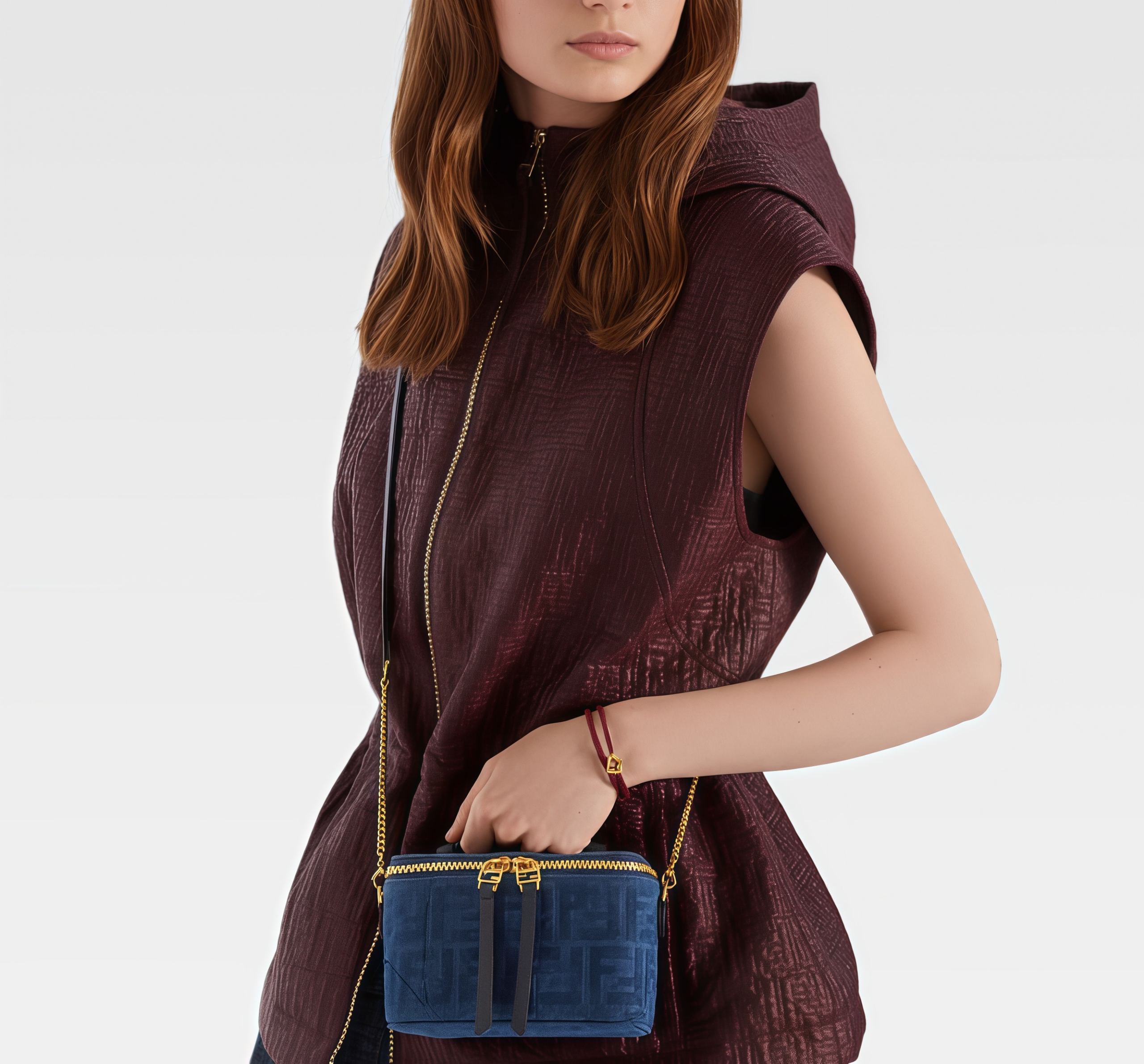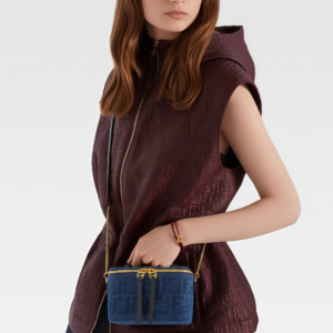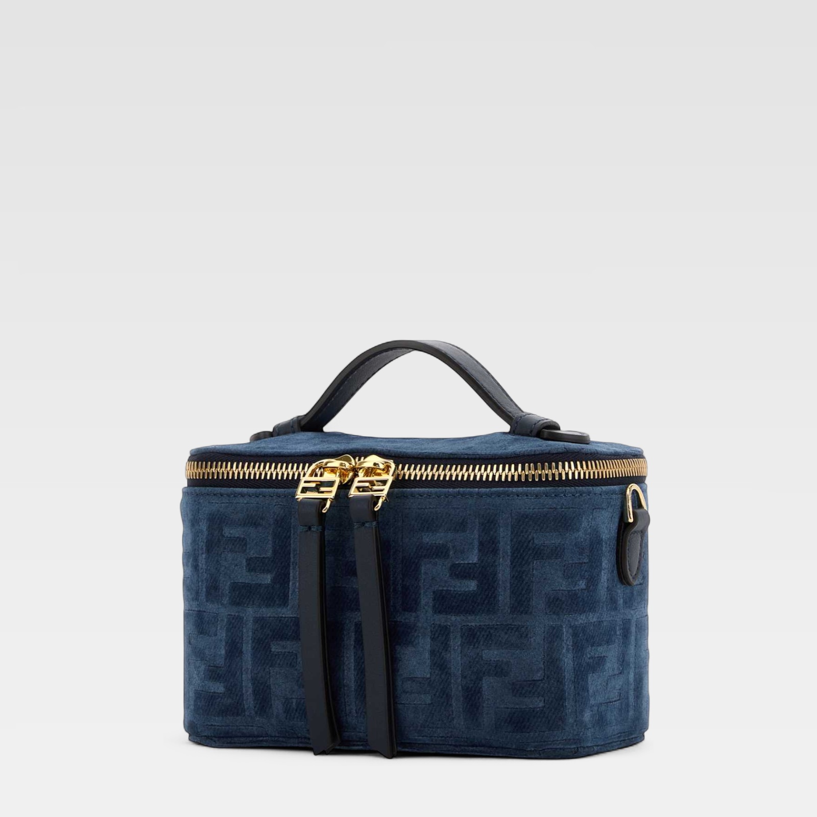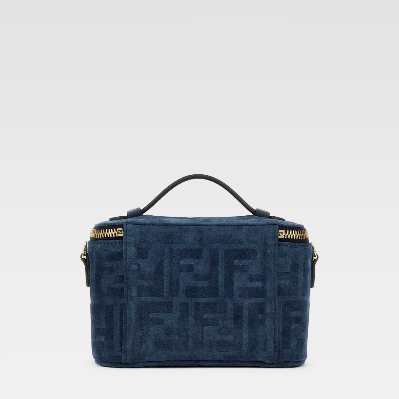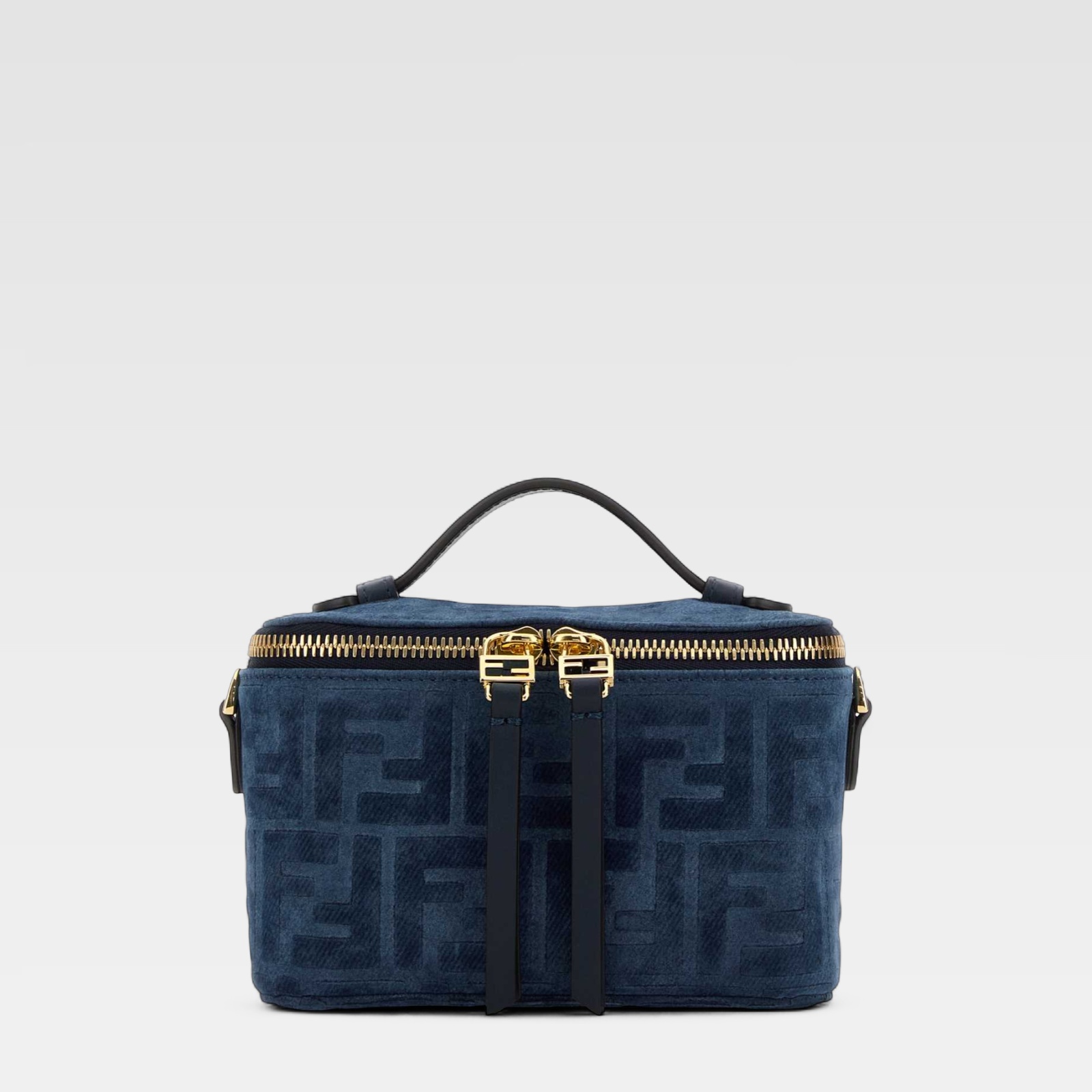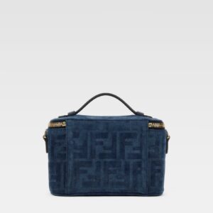 Bolso estructurado confeccionado en denim azul con el icónico monograma FF en relieve, cuenta con herrajes metálicos dorados y una cremallera doble en la parte superior. El diseño incluye una asa superior de piel para llevar en la mano y detalles de tiradores largos en piel, ofreciendo un estilo distintivo y funcional.