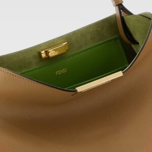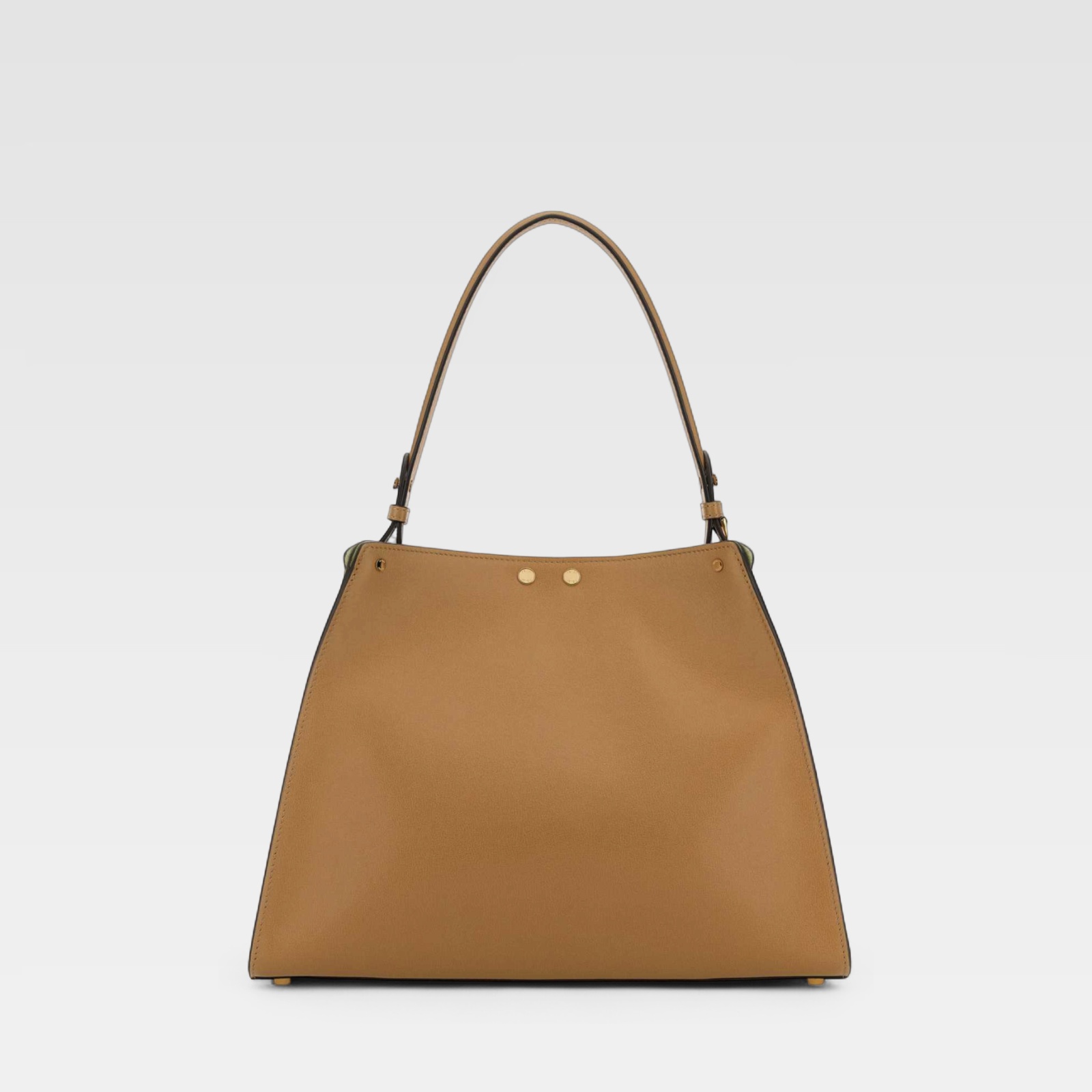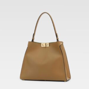 Bolso estructurado confeccionado en material marrón claro, con diseño minimalista y elegante. Presenta un asa superior rígida y herrajes metálicos dorados al frente, que aportan un toque sofisticado y moderno. Su silueta geométrica y líneas limpias lo hacen ideal para complementar cualquier atuendo.