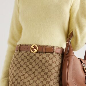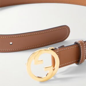 Un accesorio clásico con un acabado distintivo. El Blondie Belt de Gucci está elaborado en cuero marrón claro y decorado con costuras blancas visibles que realzan su diseño artesanal. La icónica hebilla redonda GG dorada aporta el sello inconfundible de la casa italiana. Ideal para marcar la cintura sobre vestidos, blazers o pantalones de tiro alto.