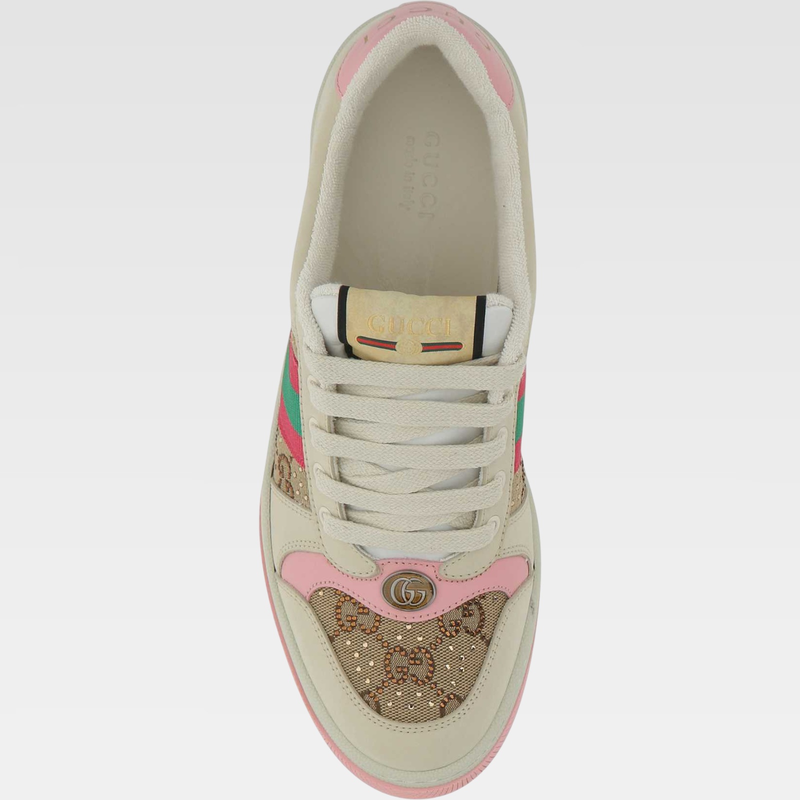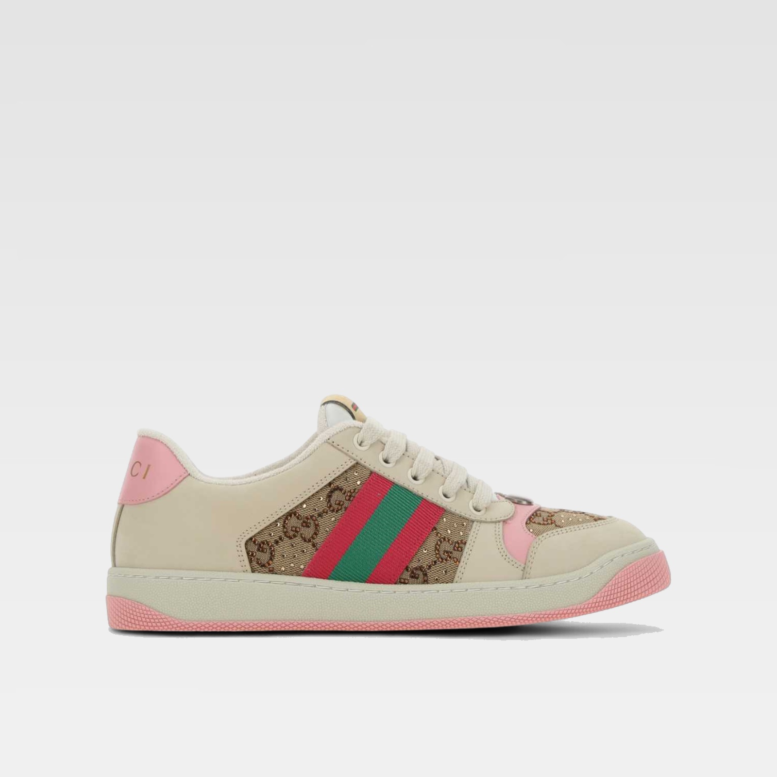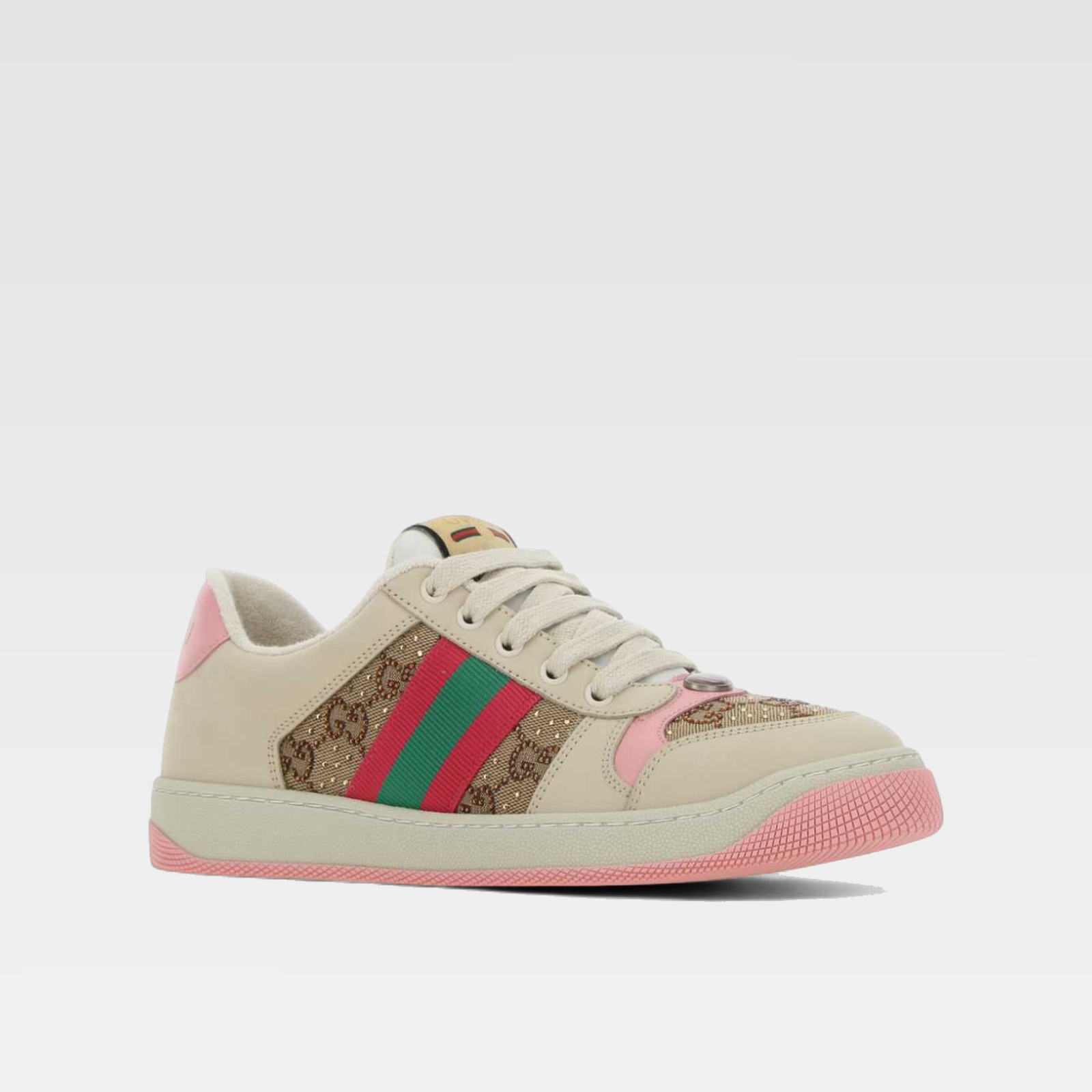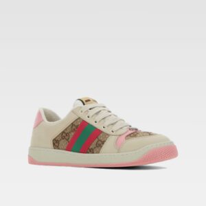 Este sneaker presenta una combinación de materiales con paneles de lona monograma en los laterales, ribetes en color claro y detalles contrastantes en rosa en el talón y la puntera. Decorado con las icónicas bandas laterales en verde y rojo, ofrece un look distintivo y contemporáneo que resalta la herencia de diseño de la casa. La suela de goma añade un toque deportivo ideal para el uso diario.