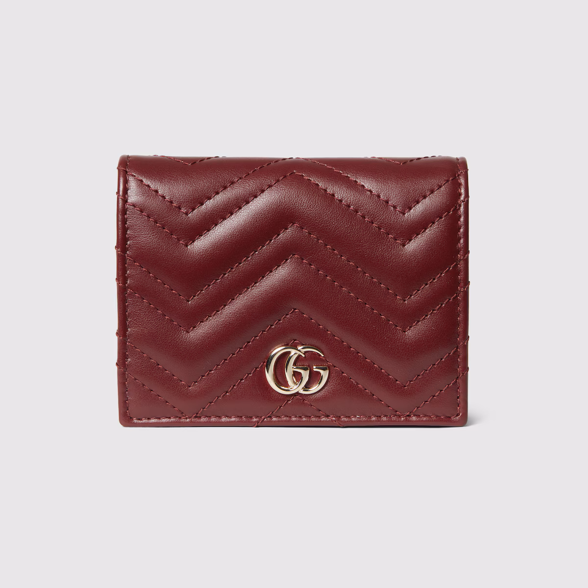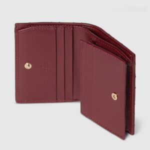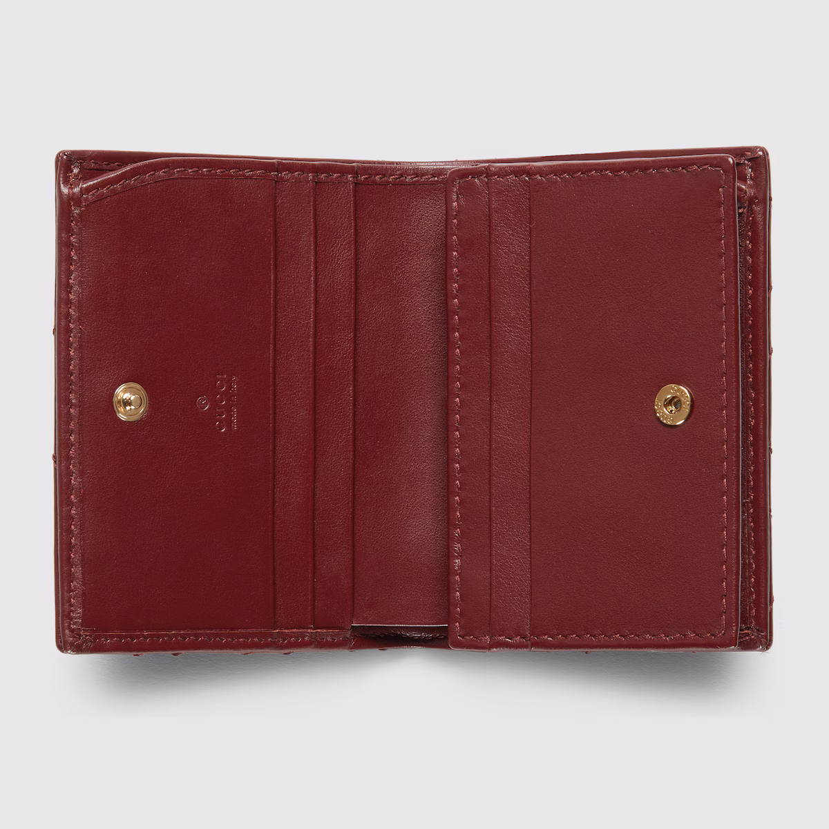 Un accesorio compacto y sofisticado que mantiene el estilo característico de Gucci. Esta billetera está confeccionada en cuero matelassé color burdeos, con costuras en patrón de chevrón que aportan textura y dinamismo. El logo GG en metal dorado envejecido resalta en la parte frontal, aportando un contraste elegante. Su interior ofrece organización práctica con espacio para billetes, tarjetas y monedas.