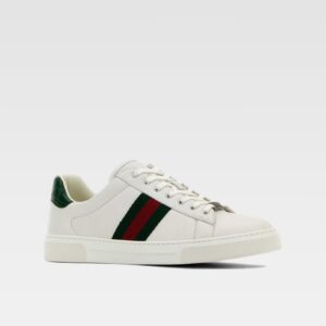 Sneaker de silueta clásica elaborado en cuero blanco, con un diseño de líneas limpias y detalles distintivos en el lateral mediante bandas textiles en verde y rojo. El talón incorpora un refuerzo en material verde texturizado que resalta la elegancia y modernidad del modelo, mientras la suela baja y el ajuste con agujetas completan su estilo contemporáneo.