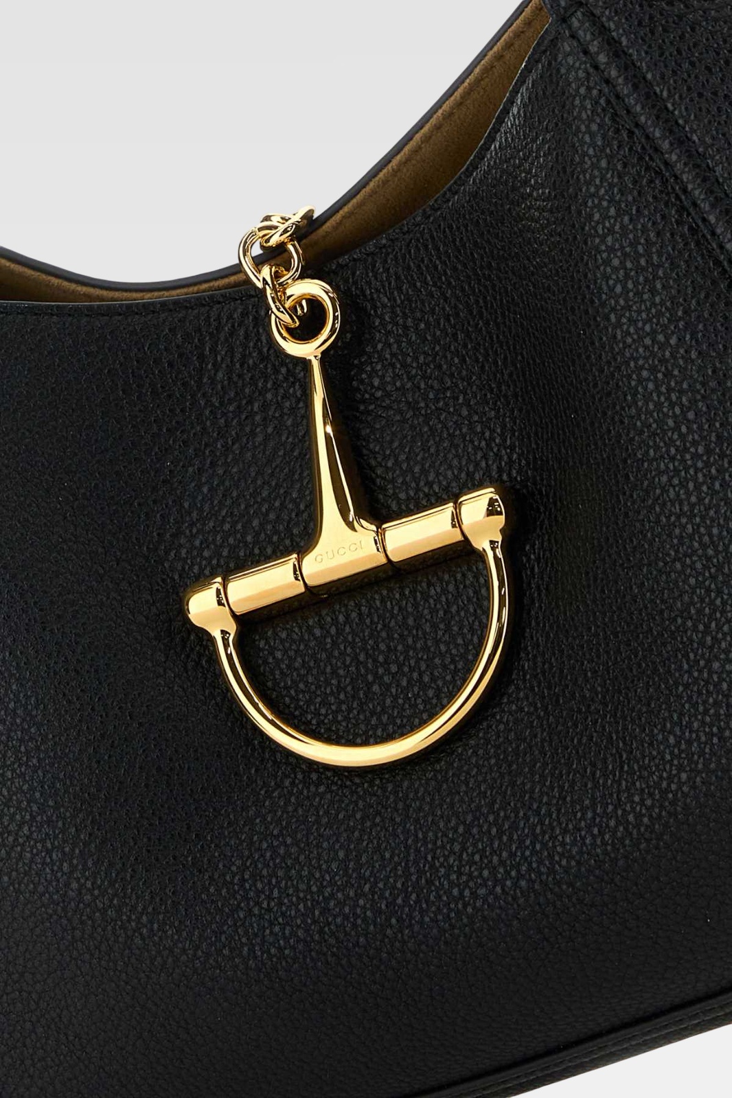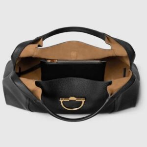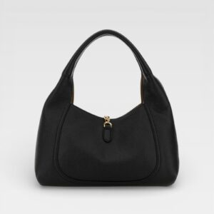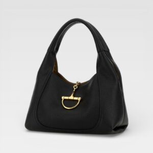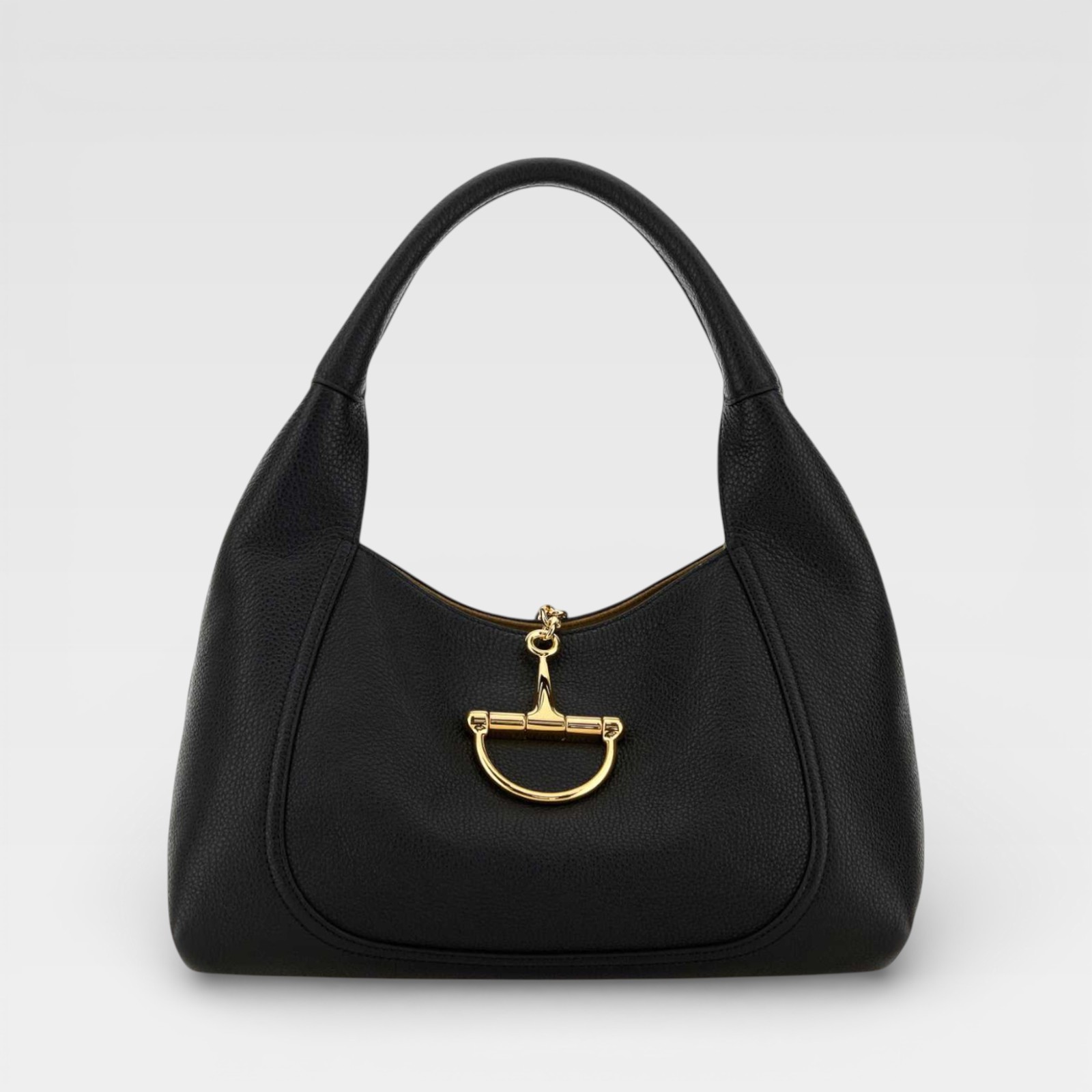 Bolso confeccionado en cuero negro con textura fina, de silueta estructurada y asa superior ancha. Presenta un elegante herraje dorado al frente que añade un toque distintivo al diseño. Ideal para llevar al hombro, combina practicidad y sofisticación en un accesorio versátil para el día a día.