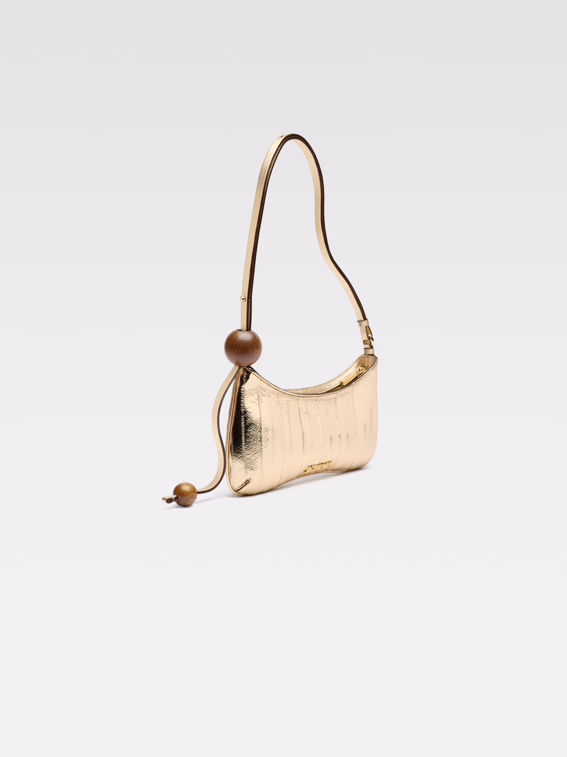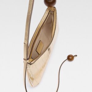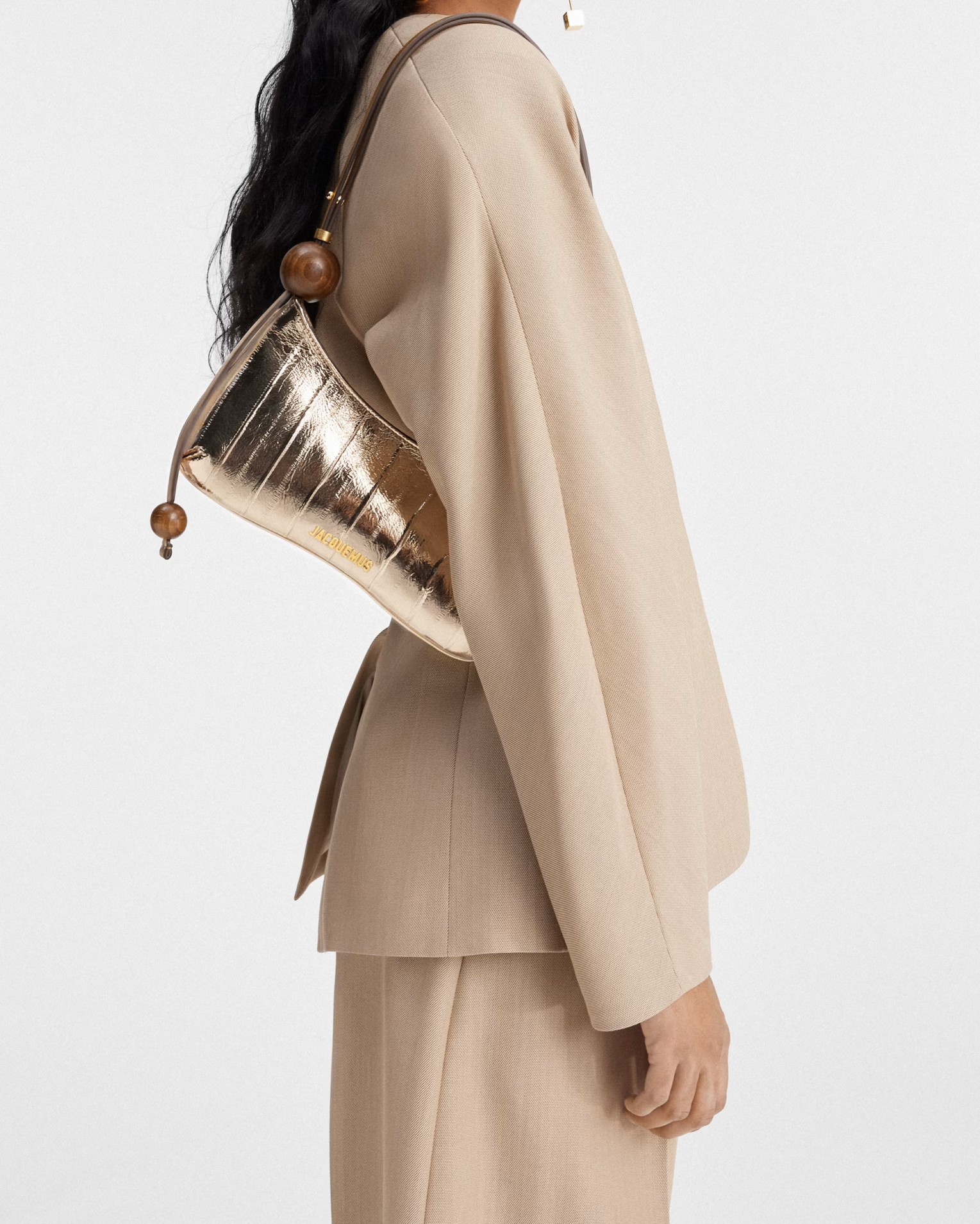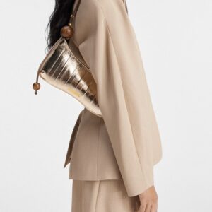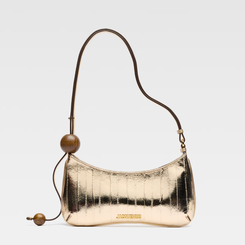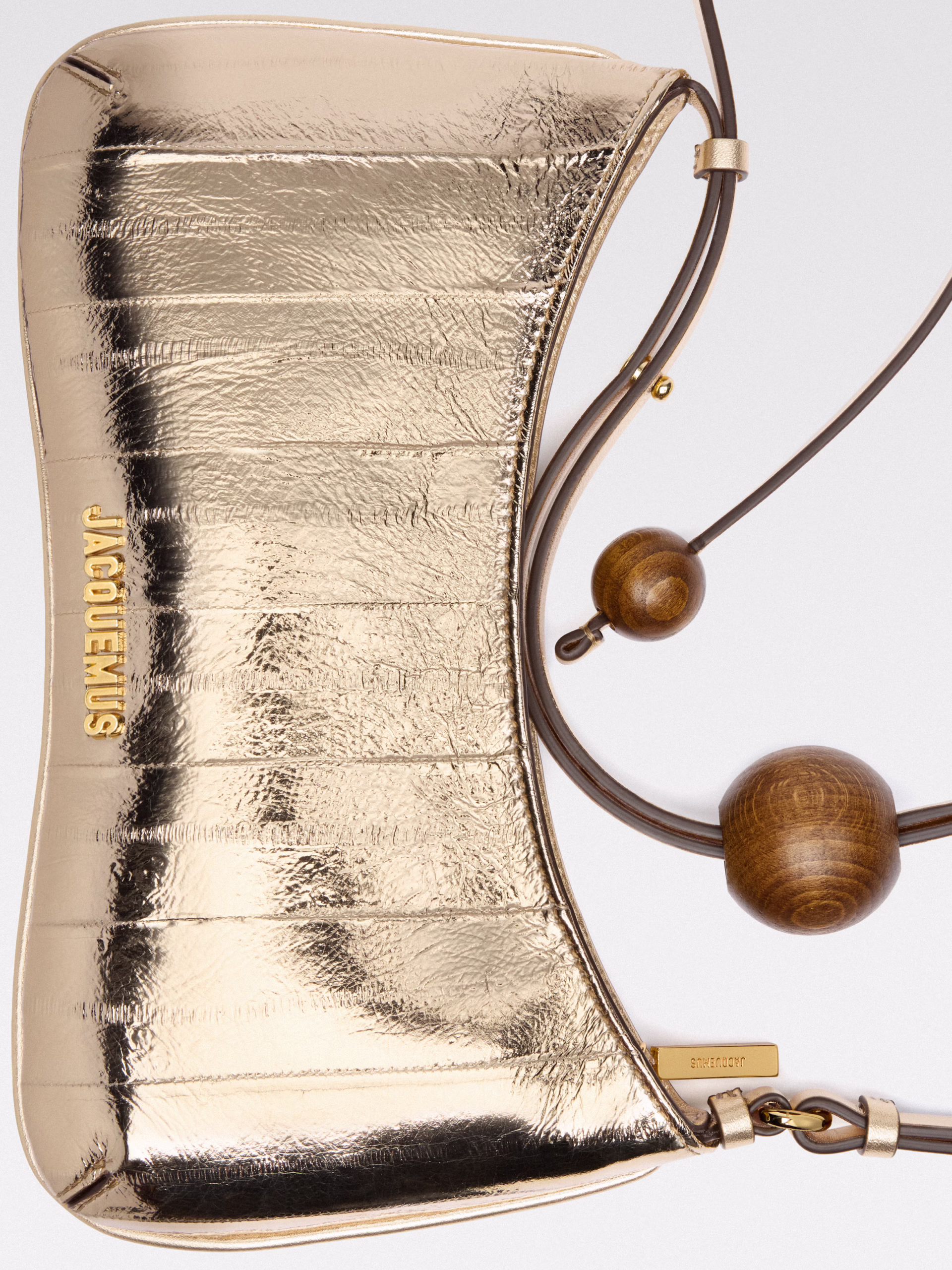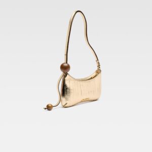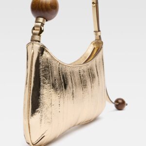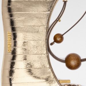 Diseño elegante con un giro inesperado: Le Bisou Perle de Jacquemus combina un acabado metálico dorado con detalles en madera que le dan un carácter distintivo. Su forma estructurada y curvada abraza la silueta del hombro con naturalidad, mientras que la correa ajustable con bolas de madera agrega un toque orgánico al diseño moderno.